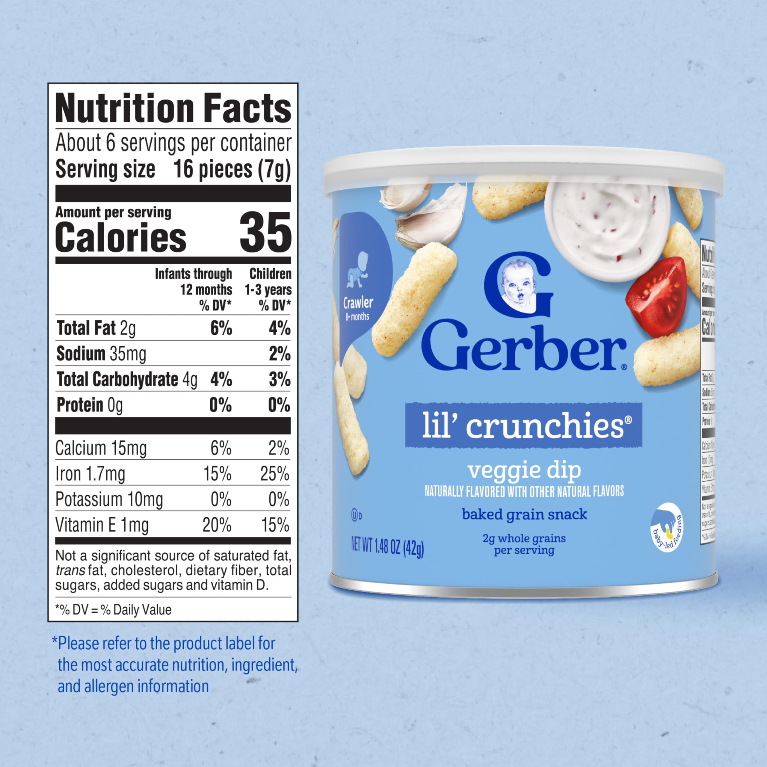 SMILES GUARANTEED BABY SNACKS: Gerber Lil' Crunchies Baby Veggie Dip snacks are thoughtfully crafted for busy parents who want to provide their little one with a nutritious on-the-go baby snack. Gerber snacks offer a practical solution for parents seeking both quality and convenience