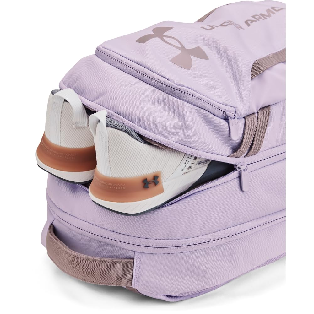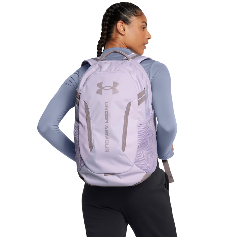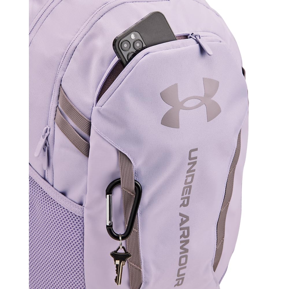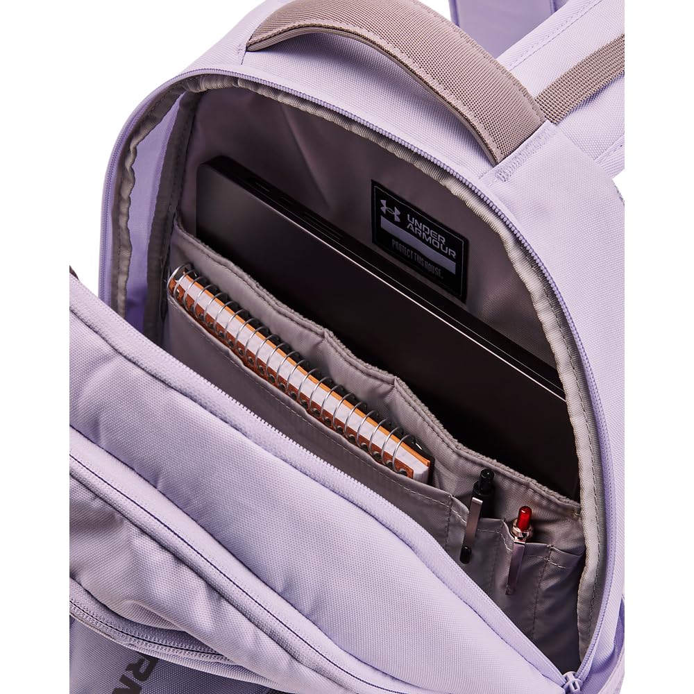 Description This backpack does it all. It's water-repellent for the rain, tough as nails, comfortable as anything, and has all the pockets you need to hold all your stuff. Water-resistant UA Storm technology keeps your stuff dry. Soft-to-the-touch top coat on material for added durability. Secondary compartment can be dual-purposed as a shoe/laundry pocket. Secure zip front pocket for essential item storage & side water bottle pocket that fits 32oz bottle. Soft-lined laptop sleeveโholds up to 16" MacBook Proยฎ or similarly sized laptop. Molle webbing for additional attachment points. Top grab handle. . . . 100% Polyester.
