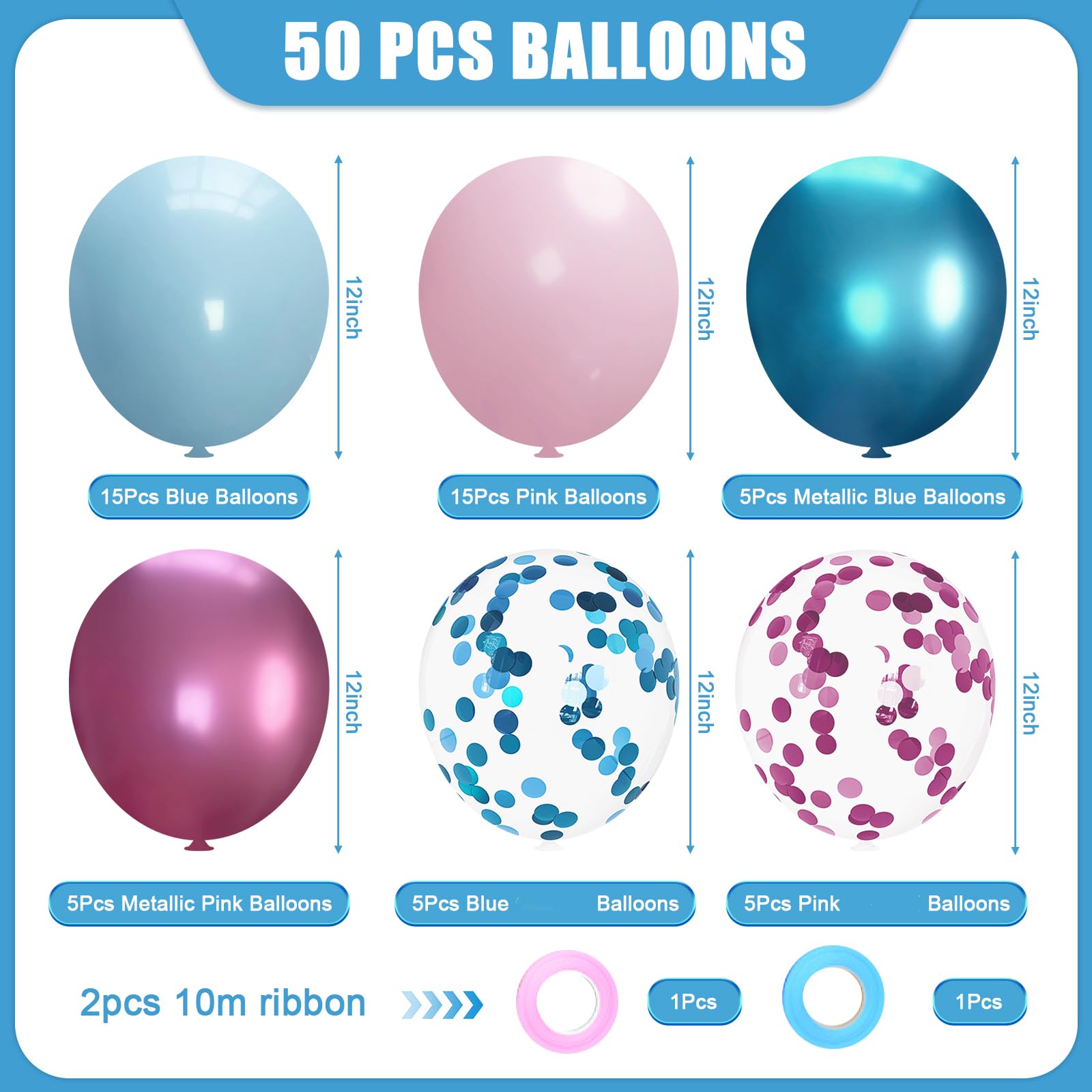 【You will get】:Pink blue balloons package include:15 pcs pink balloons,15 pcs blue balloons,5 pcs metallic pink balloons,5 pcs metallic blue balloons,5 pcs pink balloons,5 pcs blue balloons,1pcs pink ribbons and 1pcs blue ribbons. These pink blue balloons are a harmonious blend of elegance and vibrancy,casting a spell of wonder.Give you good memorable party experience.