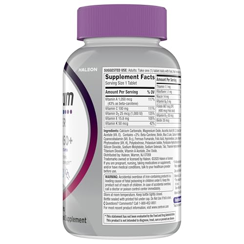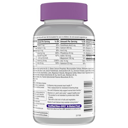 Centrum Silver Women's Multivitamin for Women 50 Plus brings you a tailored multivitamin/multimineral supplement that contains micronutrients to help support full body wellness (1). This women's vitamin with iron contains essential nutrients, including vitamin D and calcium to support strong bones and B Vitamins to help promote heart health (1, 2). This multivitamin for women over 50 also contains zinc and B Vitamins to help support normal brain function and Vitamins A, C, and E for eye health (1, 2). Key micronutrients in these multivitamins with zinc supplements help fill in nutritional gaps to promote overall wellness and vitality (1). These women's vitamins are verified Non-GMO (3) and gluten free. This women's multivitamin with iron features a smooth coating that makes it easy to swallow. Simply take one multivitamin daily to provide your body with essential vitamins and minerals. Centrum Silver is the number 1 Doctor recommended multivitamin brand now shown to support memory and cognition in older adults (1).* * IQVIA: Claim substantiation Validation Statement. July 2023. IQVIA, using the ProVoice Survey, recorded the product recommended most often within the Adult Multivitamins category by physicians and pharmacists in the United States. A statistically significant majority of the panel of physicians and pharmacists responded that Centrum is the product they endorse most.(1) These statements have not been evaluated by the Food and Drug Administration. This product is not intended to diagnose, treat, cure or prevent any disease.(2) Not a replacement for cholesterol-lowering drugs (1) (3) Read more about our Non-GMO standard on Centrum's official website. ^Haleon does not Sell or Promote GLP-1s. Consult with HCP on GLP-1 and Centrum use. Use as directed.