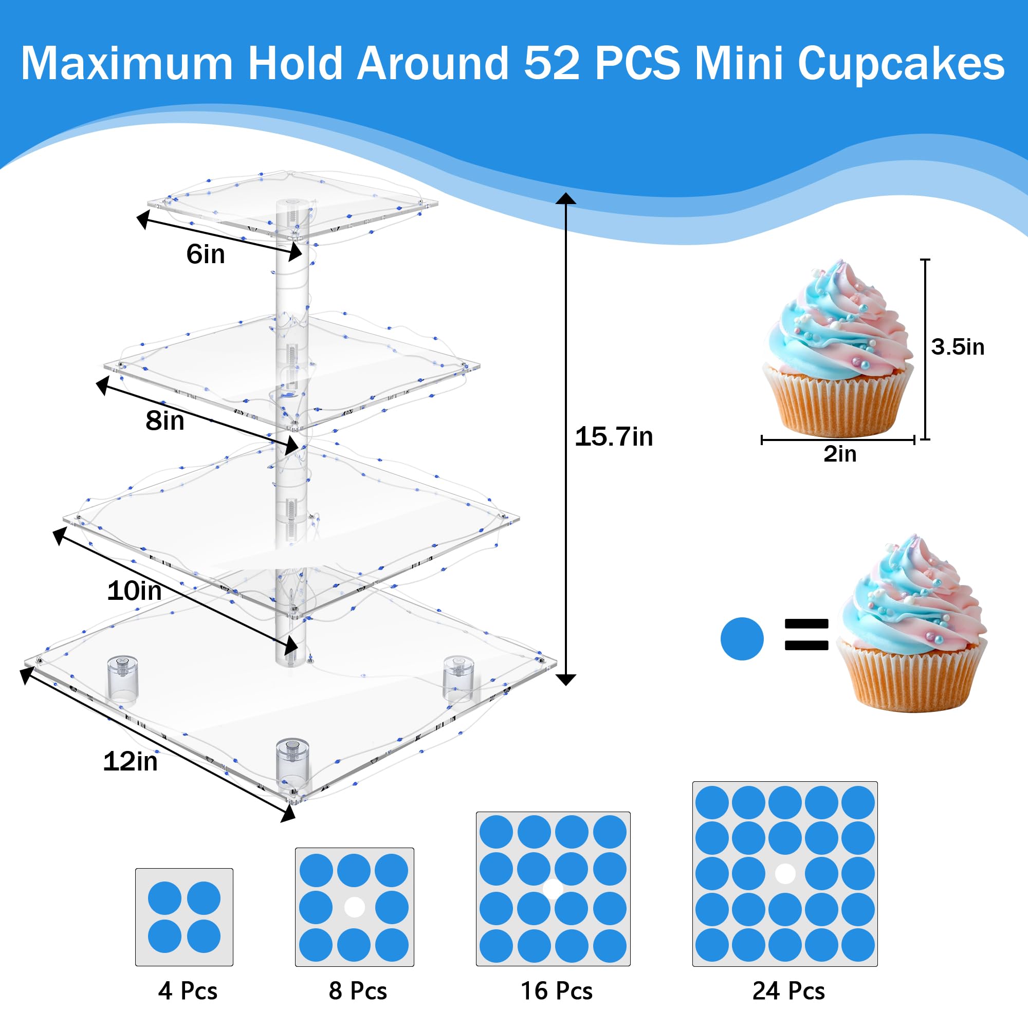 IMPRESSIVE DETAILS: The acrylic rods of the cupcake tower display have embedded cupper nut in the middle in order to keep the stand straight and stable. The cupcakes stand is extra large and can hold up to 52 cupcakes of 2.5” diameter or the equivalent of 12 lb. of food.