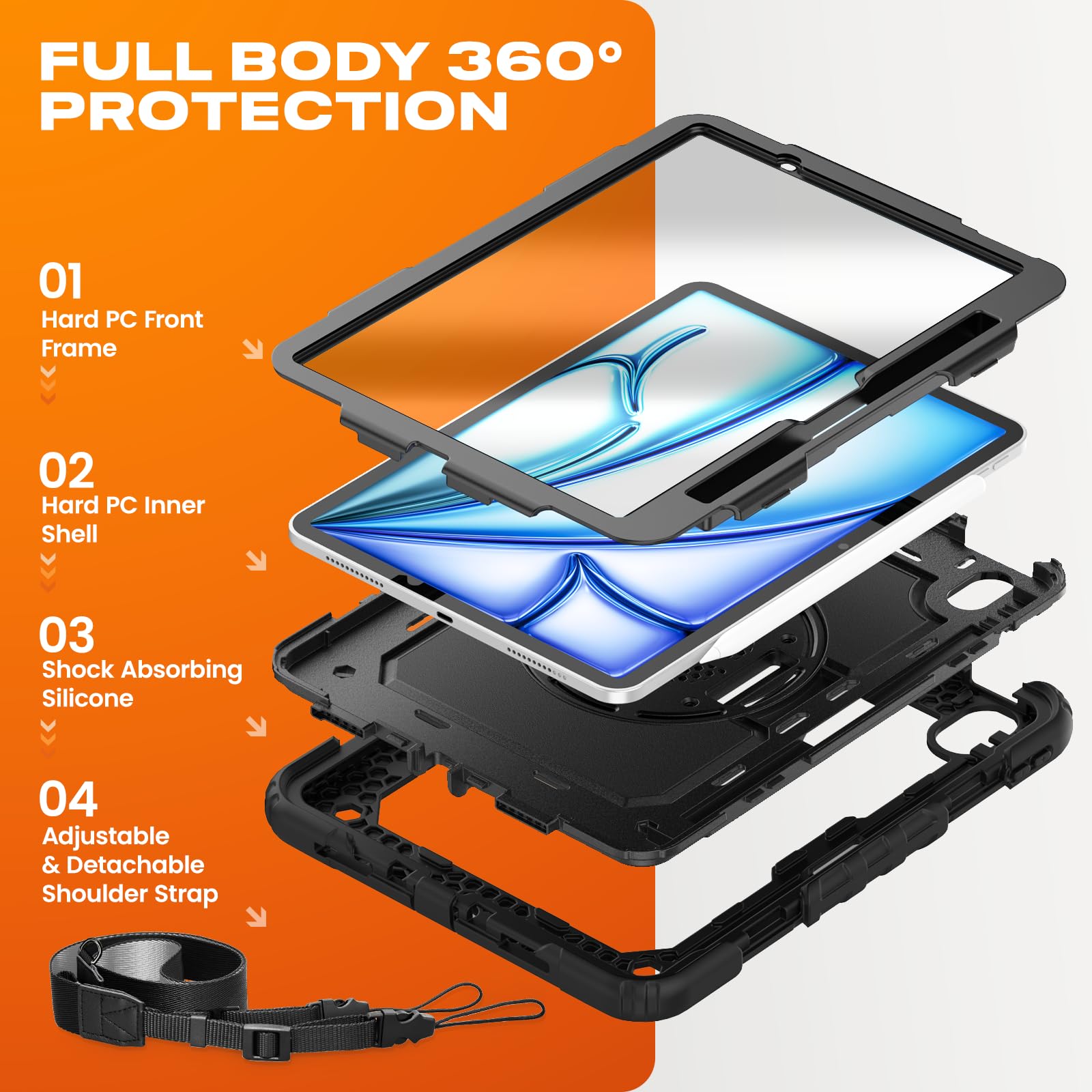 [Adjustable Hand & Shoulder Strap] Hold device comfortably one-handed with soft hand strap for presentations, navigation, document scanning; Adjustable,Detachable shoulder strap for a wide-range of users, carry your device by side and hands-free at all times, case for iPad Air 11 inch M4 M3 M2 suited for business/travel