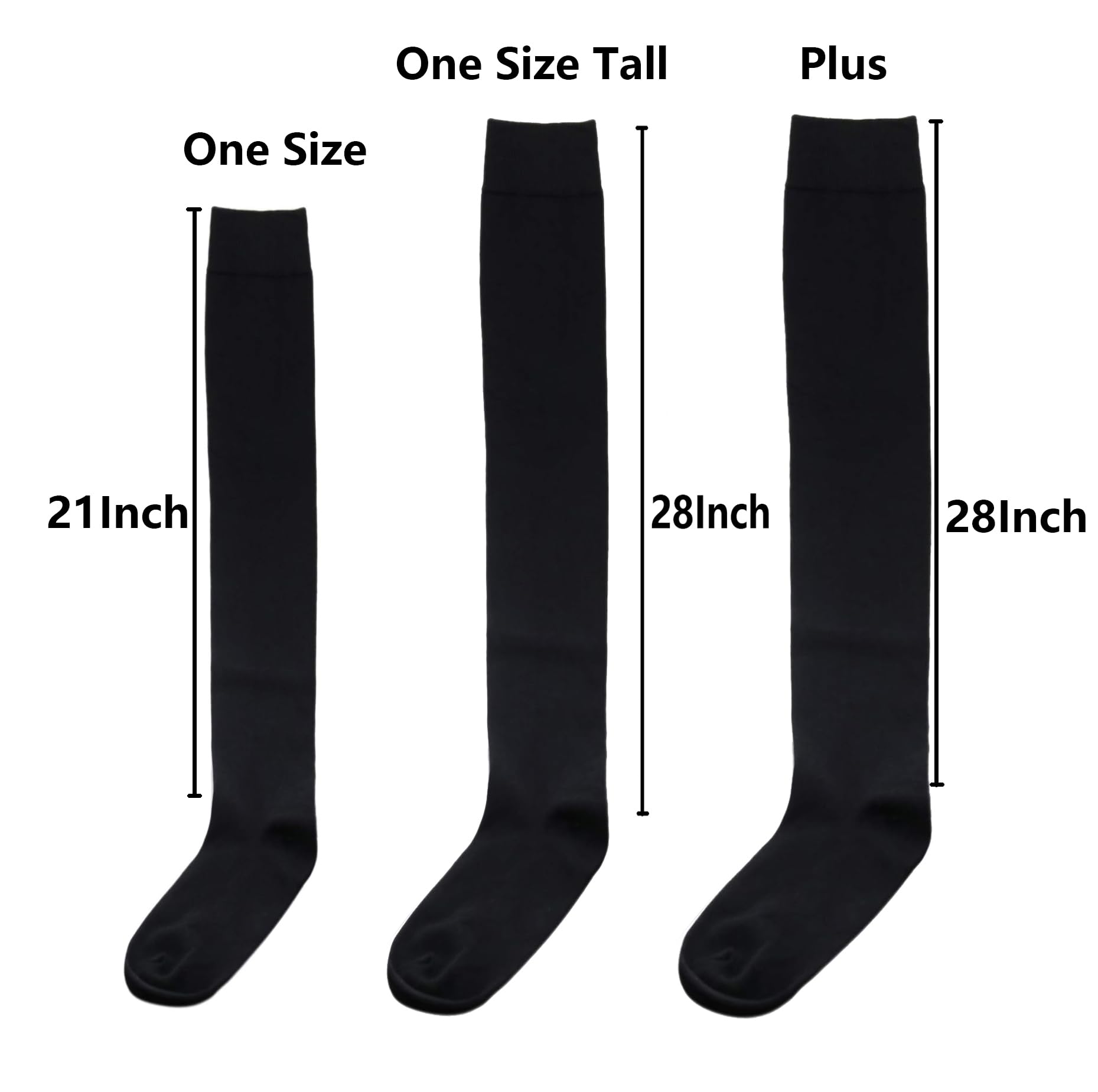 3 Size: One size: the length from the top to the heel is about 21 Inches/53 cm, maximum thigh circumference is about 21in, Recommended for heights 5.0 - 5.7ft. One size tall: the length from the top to the heel is about 28 Inches/72 cm, maximum thigh circumference is 23in, Recommended for tall heights 5.4 - 5.9ft. One size plus tall: the length from the top to the heel is about 28 Inches/72 cm, maximum thigh circumference is about 25in, Recommended for heights 5.5 - 6ft