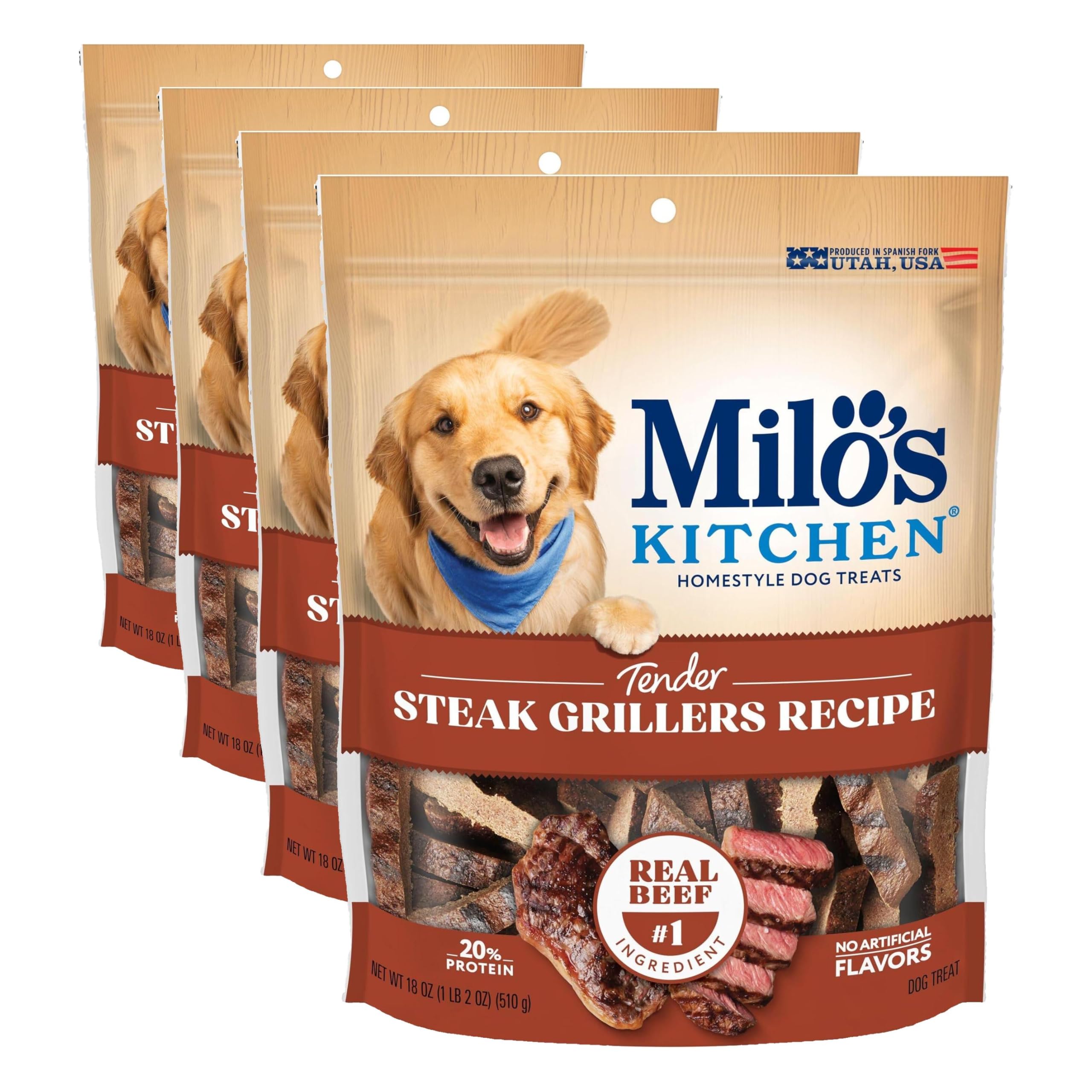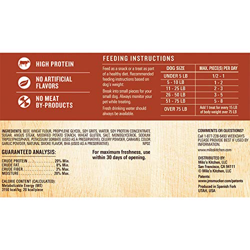 Contains one (1) 18-oz. bag of Milo’s Kitchen Steak Grillers Recipe dog treats