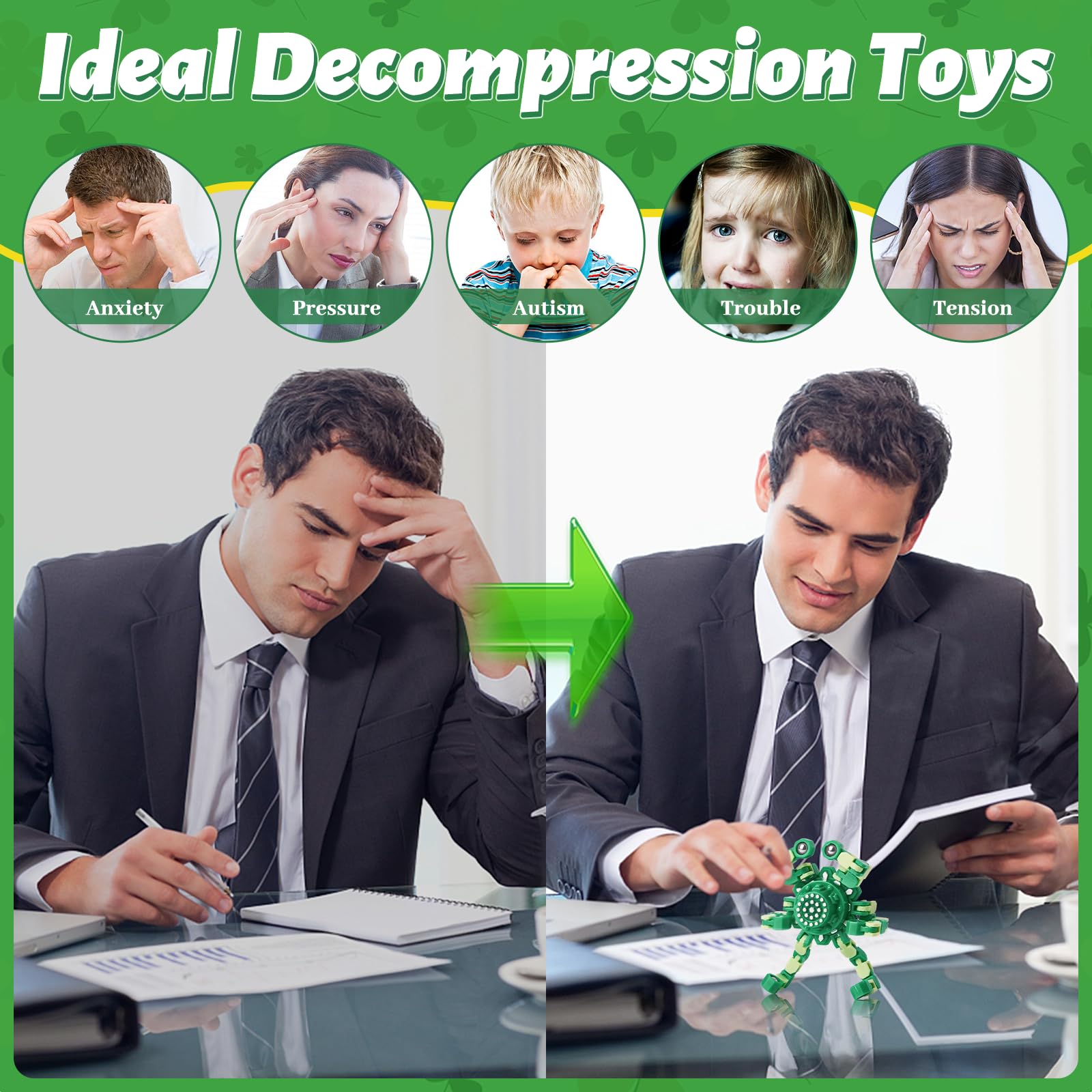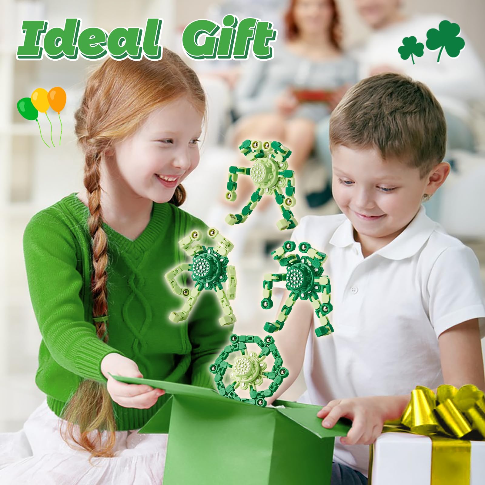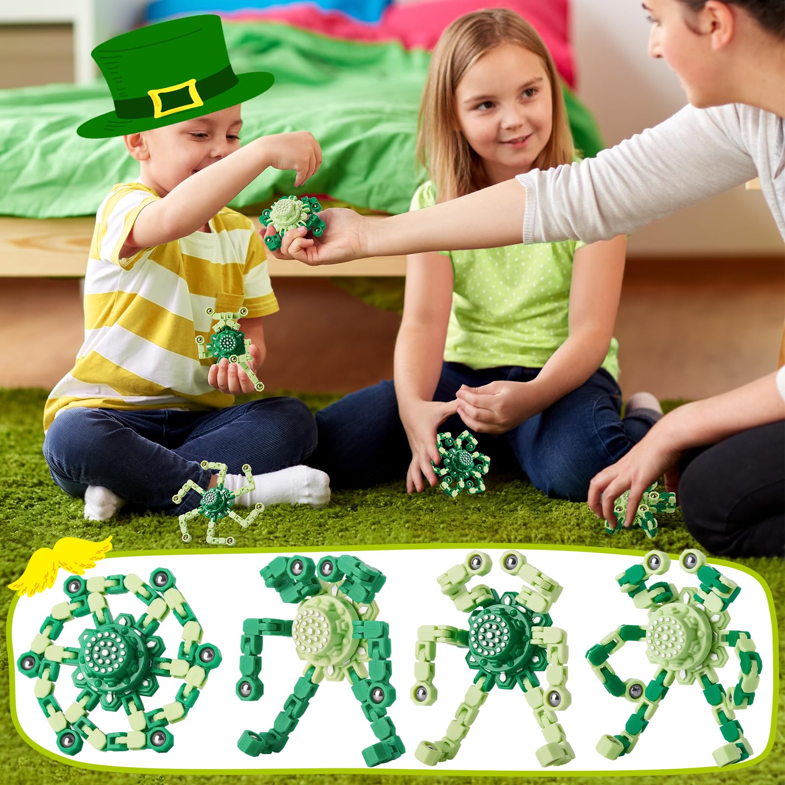 【Unique St. Patrick's Day Design】This set includes four finger spinners in vibrant colors—Irish green, gold, white, and purple. Each spinner features six deformable chains adorned with classic St. Patrick's Day motifs like shamrocks and lucky charms. Create various shapes such as different spinner forms, robots, or even a phone holder, perfectly matching the St. Patrick's Day spirit.