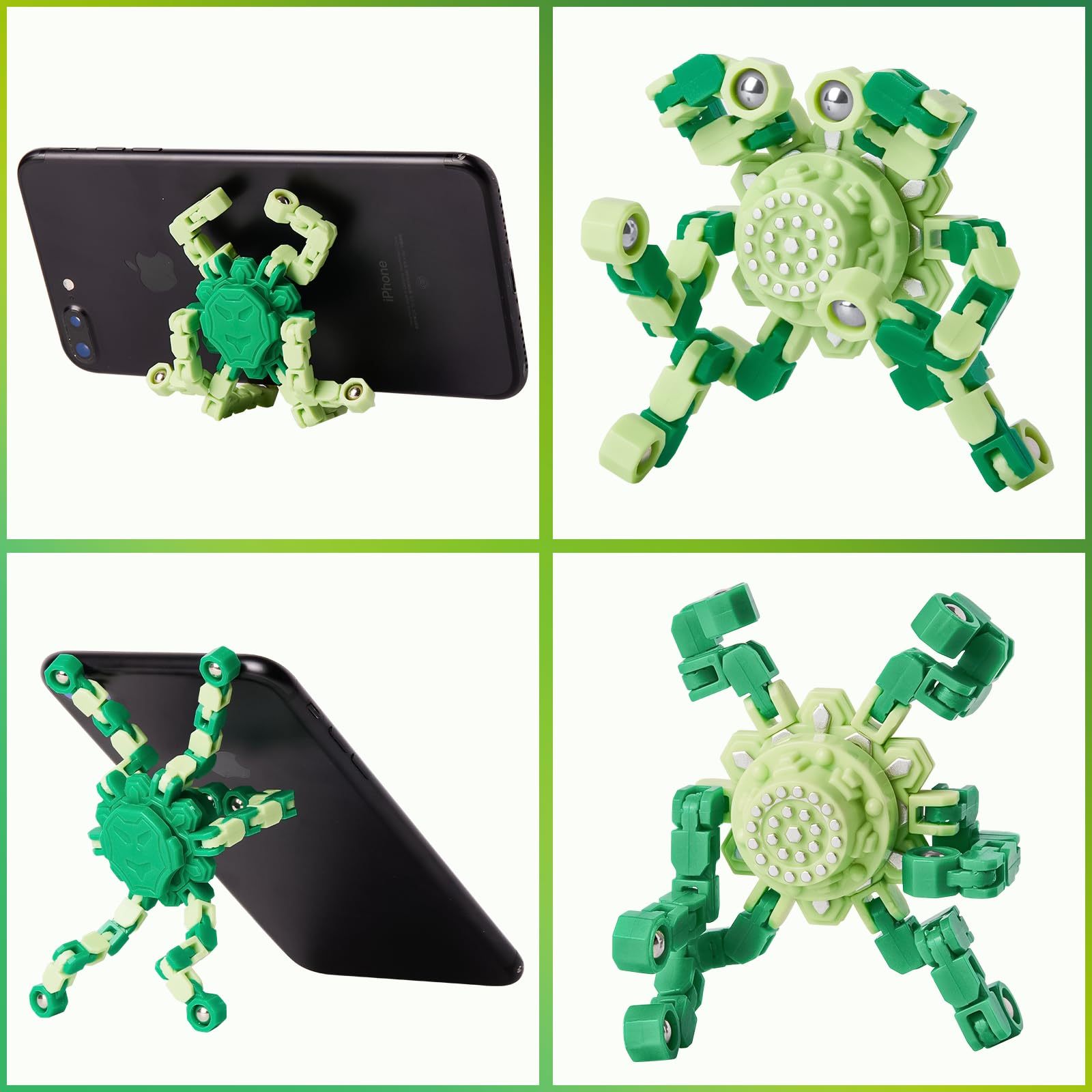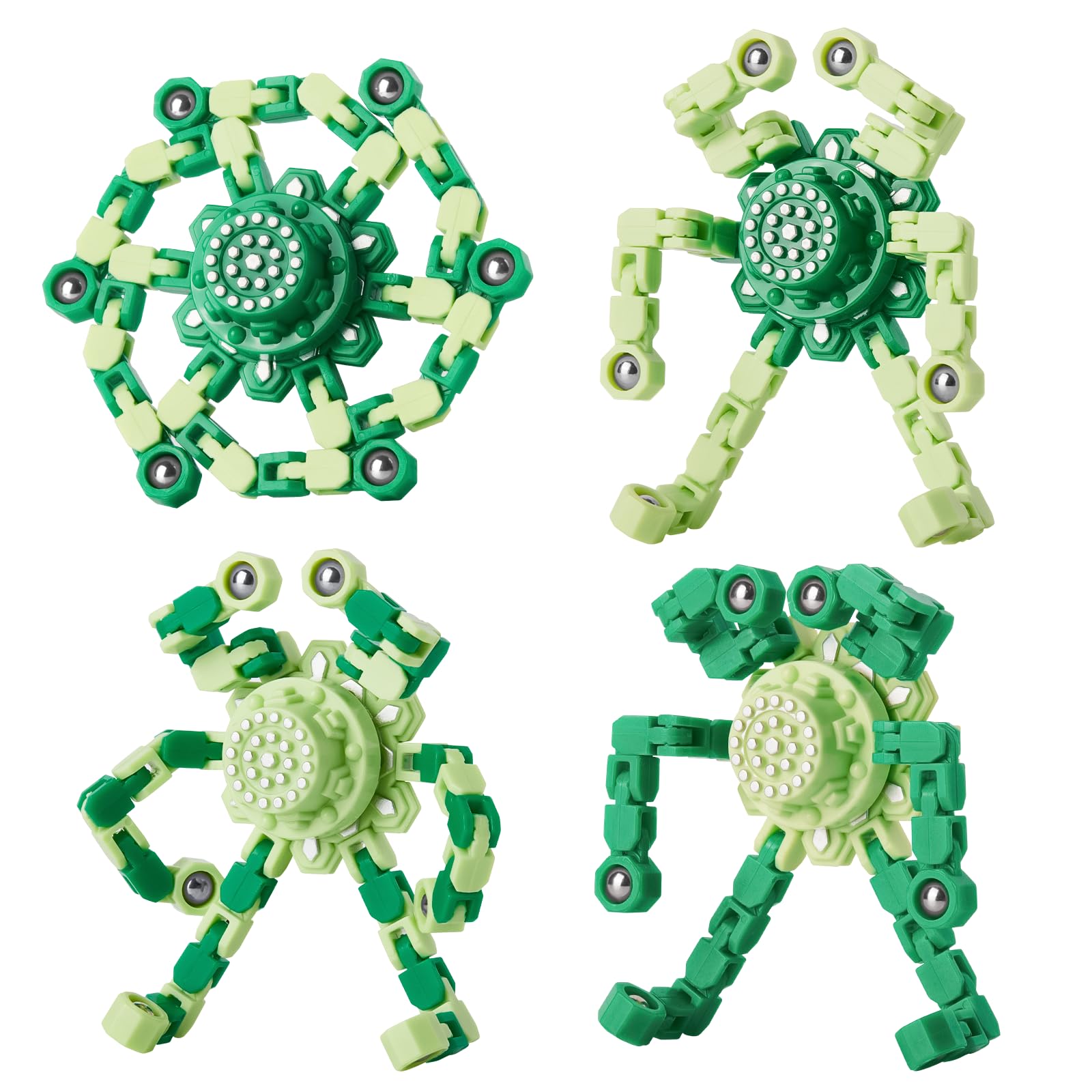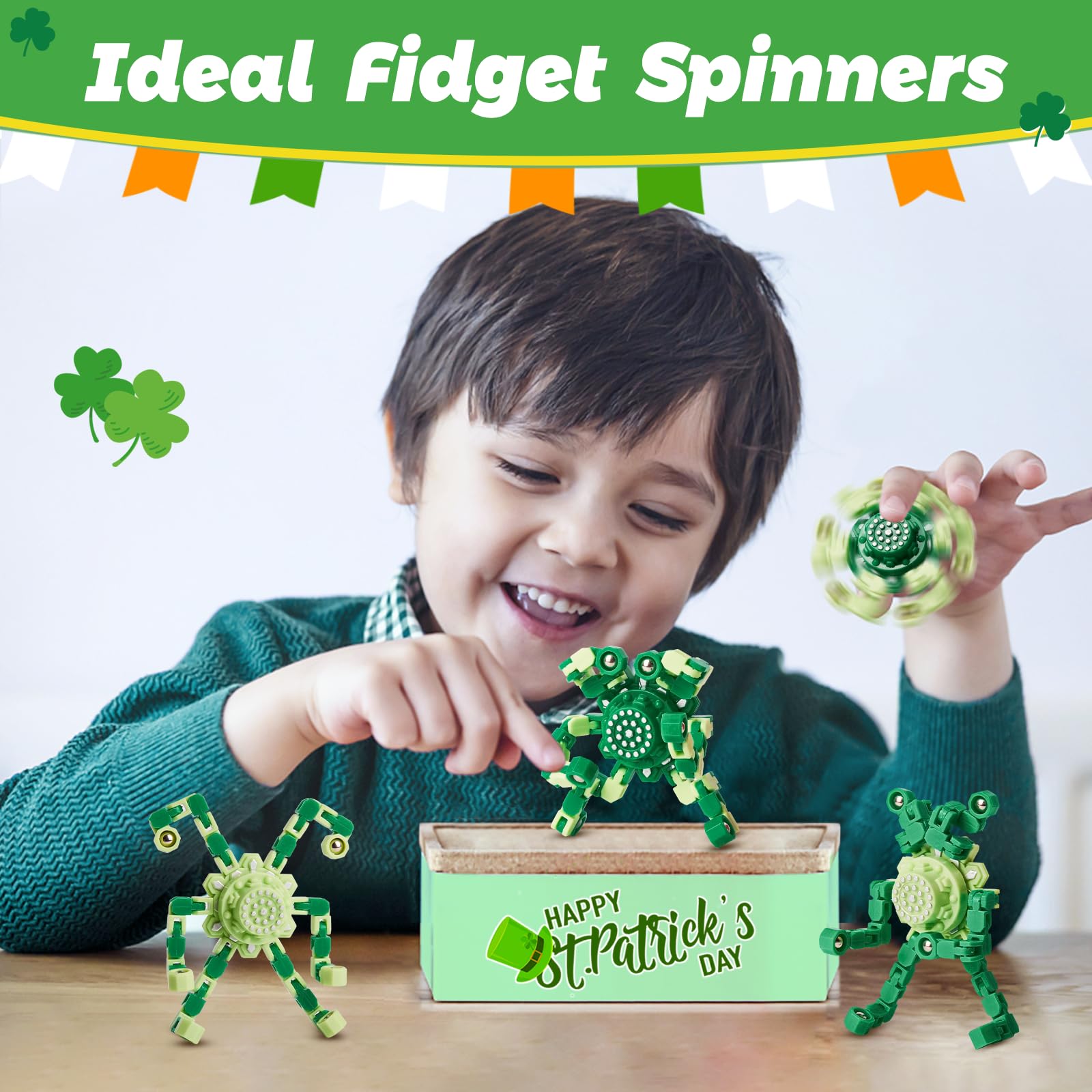 【Unique St. Patrick's Day Design】This set includes four finger spinners in vibrant colors—Irish green, gold, white, and purple. Each spinner features six deformable chains adorned with classic St. Patrick's Day motifs like shamrocks and lucky charms. Create various shapes such as different spinner forms, robots, or even a phone holder, perfectly matching the St. Patrick's Day spirit.