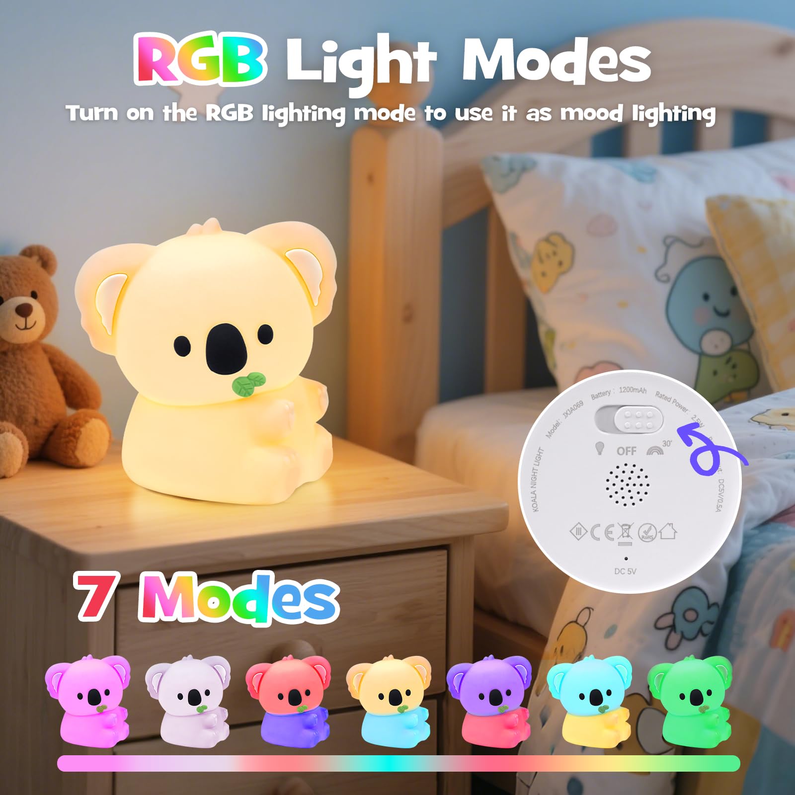 Vibrant RGB Color Modes – Turn on the RGB light mode button, you could switch 7 color modes by patting koala's body to set the perfect mood. Gefaxi colorful RGB night light is ideal for creating a soothing atmosphere at home or in any dorm room. Under the warm light mode, there are 3 adjustable brightness levels let you dial up the glow for bedtime reading, breastfeeding or mellow it out for a relaxing evening.