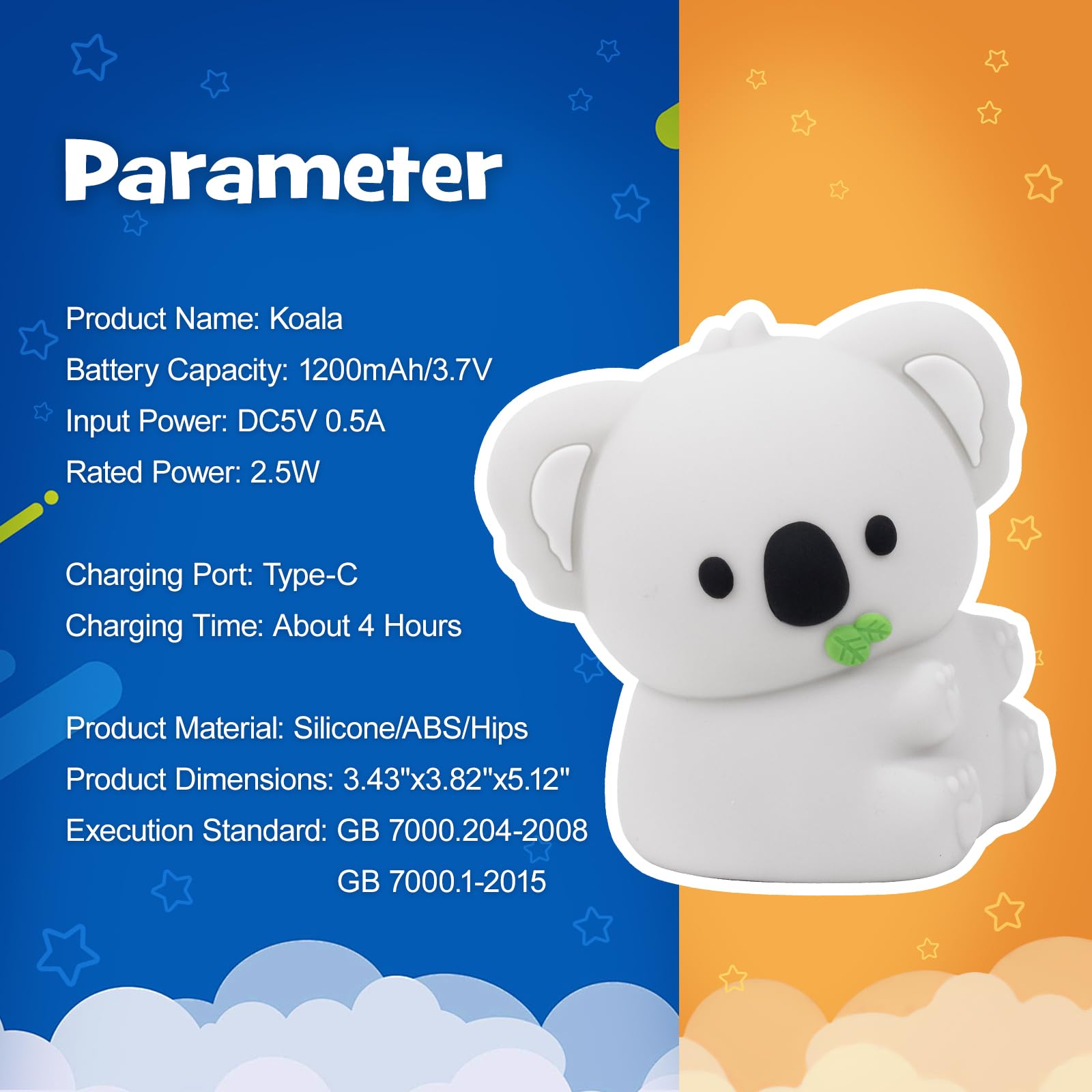 Light up your world with the joyful charm of this adorable cuddly koala night light. Its cute squishy silicone design adds a playful touch to any room while providing soft, ambient illumination. Thanks to built-in RGB LED lights, you could enjoy 7 color lighting modes, is perfect for mood lighting. A pat or squeeze instantly awakens your koala friend with a gentle glow, and another pat switches through colors or brightness. With timer function, this koala lamp will automatically turn off after 30 minutes. Hidden inside is a rechargeable battery, so you could place this cordless koala anywhere – desk, bedside, bookshelf, bathroom cabinet etc. Looking for the unique gifts? Surprise a friend or treat yourself with a nightlight that adds smiles, color, and warmth to bedtime routines. More than just a light, it doubles as a charming decor accent. Imagine this cuddly koala brightening up a desk, shelf, or dorm room corner – it’s sure to spark conversations and compliments. Product Name: Gefaxi Cuddly Koala Night Light Battery Capacity: 1200mAh/3.7V Input Power: DC5V 0.5A Charging Port: Type-C Rated Power: 2.5W Charging Time: About 4 Hours Product Material: Silicone/ABS/Hips Product Dimensions: 3.43"x3.82"x5.12" Applicable Places: Home, Bedroom, Nursery, Living Room, Study Room, Entryway, Hallway