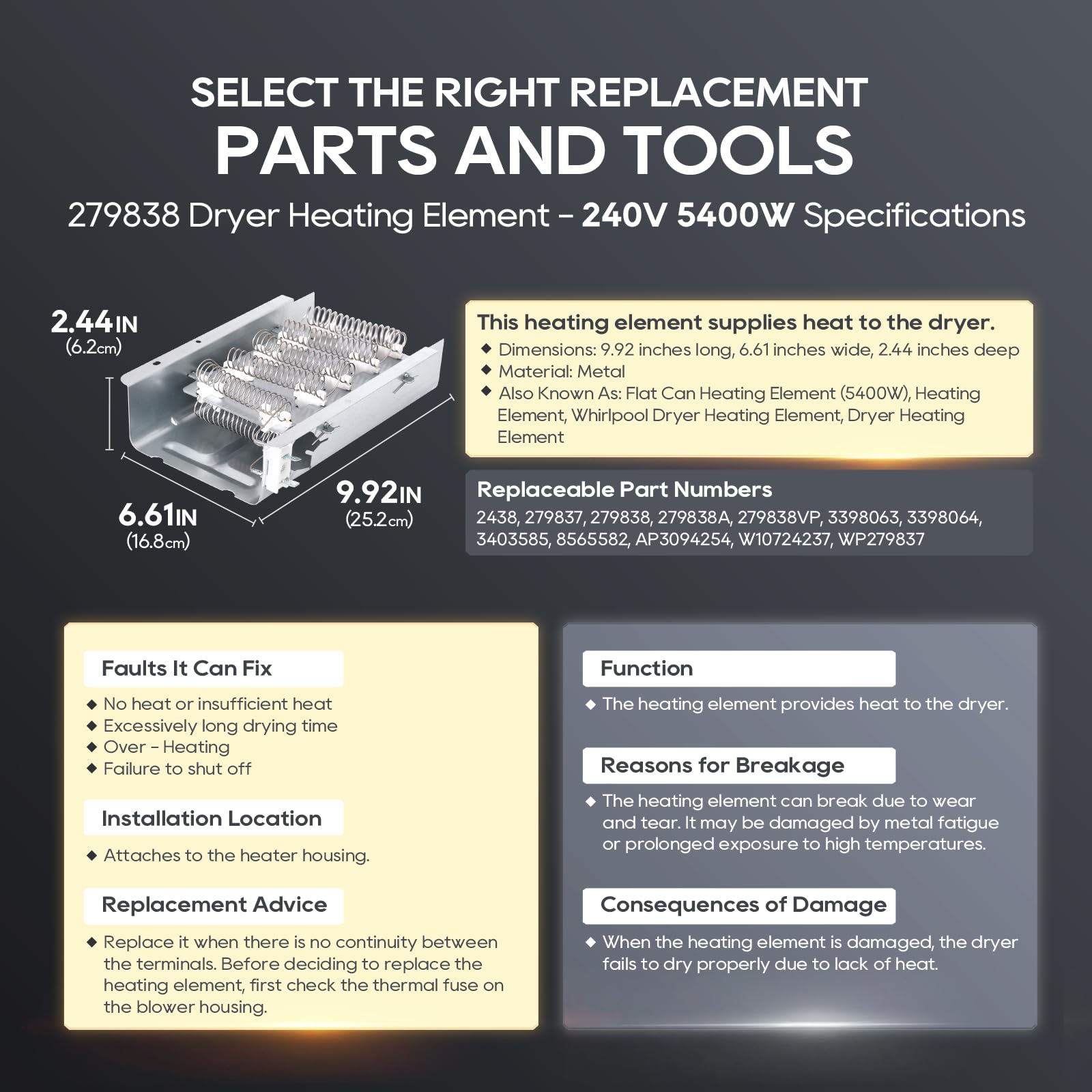 Hassle-Free Installation: Fix dryer heating issues with ease using our 279838 kit, which includes all necessary parts. Just grab a 1/4 - inch and 5/16 - inch screwdriver. Even without repair experience, you can finish the job in under 30 minutes. Note: Before installing the product, please disconnect the power supply and wear work gloves to protect your hands