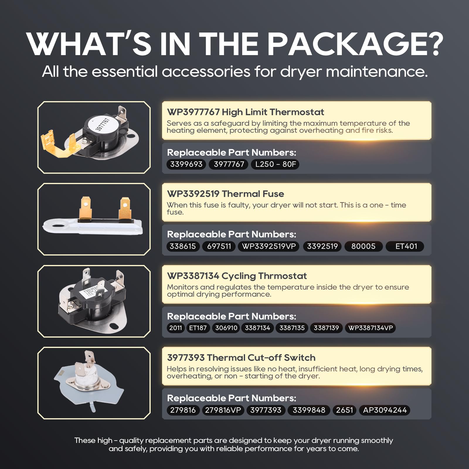 All-In-One Repair Kit: TOPDC offers a comprehensive 5 - piece dryer repair kit. This set includes a 279838 dryer heating element, a 3977767 dryer thermostat, a 3387134 dryer high - limit thermostat, a 3392519 dryer thermal fuse, and a 3977393 Dryer Thermal Cut - off Kit. You can easily fix common dryer problems such as no heat or not enough heat, takes too long to dry clothes, shuts off too soon, and timer not advancing