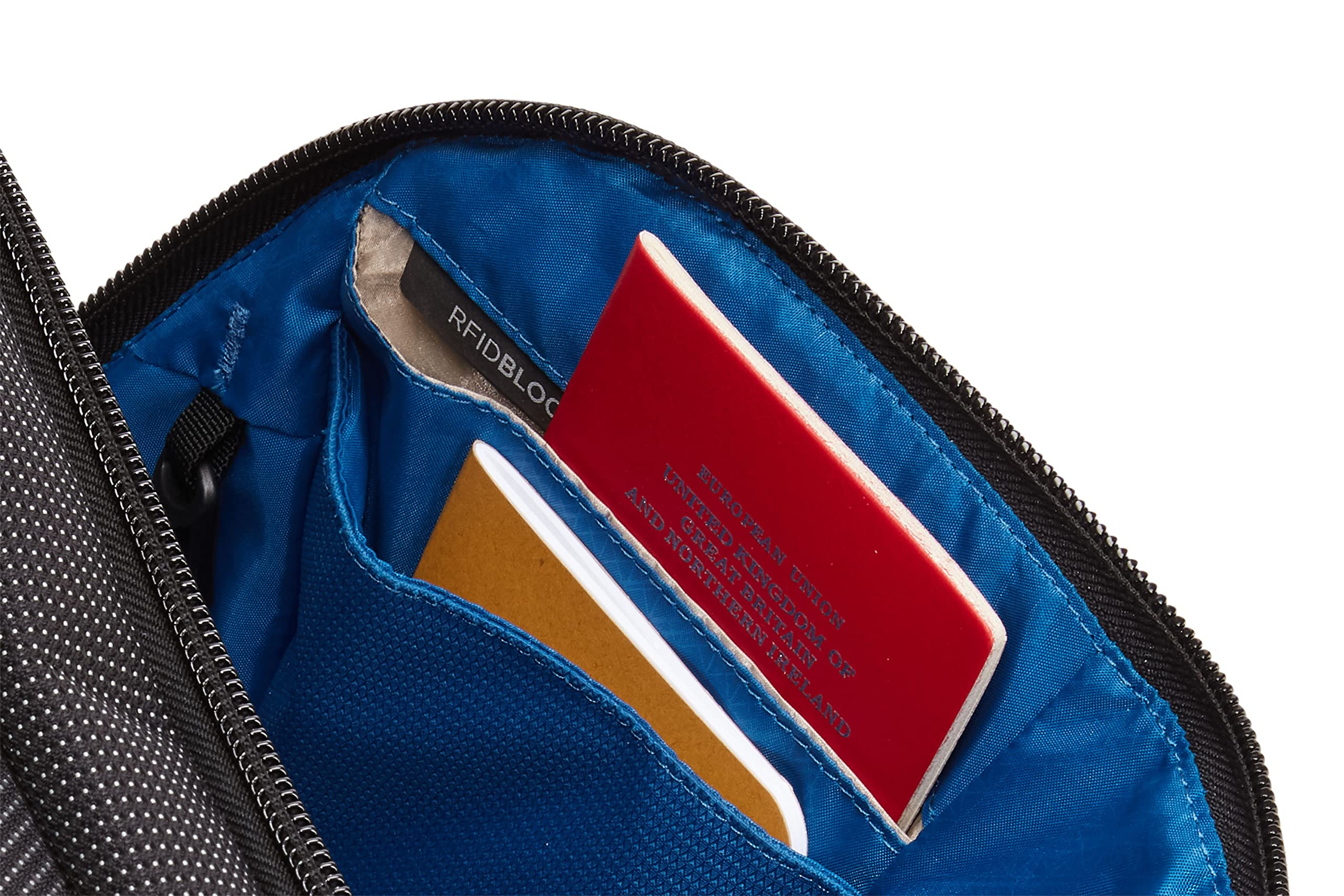 Organize small electronics and accessories in the front panel with slip pockets, elastic loops, a zippered mesh pocket and PowerPocket cord management system for charging on the go