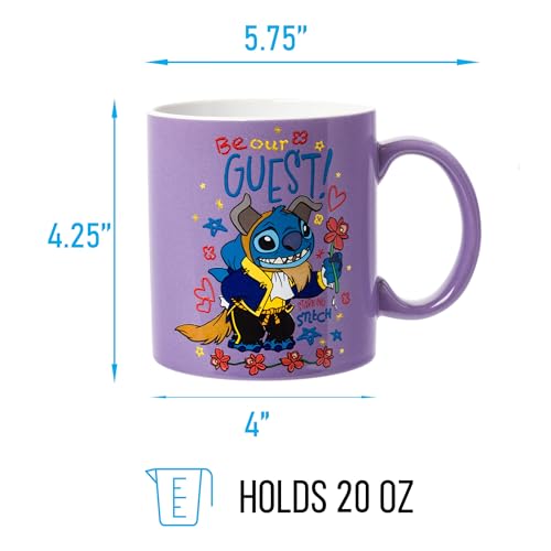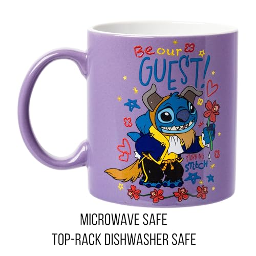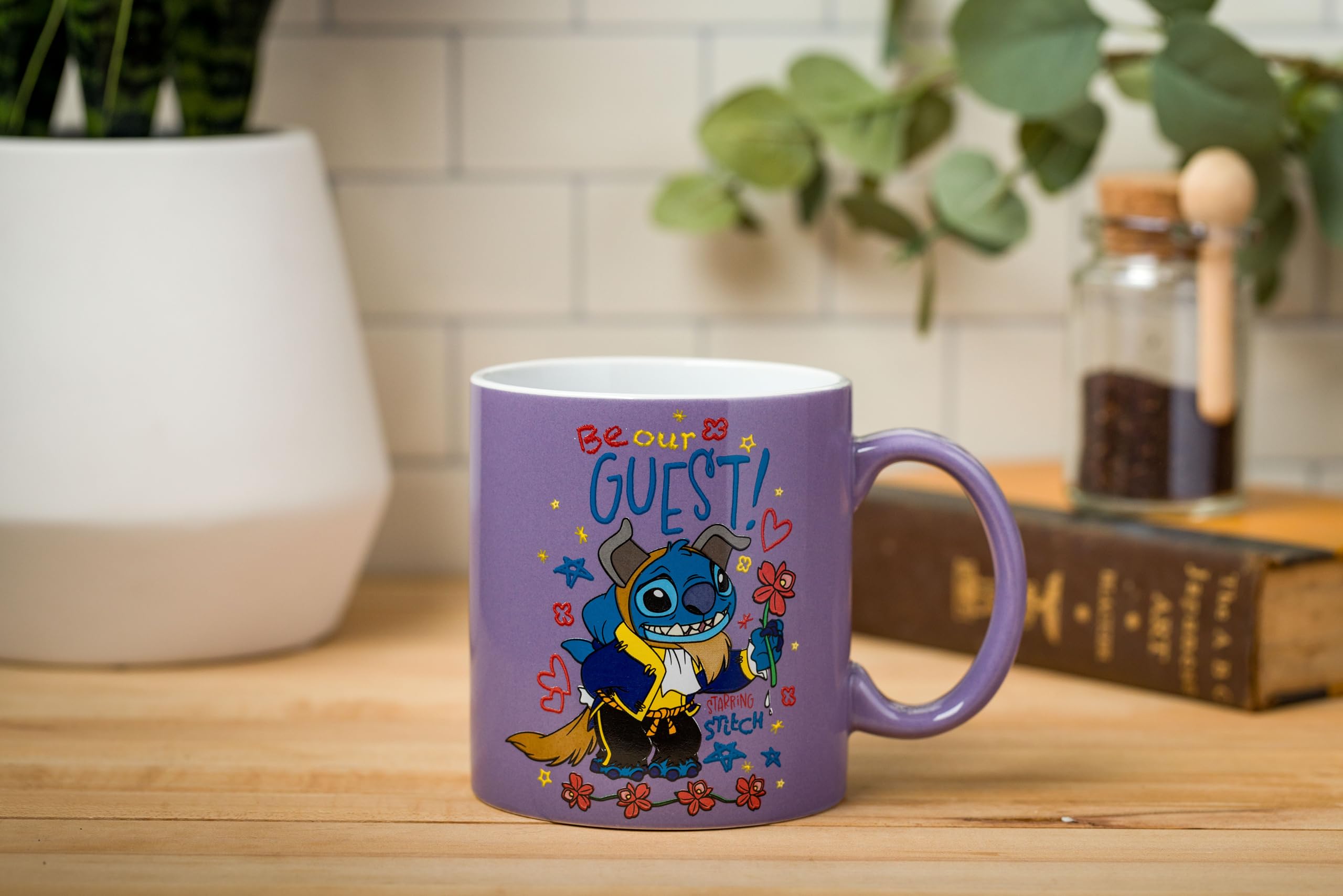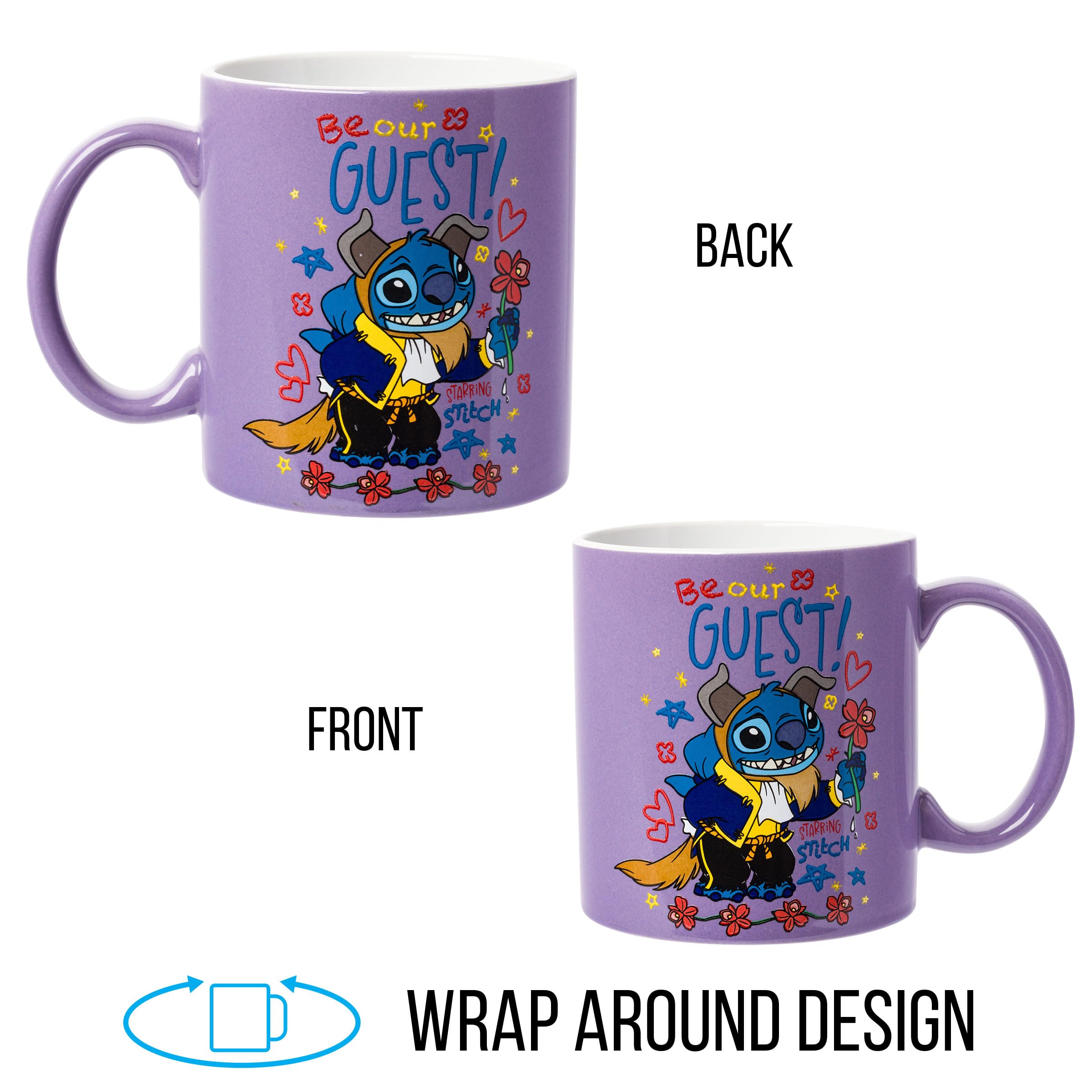 ADORABLE STITCH BEAST COSTUME: Adorable ceramic mug featuring Stitch, from Lilo and Stitch, in their iconic Beast costume, adding a touch of Hawaiian charm to your morning routine or collector's shelf. As a tribute to Beauty and the Beast, it has the famous words,"Be Our Guest," displayed.
