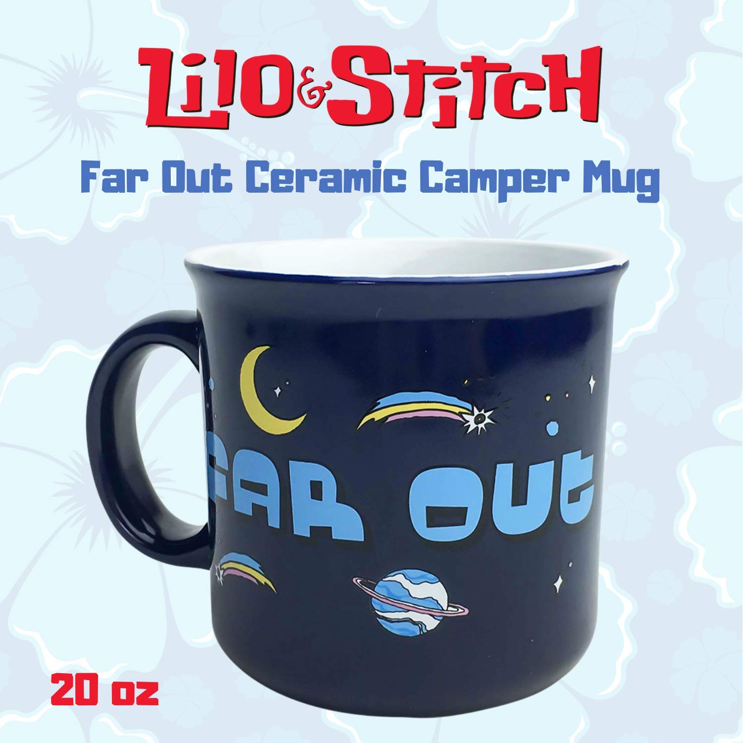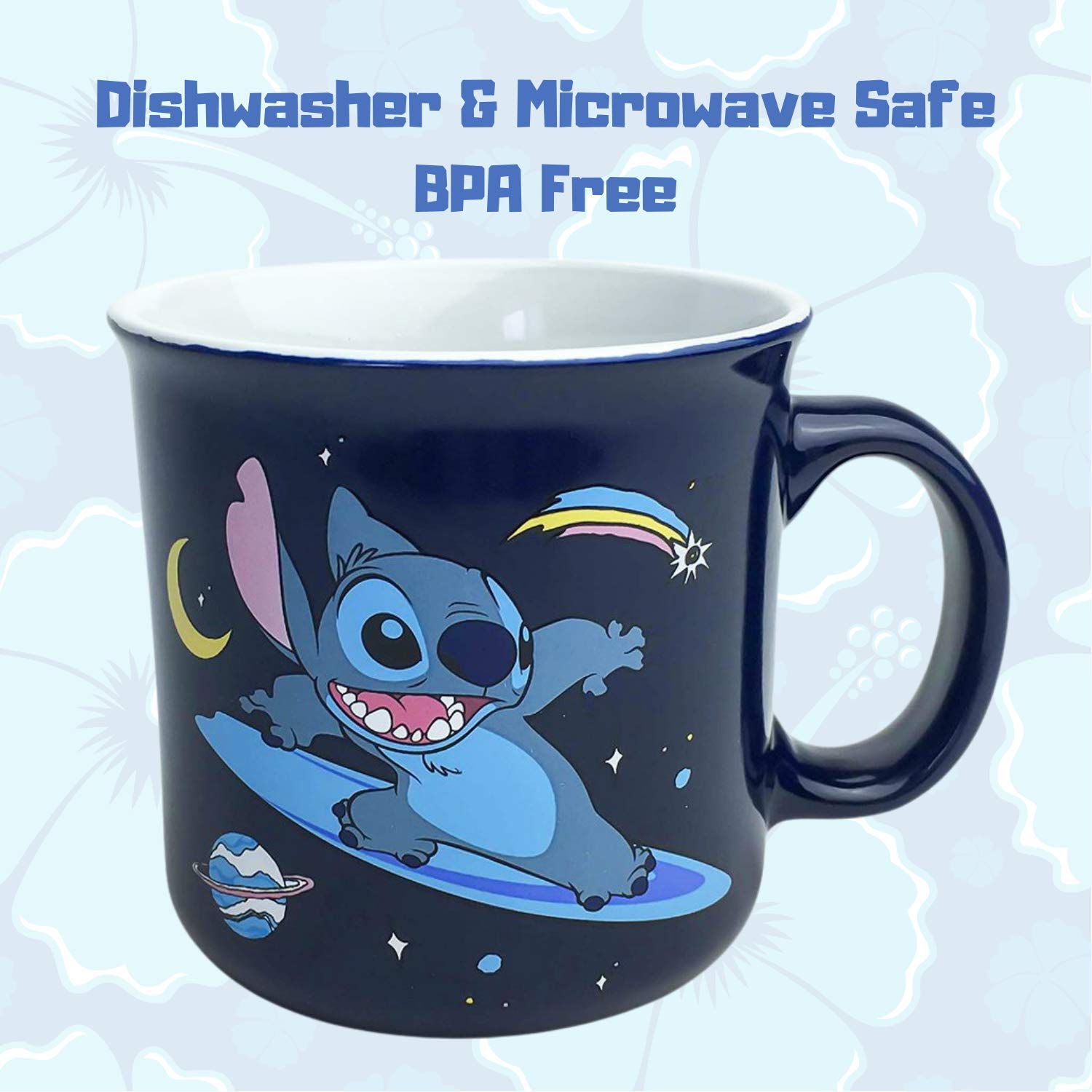 CAMPER MUG: Our camper-style ceramic coffee mug holds 20-ounces of your favorite beverage, features cute artwork of Stitch surfing through space, which is sure to let everyone know just how far out you are