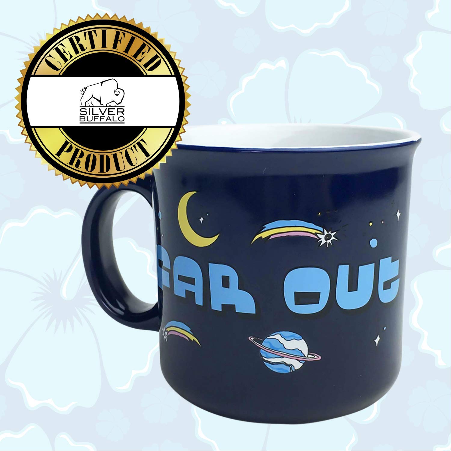 High-five, hang-ten and hang-out over a cup of coffee with Disney Lilo and Stitch Far Out Ceramic Camper-Style Coffee Mug for Cappuccino, Latte or Hot Tea from Silver Buffalo. This fun 20-ounce coffee mug features cute artwork of Stitch surfing through space, which is sure to let everyone know just how far out you are. The coffee mug is constructed from durable BPA-free and toxin-free ceramic and is microwave and top-rack dishwasher-safe. This Lilo and Stitch Far Out camper-style coffee mug is a great gift for all the Disney Lilo and Stitch fans on your island or the next! And feel confident knowing you are purchasing authentic, officially licensed Disney products from Silver Buffalo. Silver Buffalo is a trend-setting housewares and home decor company based in the heart of New York City. Working in collaboration with licensors and brands, Silver Buffalo develops unique, creative and ground-breaking products with a devotion to detail and commitment to innovation while staying true to current trends. Silver Buffalo prides themselves on manufacturing and distributing exciting products that connect with the child or fan(atic) in all of us.