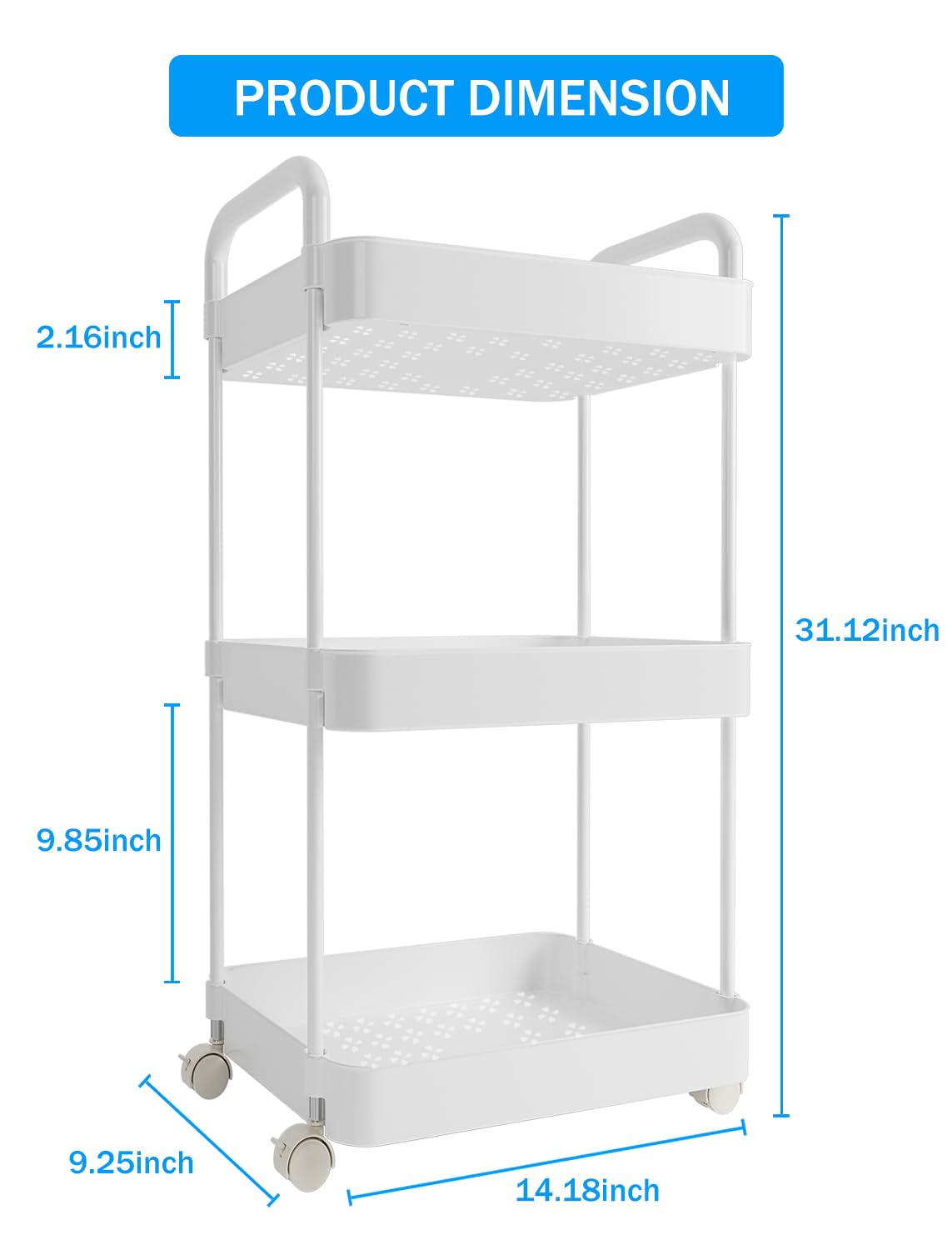 Large Capacity: This storage cart is made of ABS material mesh frame and sturdy pipe and doesn't take up much space, size 14.18 x 9.26 x 31.13 inches. With this 3-tier diaper cart, it can hold plenty of diapers, wipes, clothes, toys, and more. No more running back and forth to the nursery or changing tables