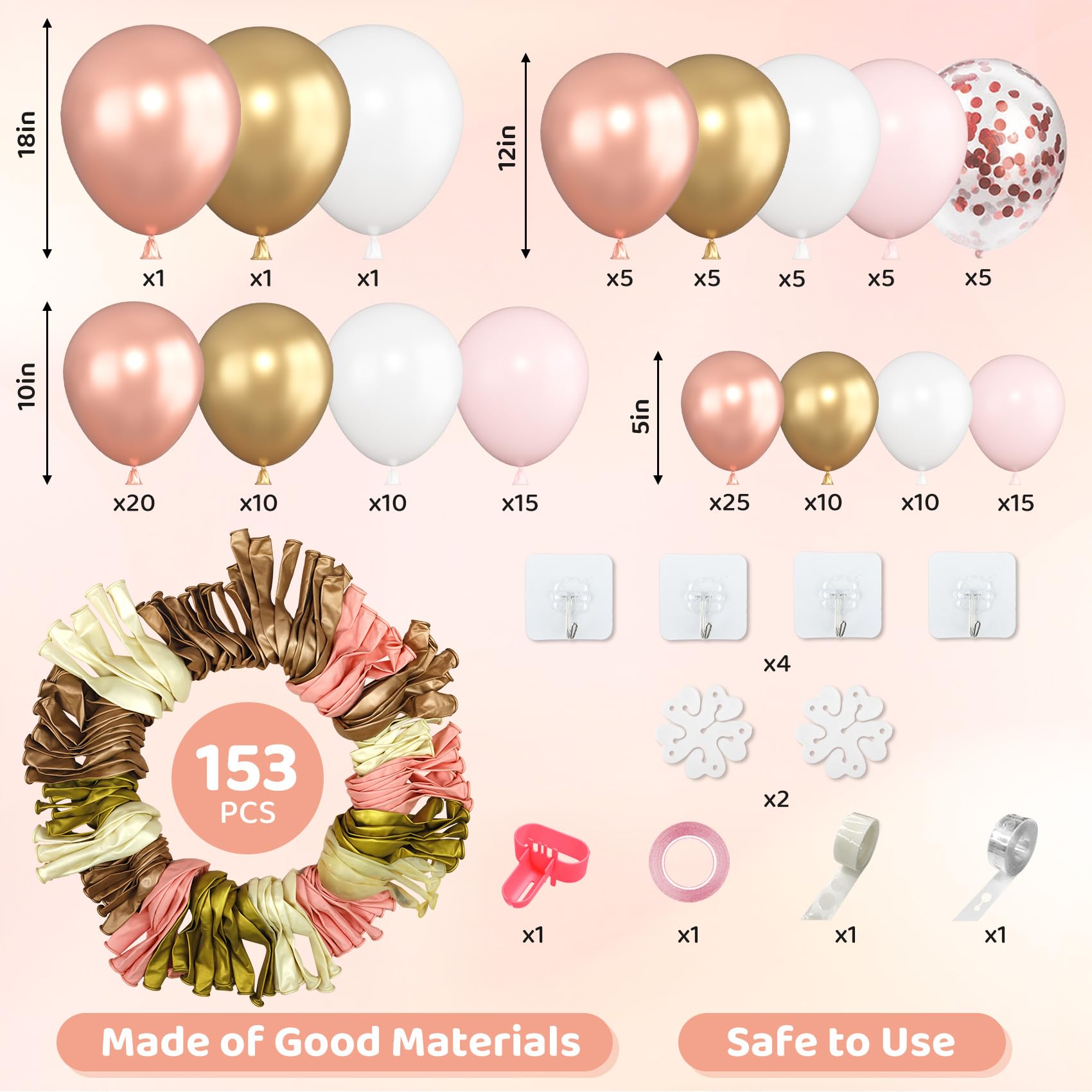 Sufficient Quantity of Rose Gold Balloons: The pink and gold balloon arch kit includes 18" metallic rose gold/metallic gold/pearl white balloons(3 pcs), 12" metallic rose gold/metallic gold/pearl white /pink/ confetti rose gold balloons(25 pcs), 10" metallic rose gold/metallic gold/pearl white /pink balloons(50 pcs), 5" metallic rose gold/metallic gold/pearl white /pink balloons (65 pcs), 10pcs balloon tools(balloon arch strips, tying tool, 100 glue points, ribbon, flower balloon clip, hook