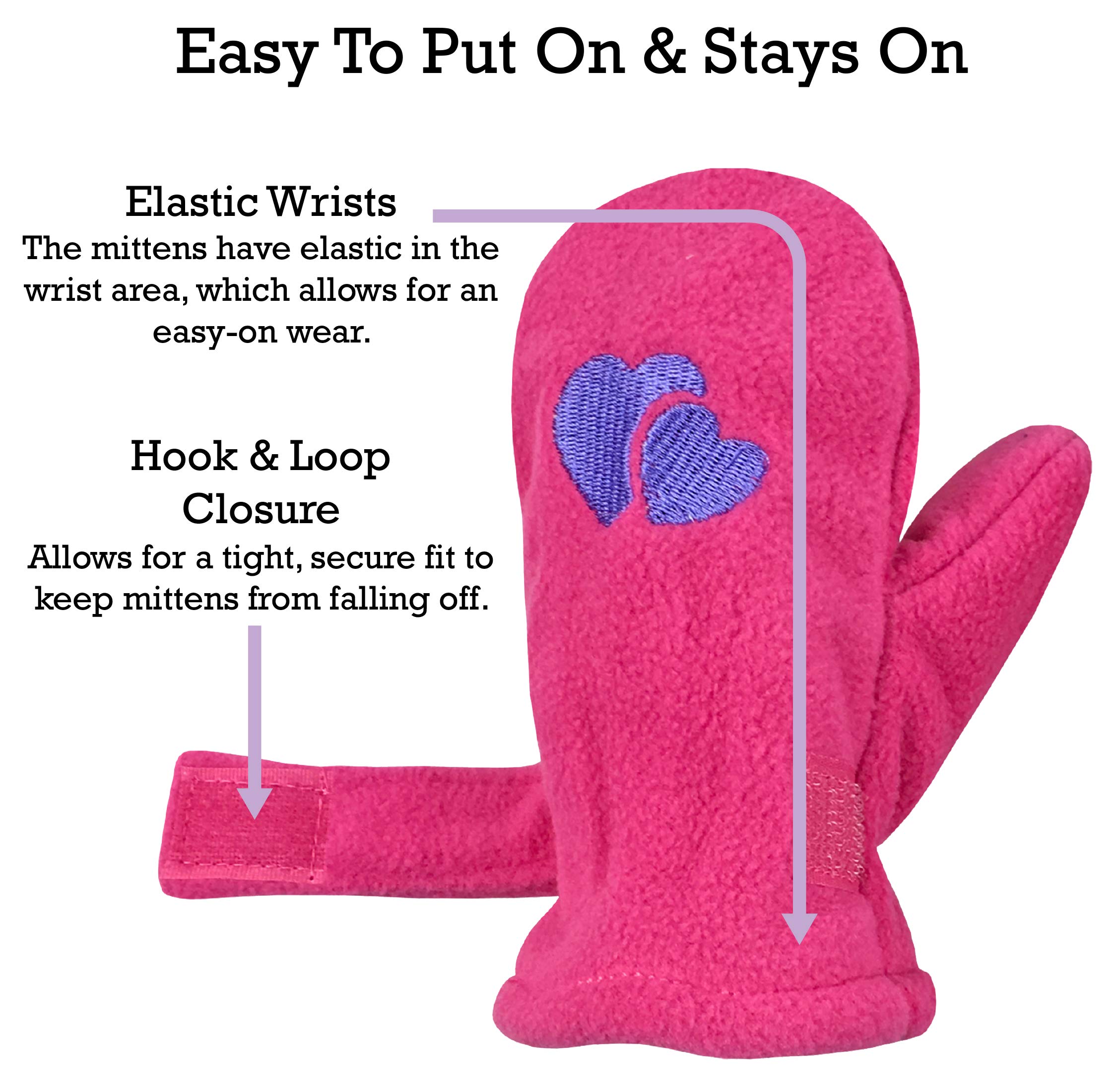 BABY & TODDLER GLOVES THAT ARE EASY TO PUT ON: The infant and child mittens are designed with elastic in the wrist area, which widens and allows for an easy-on fit. The hook and loop closure allows for a tight and secure fit