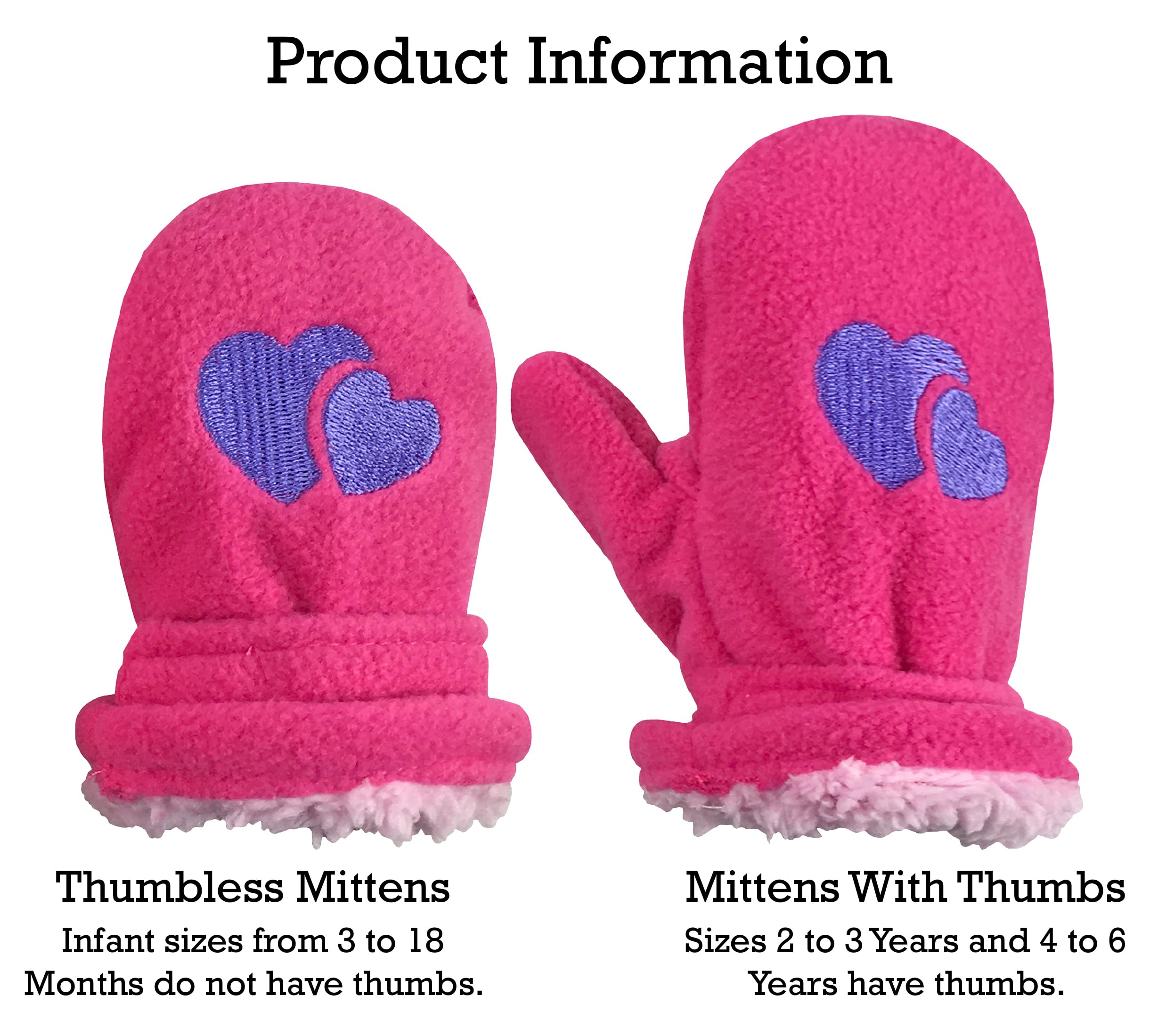 BOYS, GIRLS AND INFANT SIZING INFORMATION: For the baby sizes of 3-6 months and 6-18 months, the mittens do not have thumbs (they are thumbless). For the toddler and child sizes of 2-3 years and 4-6 years, the mittens have thumbs