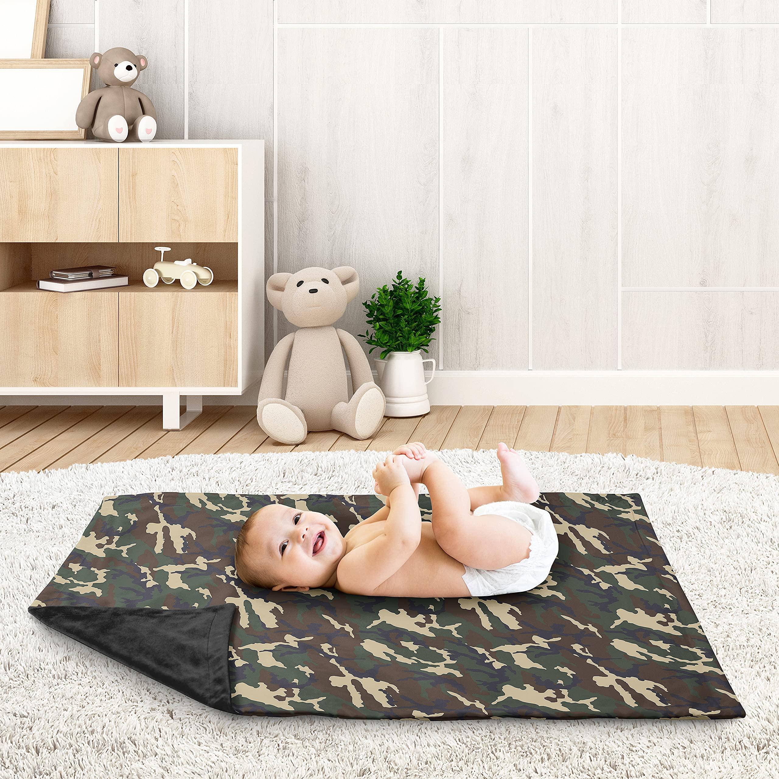 Blanket is designed using a beige, black, and green woodland camouflage brushed microfiber print and reverses to soft black minky
