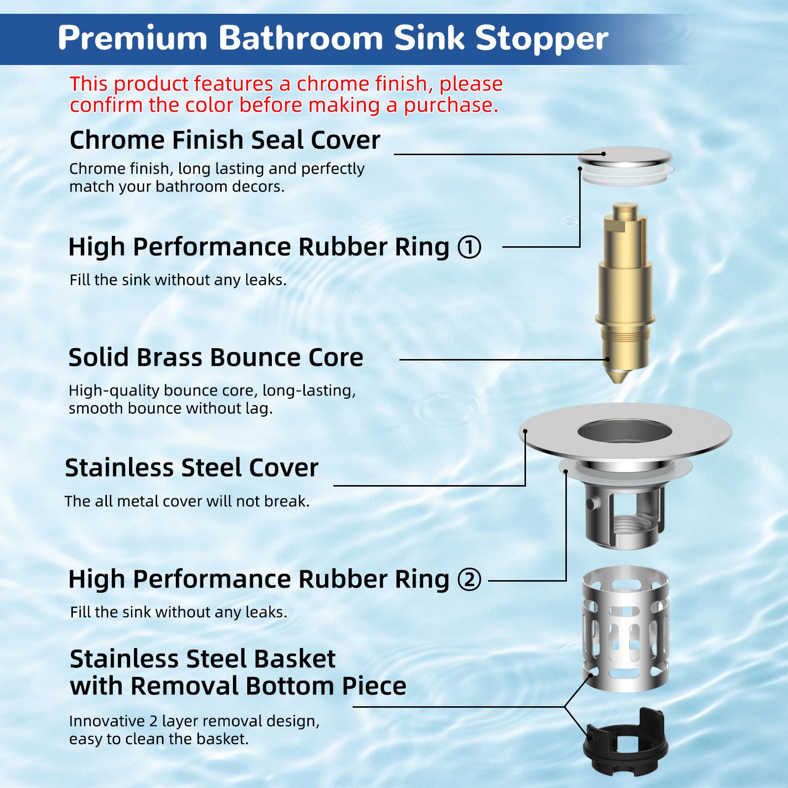 [Pop-up Design] Our pop-up sink drain strainer is made of high-quality stainless steel, plastic, and solid brass, providing exceptional rebound strength, corrosion resistance, and long-lasting durability. It features a long-lasting and sensitive pop-up brass bullet core mechanism, allowing you to easily switch between the water storage and fast drainage modes with just a gentle press. Note: blue protective film is applied to protect the surface, please remove it before use