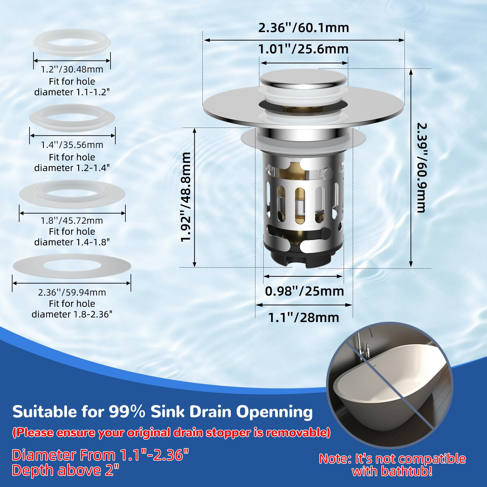 [Versatile Compatibility & Easy Installation] This bathroom sink drain stopper includes four O-rings, which are designed to fit 99% of standard US sink drains, including bathroom sinks and washbasins with drain holes measuring between 1.1" and 2.36". Please measure the sink drain hole diameter before purchasing it for a proper fit. The installation is quick and hassle-free, without the need for expensive tools or plumber fees. Simply remove your old stopper and insert the new one into the drain hole, installation only takes a few seconds