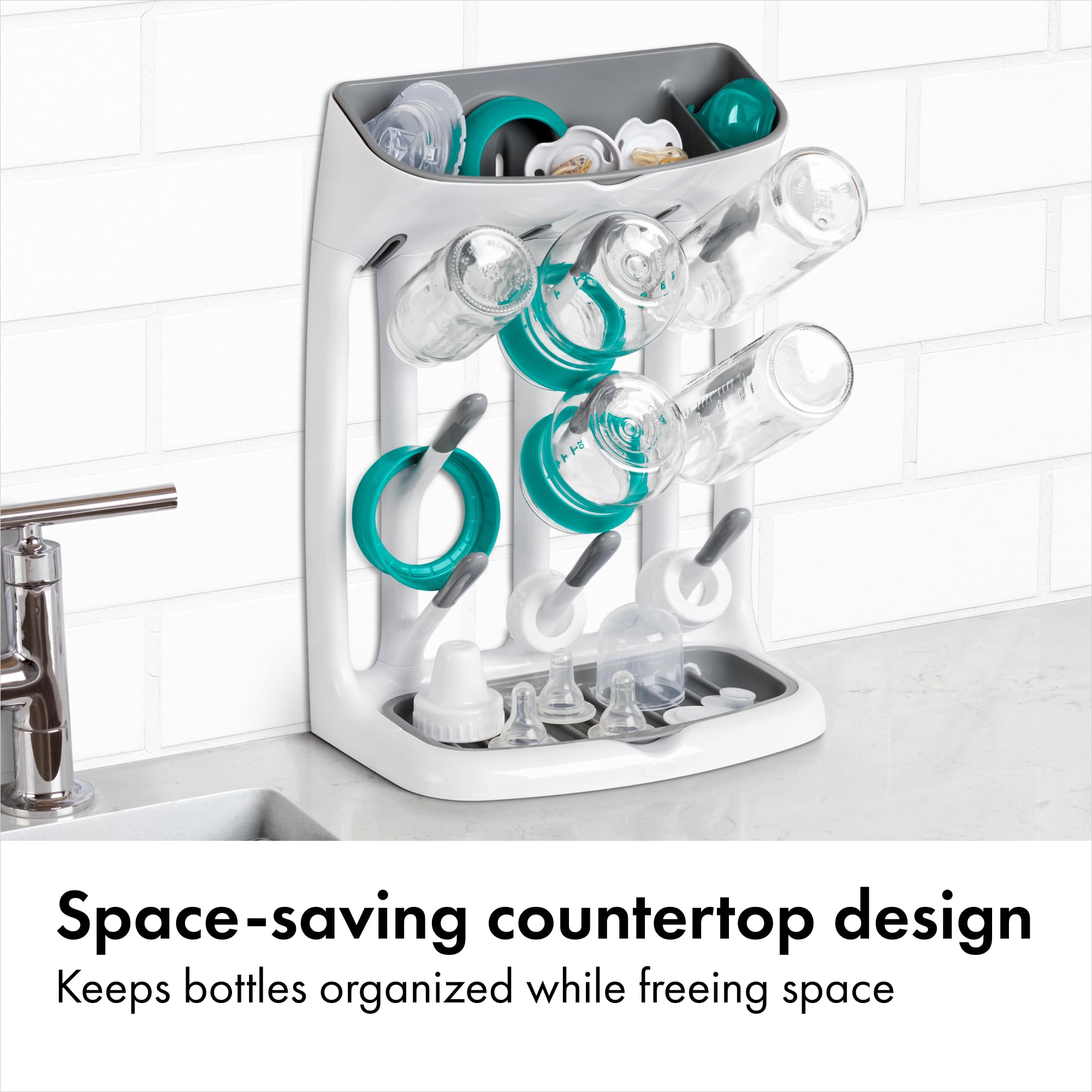 The OXO Tot Space-Saving Drying Rack helps parents dry baby bottles and sippy cups without cluttering the countertop. This BPA-free baby bottle drying rack features a compact design, with nine angled pegs to elevate bottles and cups at just the right angle for ventilation and thorough drying. This apartment essential features a top tray for covers, nipples, pacifiers and other small items. The base tray of the drying rack features ridges to keep lids and bottle parts elevated for quick drying. The compact drying rack fits neatly under cabinets, making it a smart small space solution for kitchen storage. Both the base and top trays of this drying rack are removable for thorough cleaning - whether by hand or in the dishwasher. This baby bottle drying rack is a perfect addition to any baby registry and truly is a newborn essential. Every OXO Tot product is tested in real homes with real families to ensure thoughtful design you can trust. We use them with our own children every day and we sincerely hope they make your life a little easier, too.