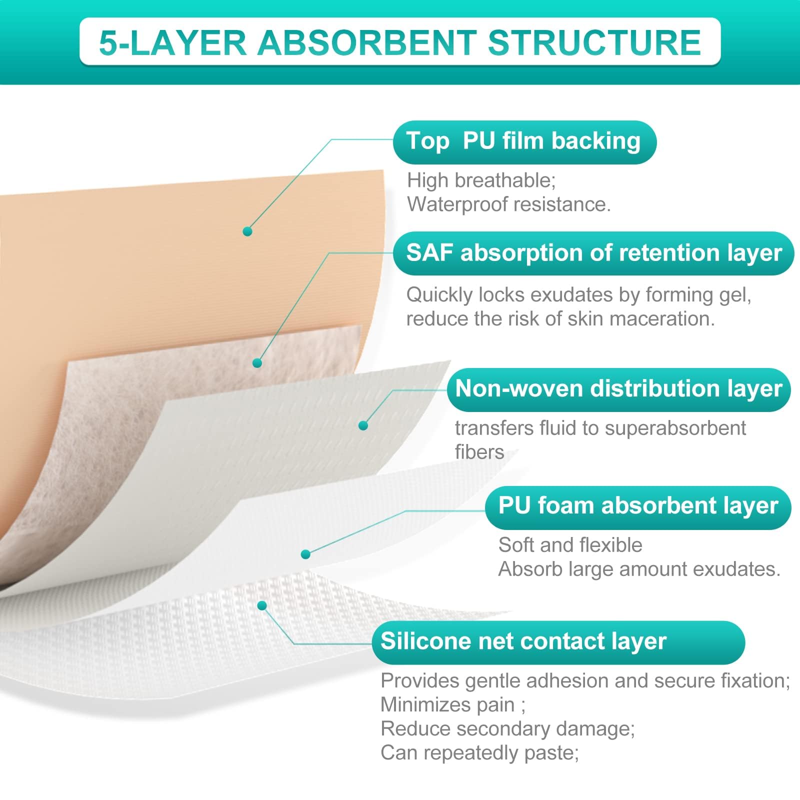 PROMOTE HEALING LESS PAIN - Absorbs 15 times of wound fluid thanks to our 5 layers material self-adherent dressings. It maintains a healthy moisture environment, creates a barrier from the outside, promotes wound recovery