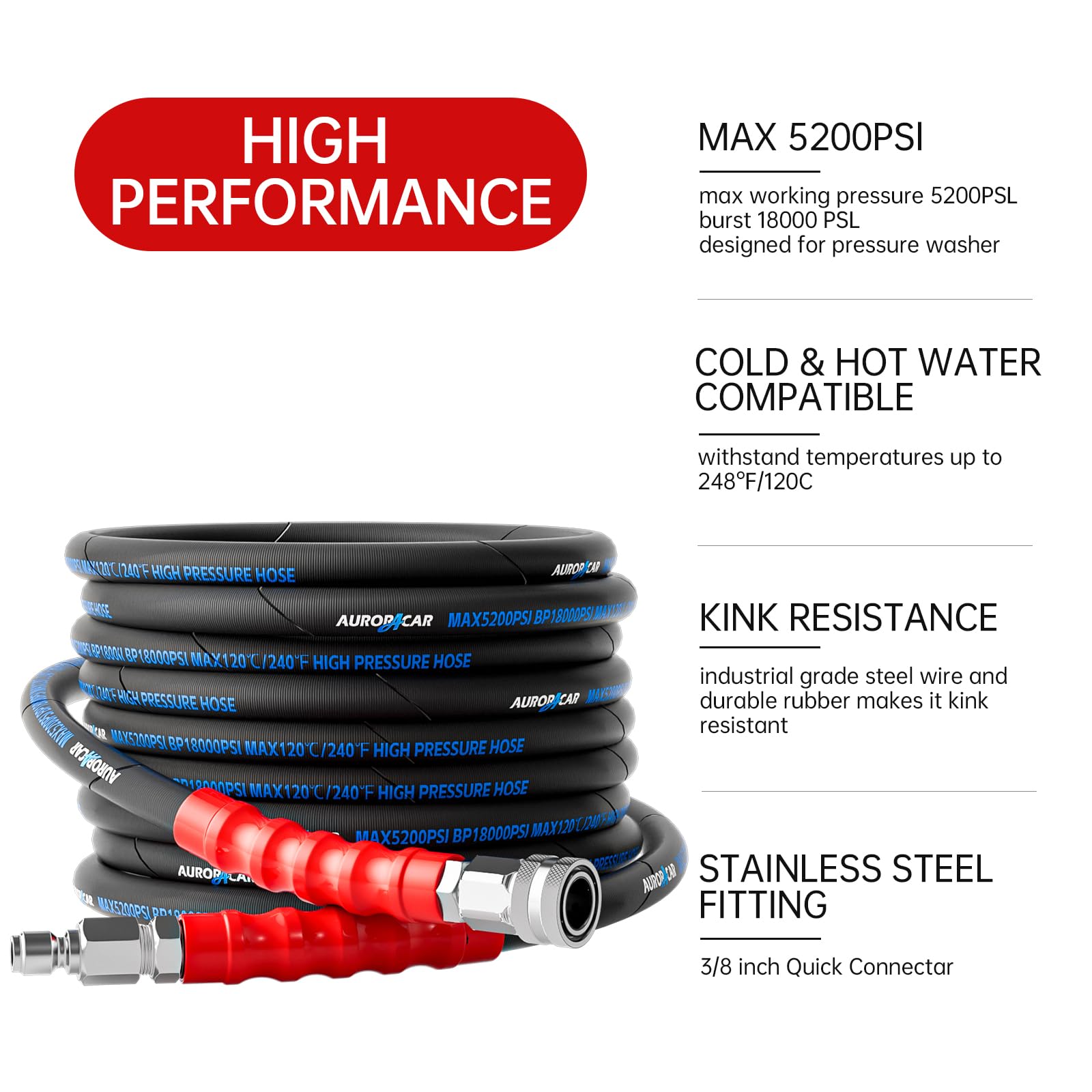 Cold and Hot Water Available: 3/8'' pressure washer hose compatible with both hot & cold water use with working temperature 35℉-240℉(0°C-120°C), it helps you remove the heavy dirty easier and faster, great for commercial and household cleaning needs during all seasons.