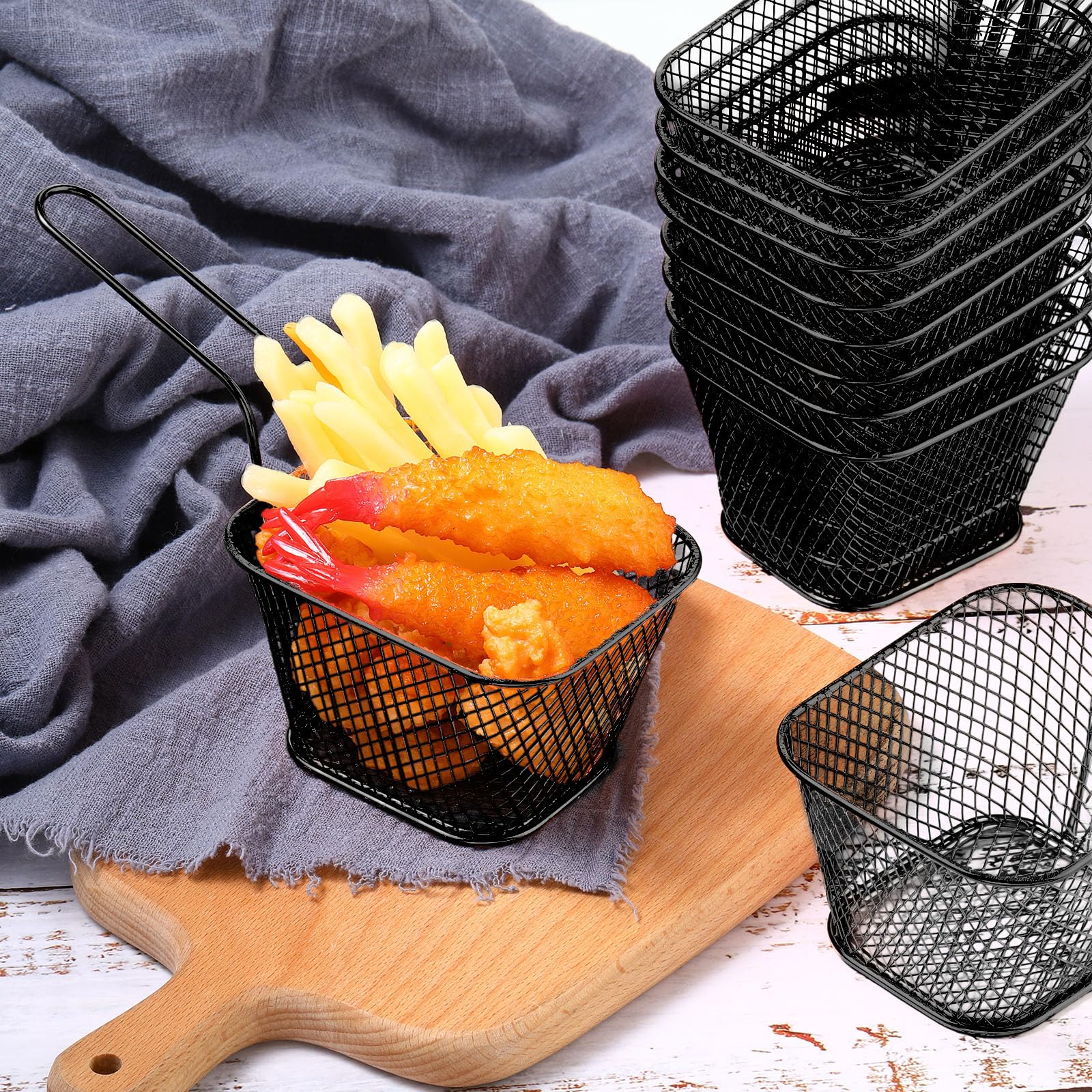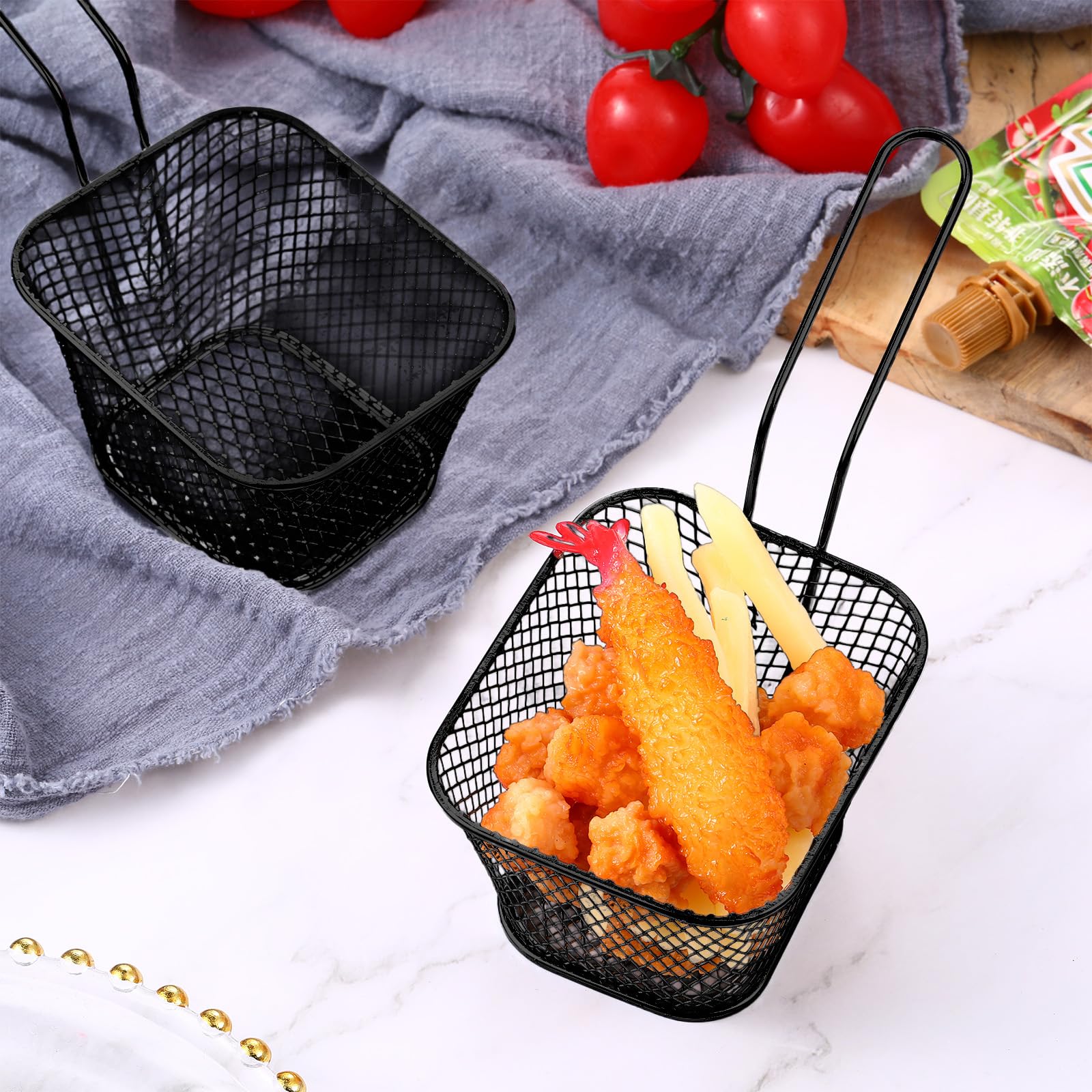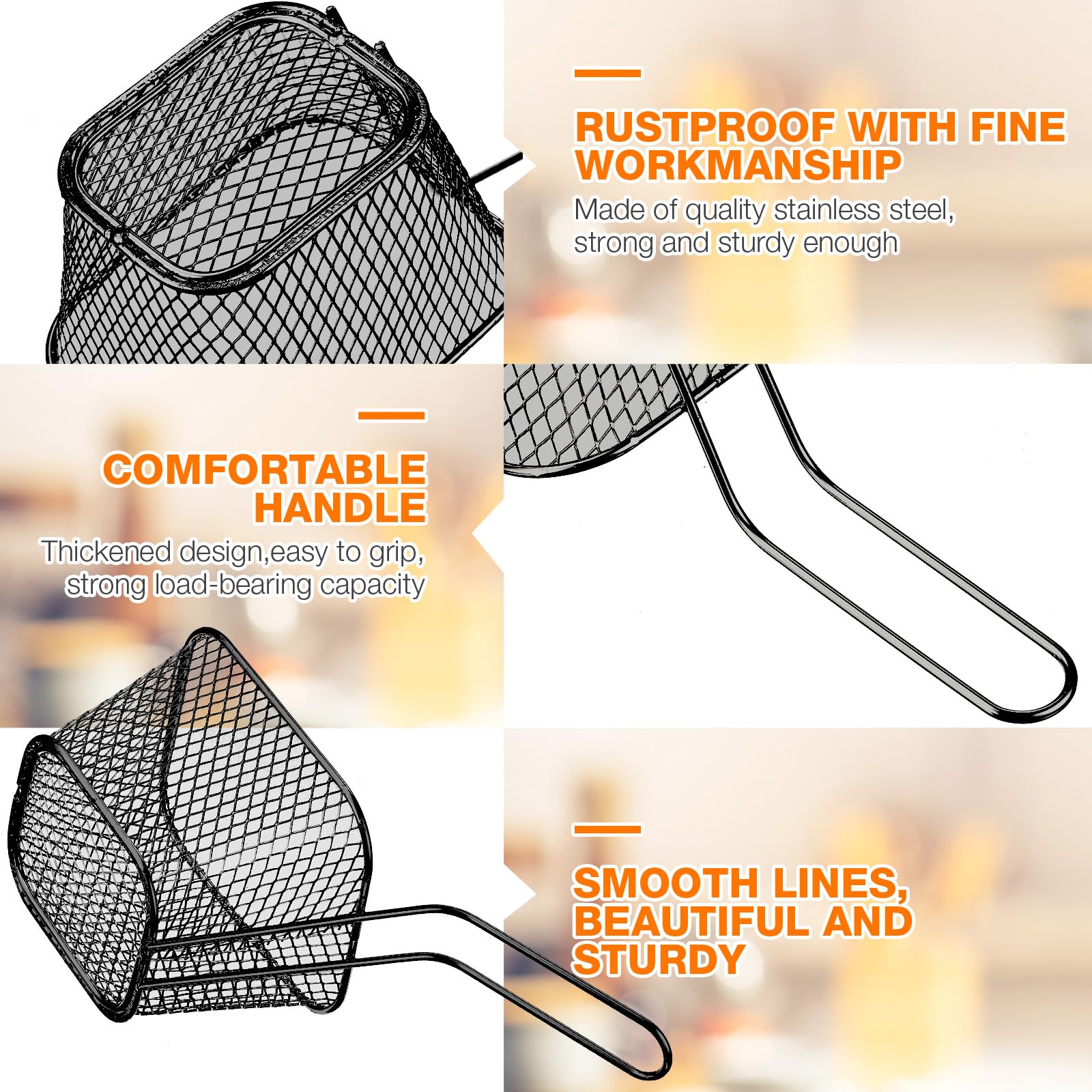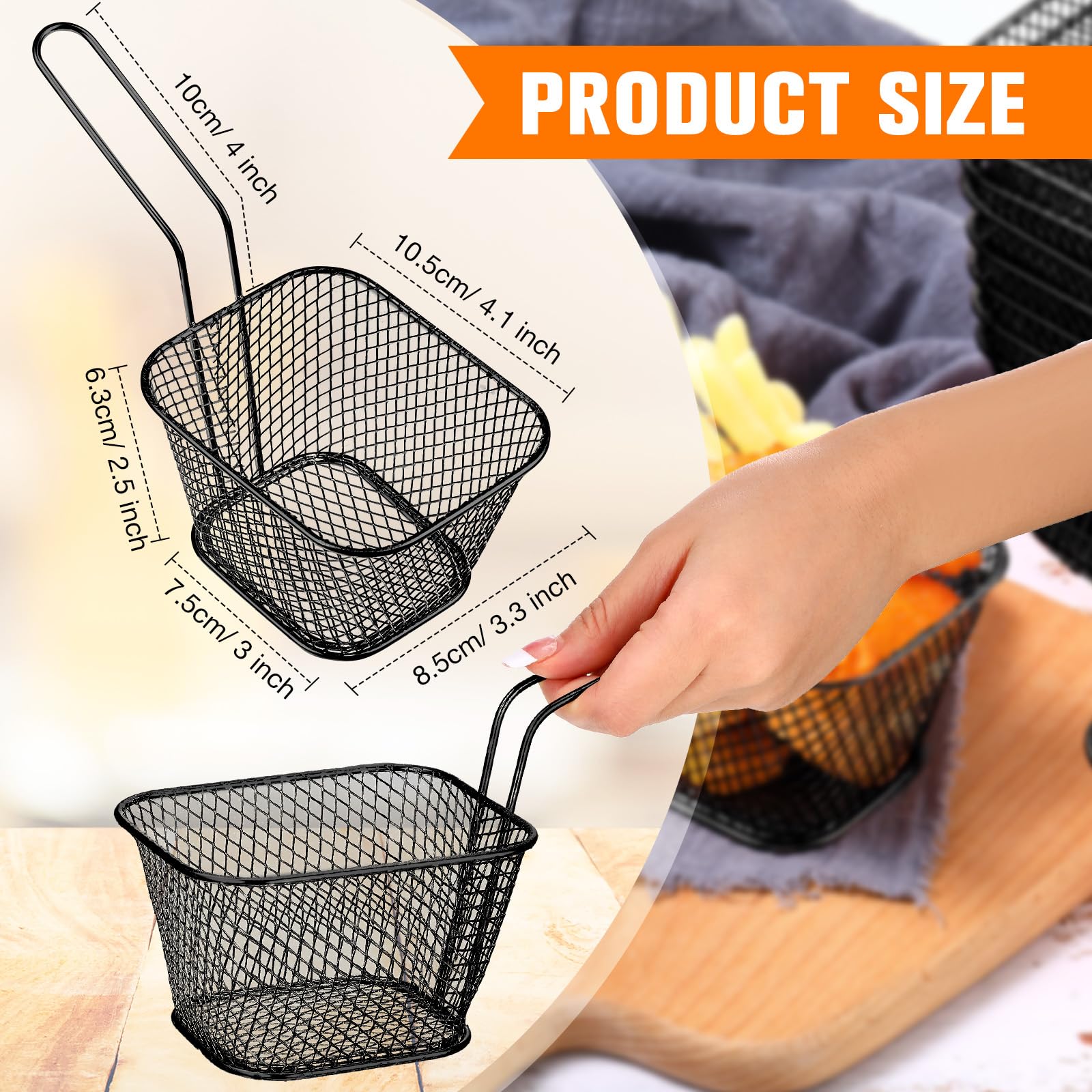 Beautiful and Delicate Design: the mini fry basket with smooth surface will not scratch the hands of customers, guests or children; And the handle design allows you to easily take out fried food without burning yourself, ideal serving tools to in restaurants, cafe and kitchen
