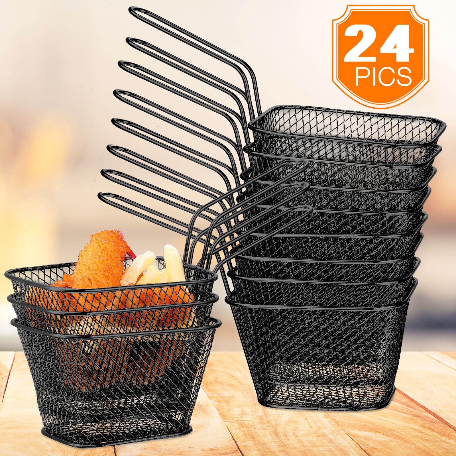 What You Can Get: the package comes with 24 pieces of fryer baskets with handle, large quantity can meet your different cooking demands, classic color makes them befitting for most occasions, you can hold different fried snacks with these baskets at the same time or share them with your family and friends