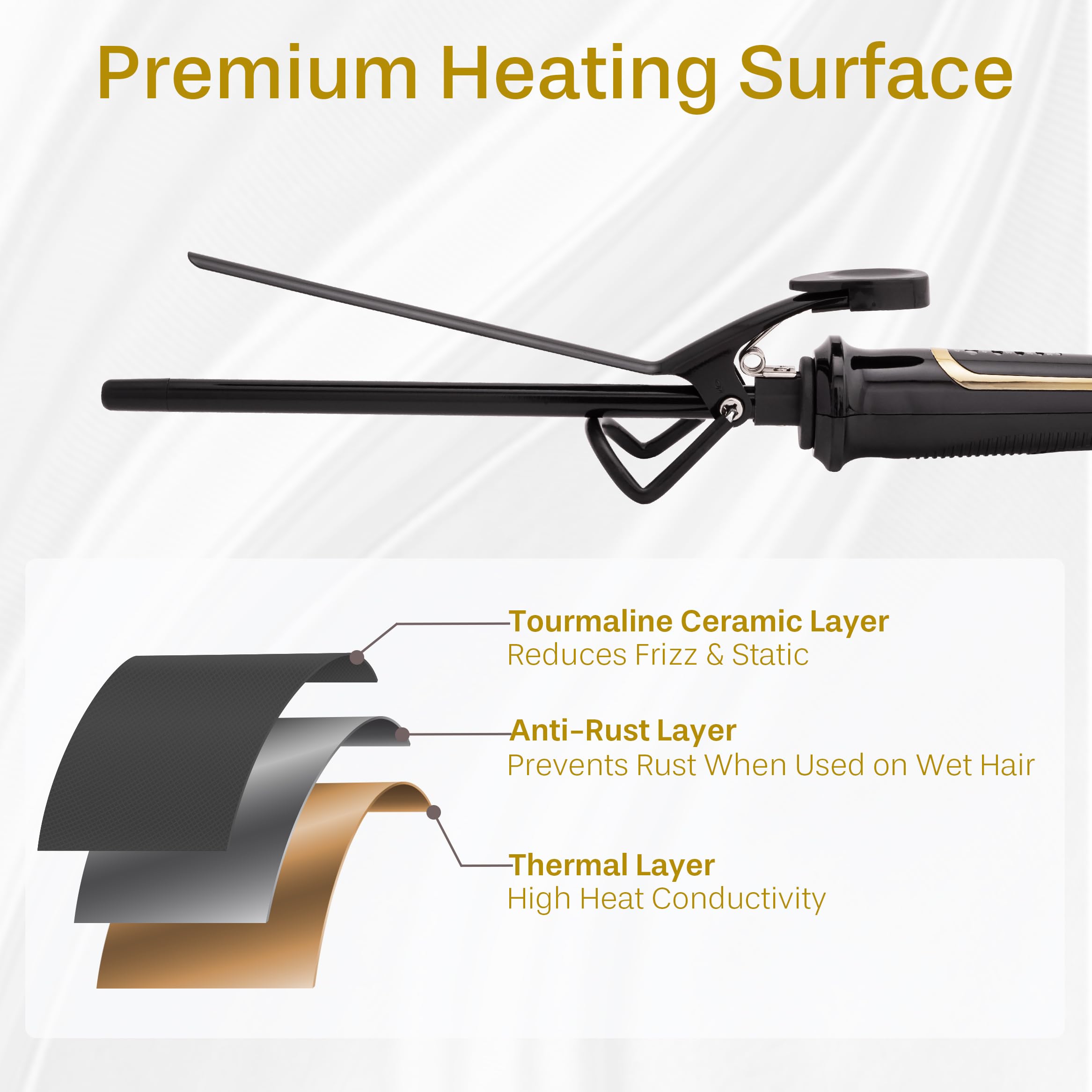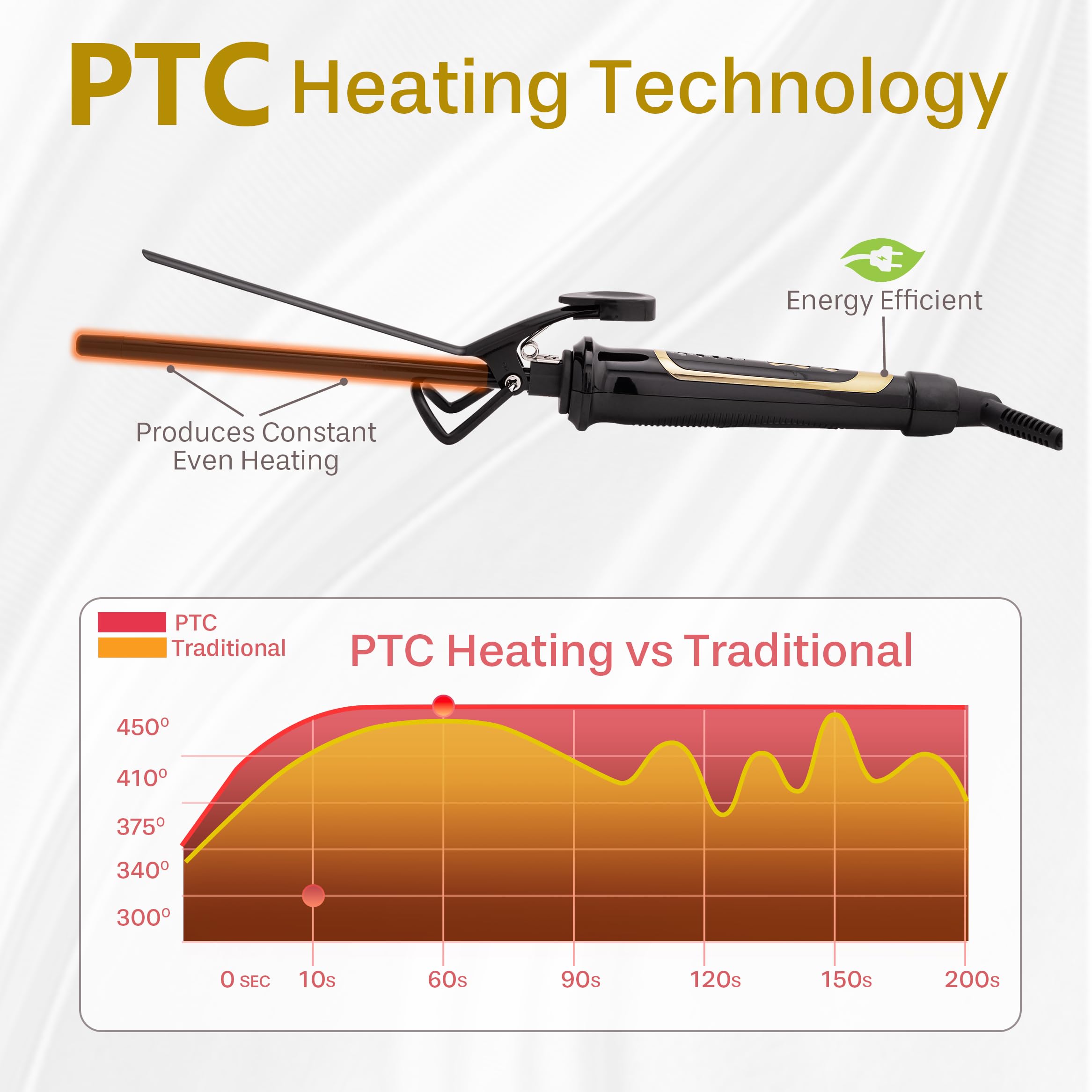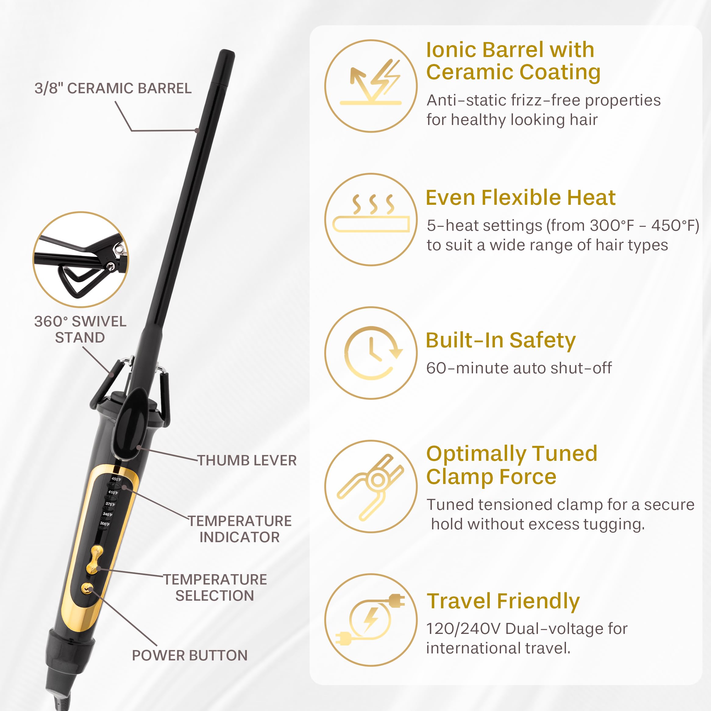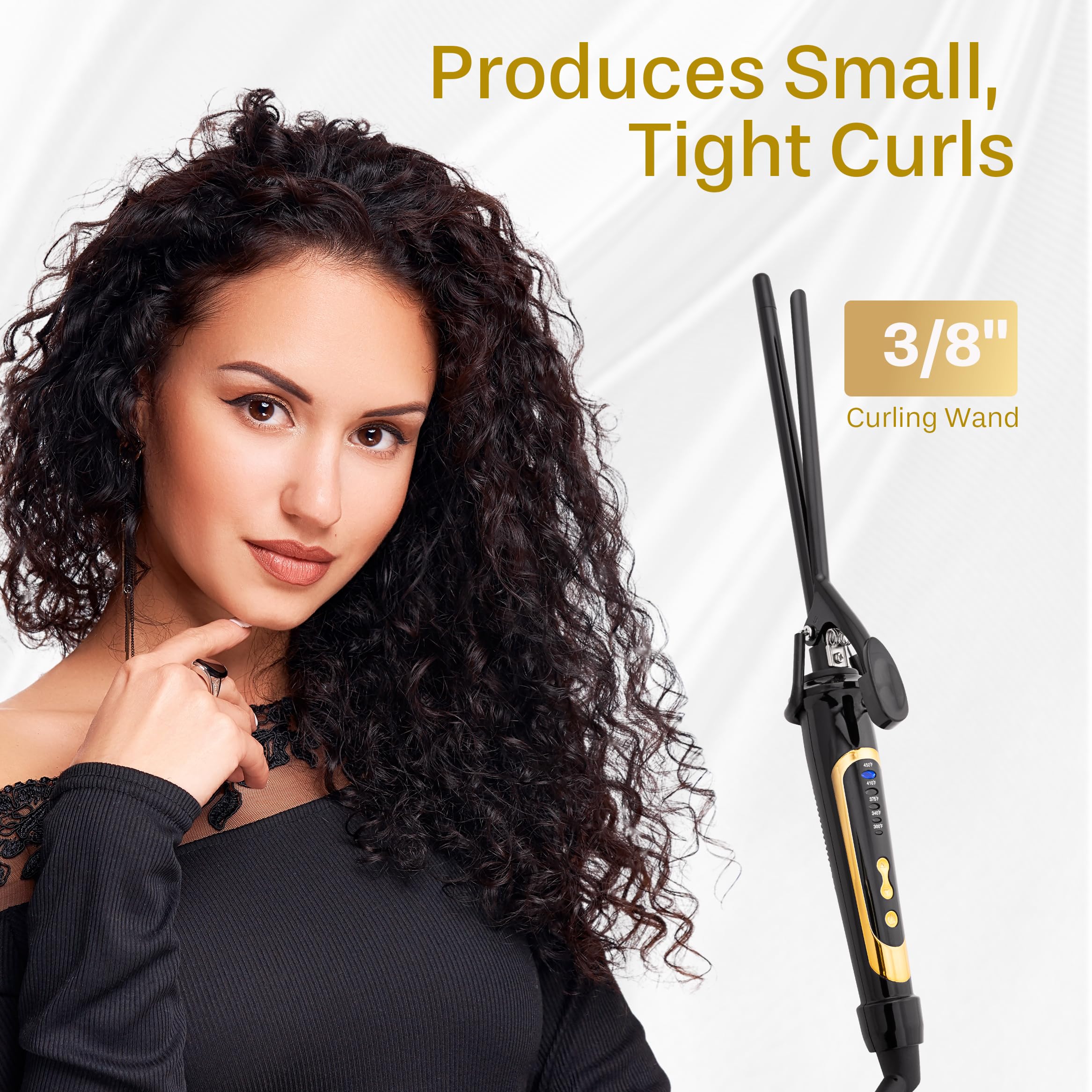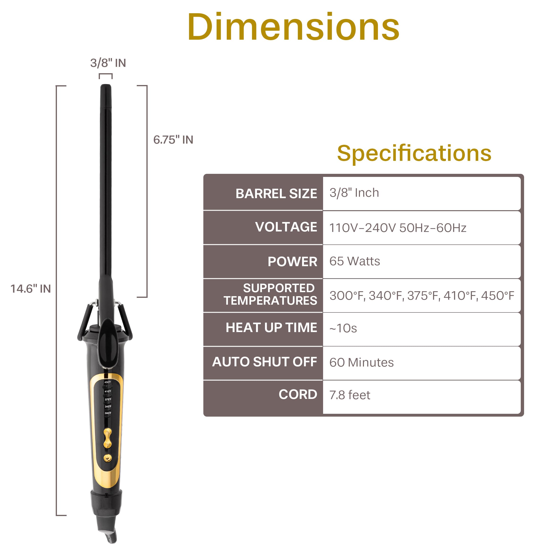 ELEGANT STYLING VERSATILITY: Our sleek and thin curling iron, featuring a customized 3/8 inch barrel, enables you to create a myriad of stunning hairstyles. From spiral and tight curls to well-defined shiny ringlets, confidently express your unique style with ease.