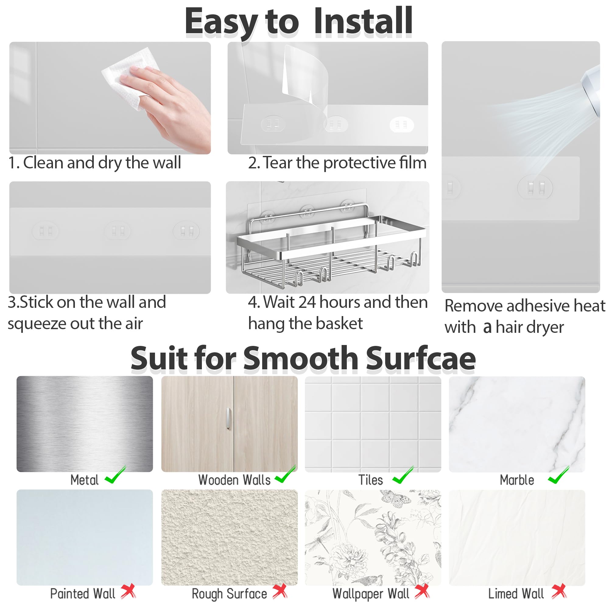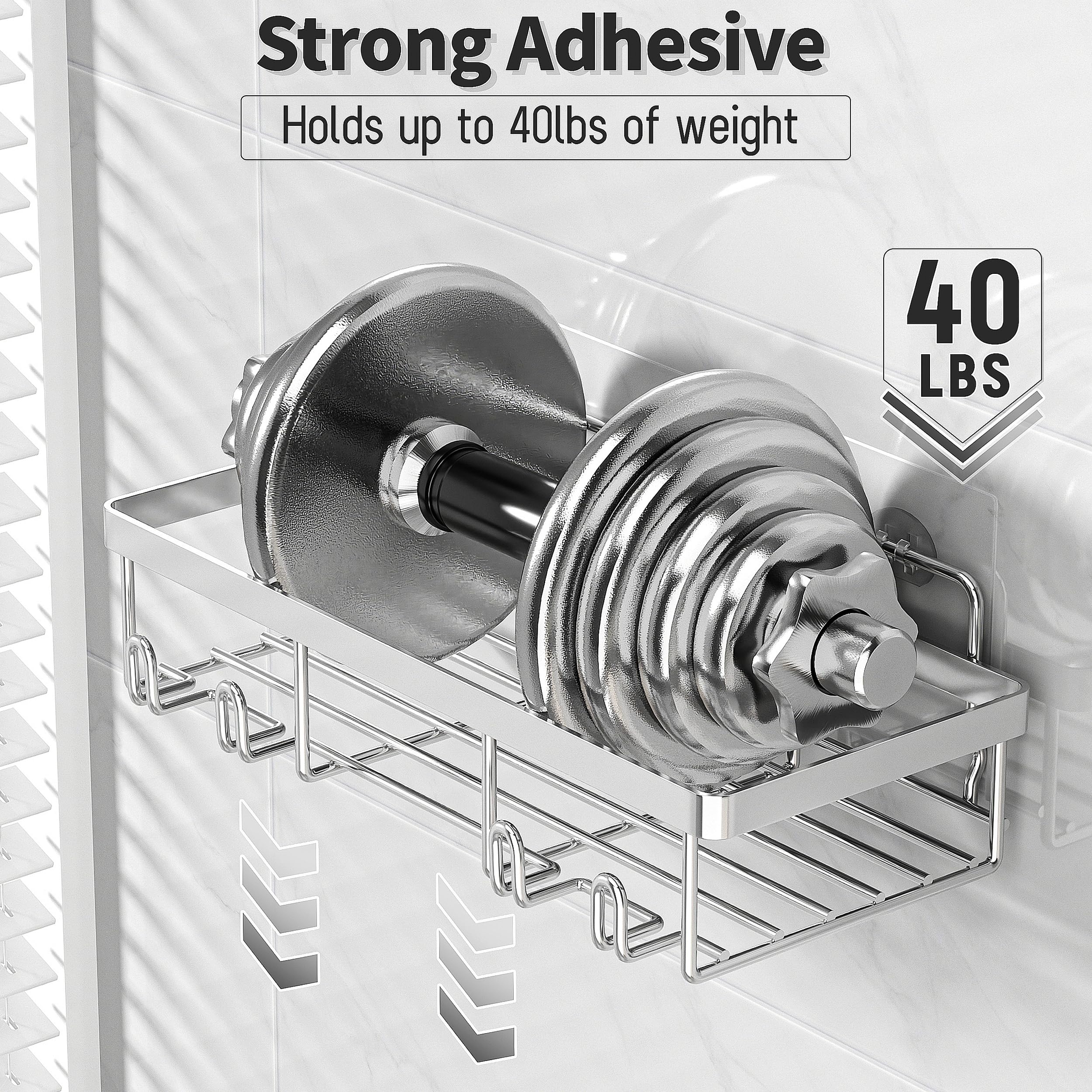 Strong Adhesive: 1 piece adhesives can stand up with 40 lbs, Keep the tins and bottles in the bathroom shower caddy, and make them easy to fetch and use. Never worry it falling off the wall after stick on the shower racks