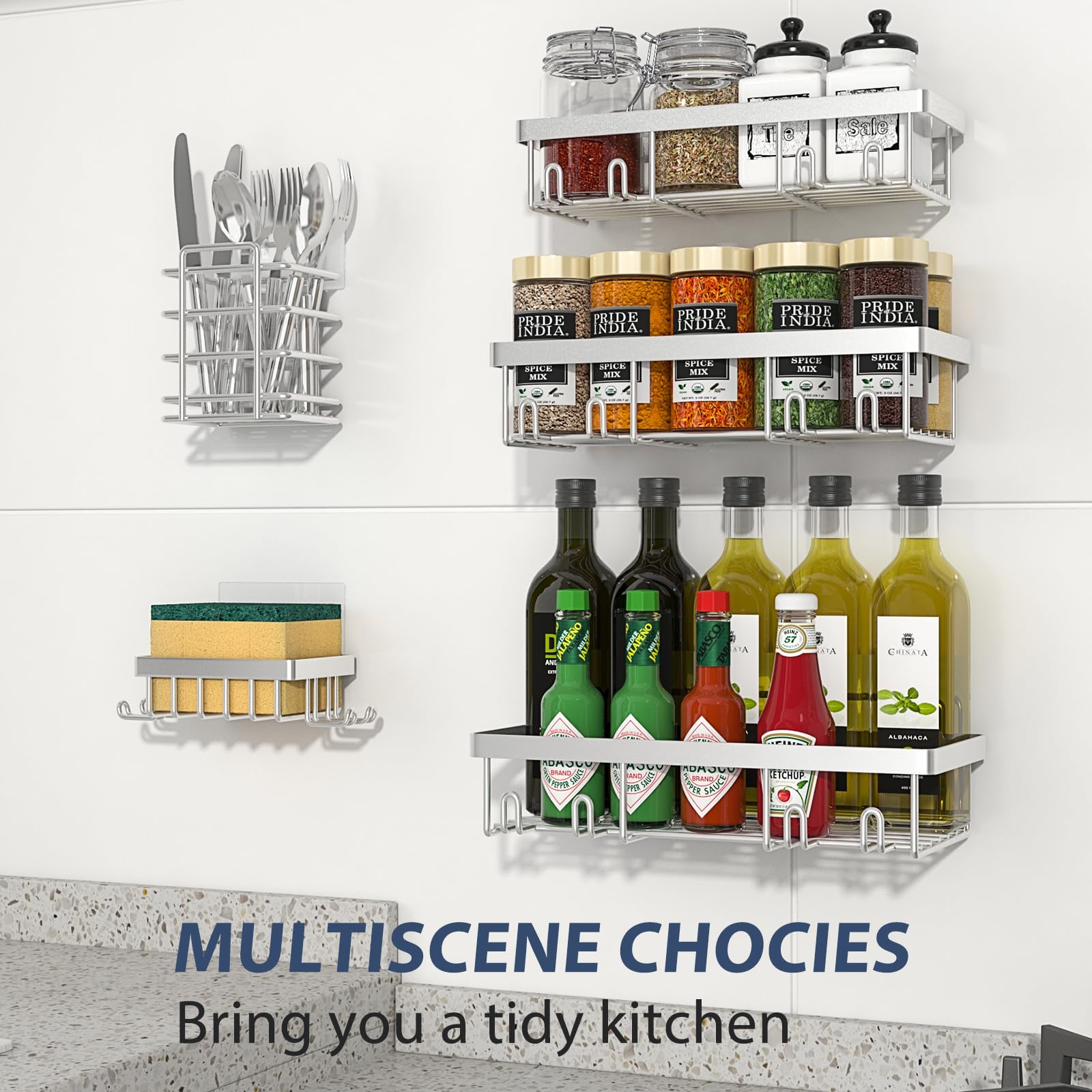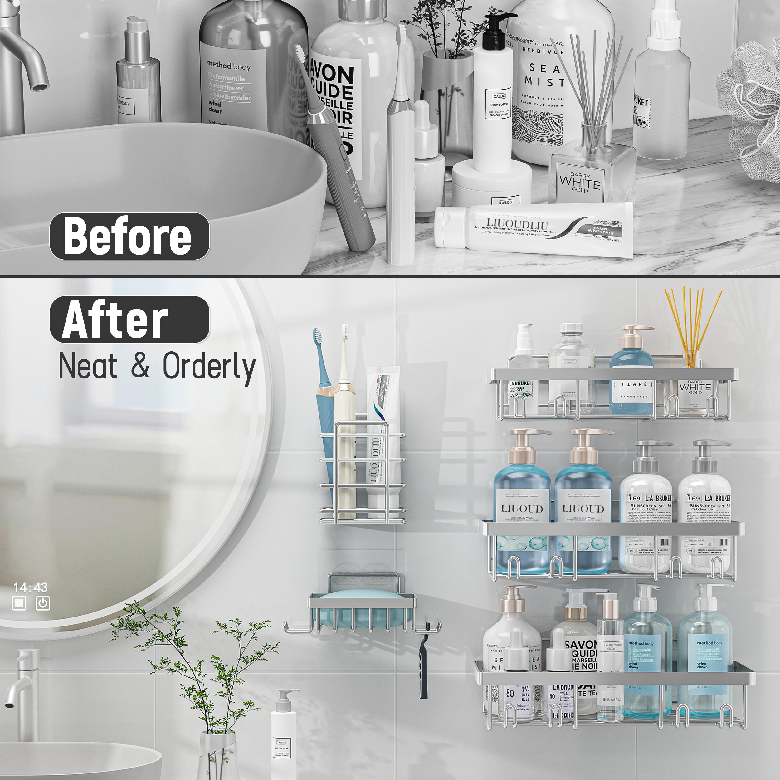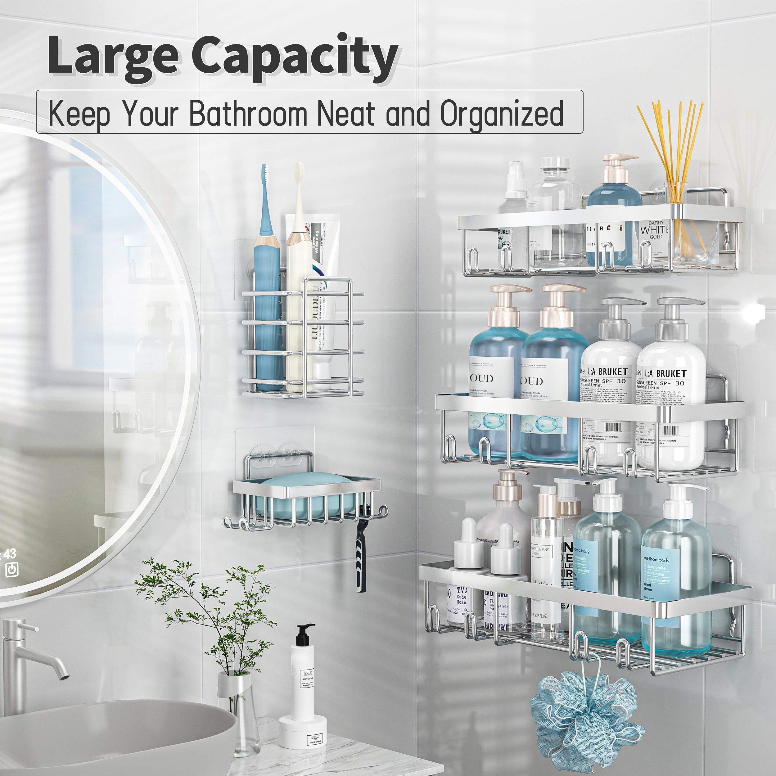 5 PCs Large Storage Shower Caddy: The bathroom shower organizer set comes with 3 Silver wall shower caddies, 1 soap holders, 1 toothbrush holder and 5 adhesives. The shower storage shelves can store all of your bath supplies