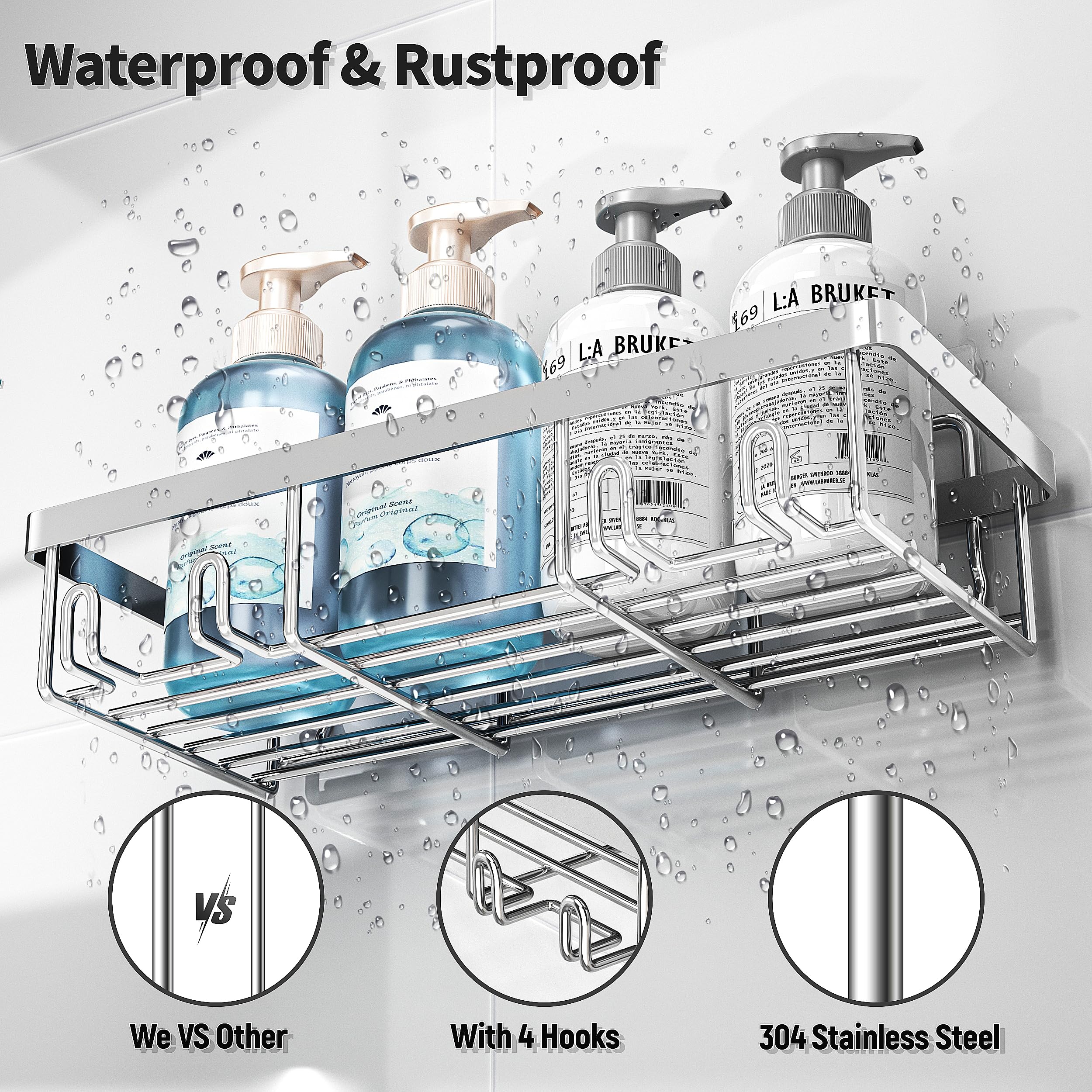 No Drilling Installation: Liuoud shower rack for inside shower simply needs stick adhesive on the wall and hang the shelf to use. No drilling, no damage to your wall. taking all 5 minutes without any tools needed