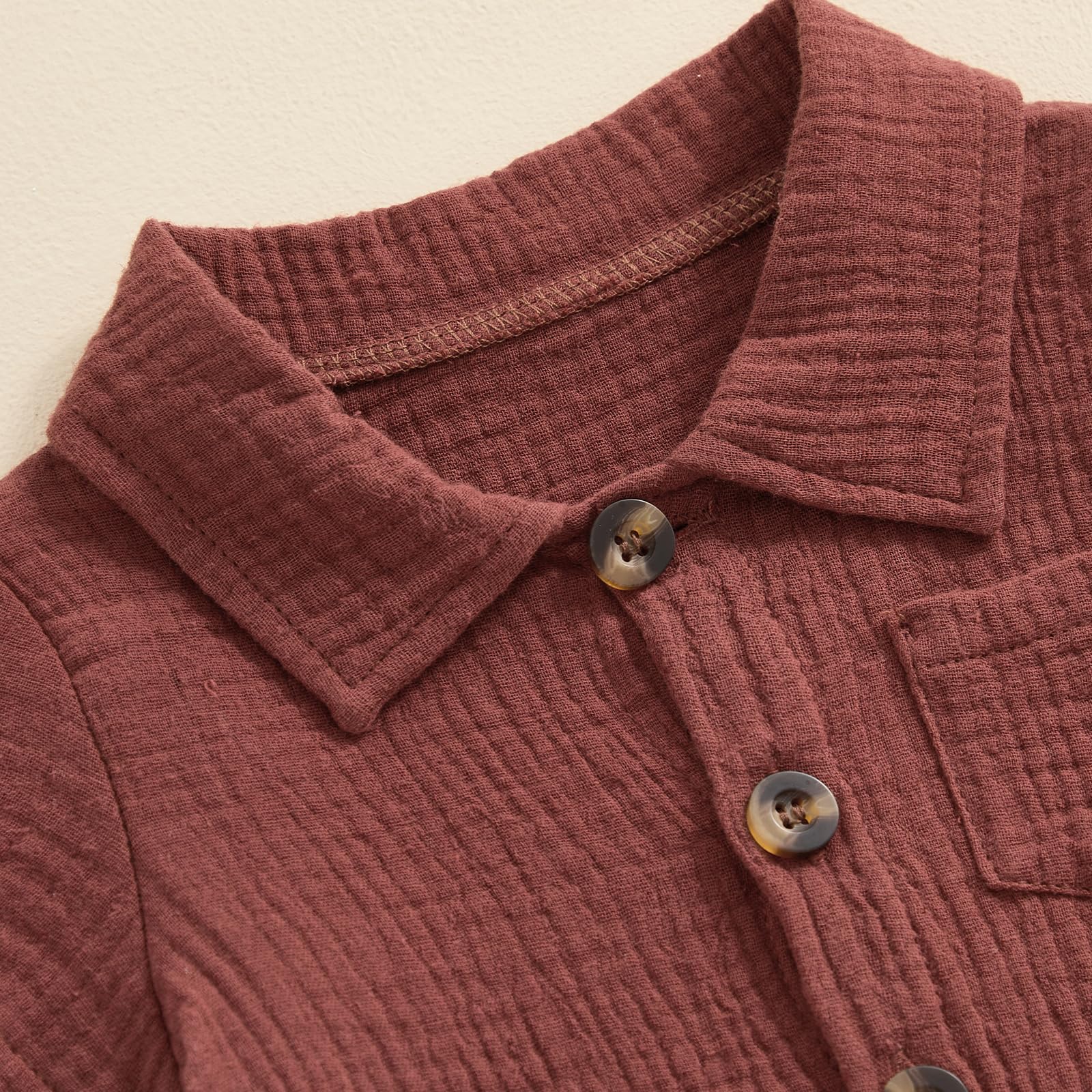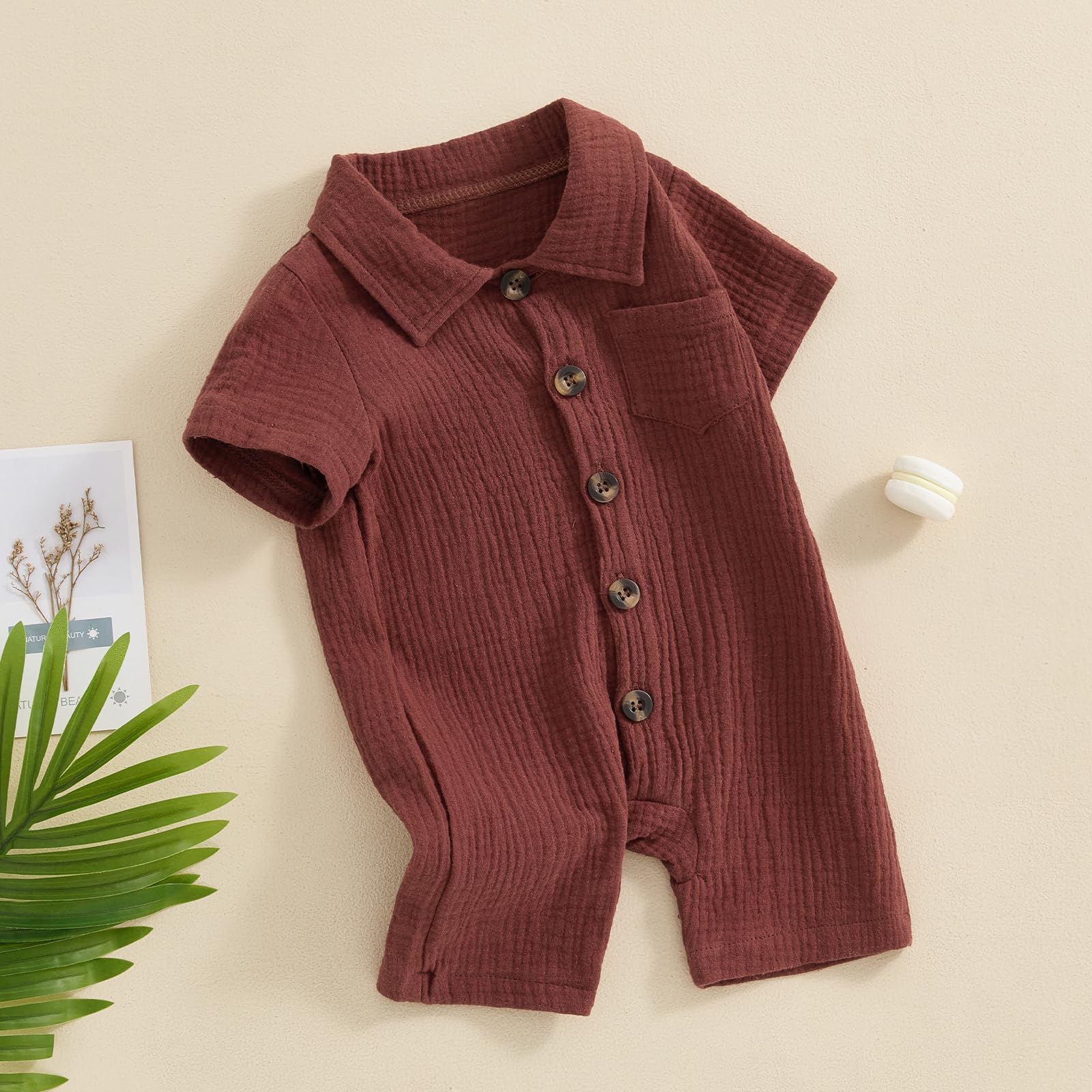 Features - Summer baby boy romper jumpsuit, short sleeve, lapel collar, button down, solid color, one chest pockets design, casual cotton linen jumpsuit playsuit for infant boys.