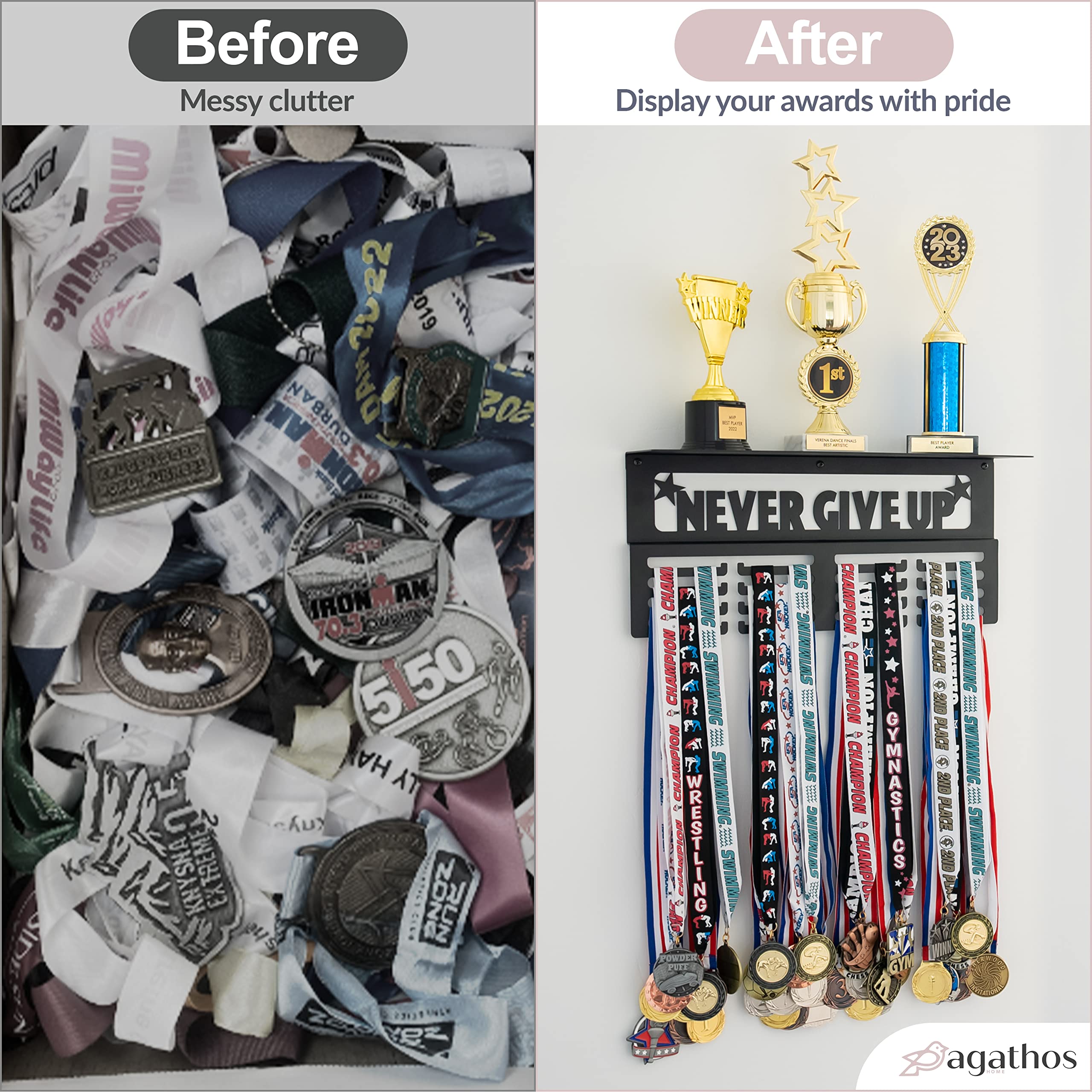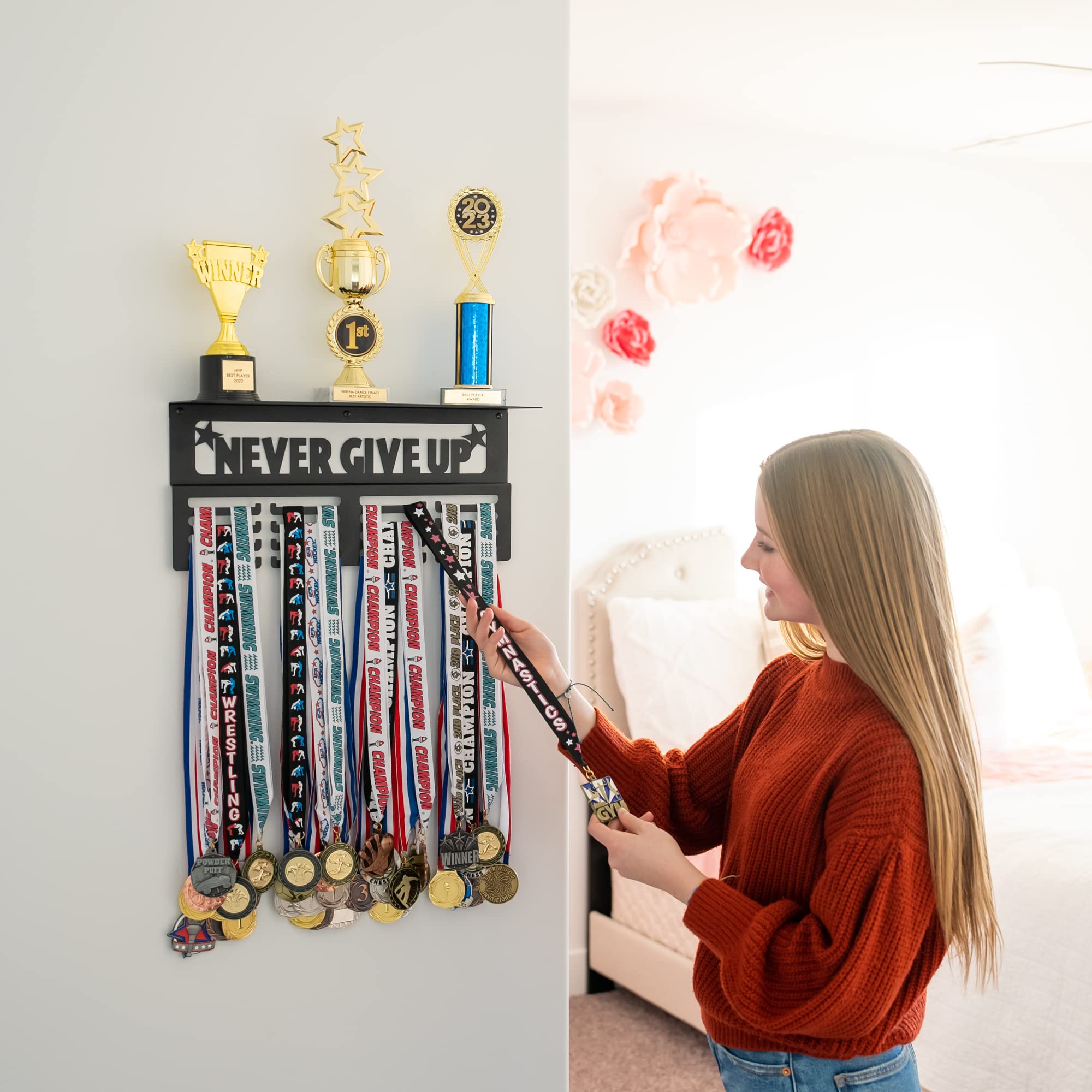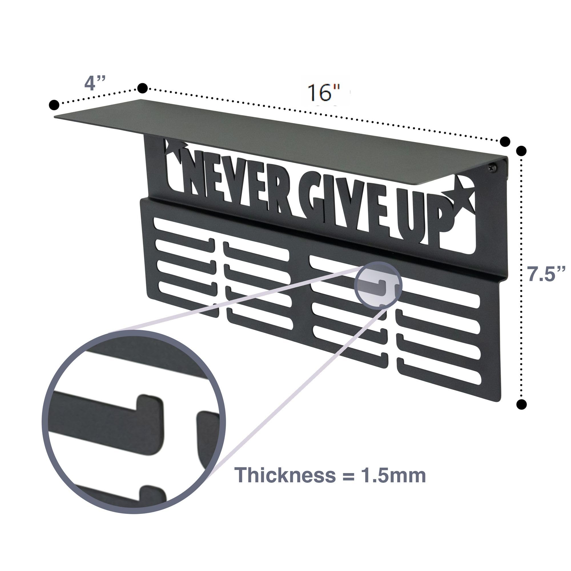 CREATE ART OUT OF YOUR SPORTS MEDALS: With our medal holder for wall, your child's (or yours) sports medals and trophies won't go missing or collect dust in a drawer or closet; The 'Never Give Up' trophy display shelf motivates you to keep pushing your limits and strive for greatness