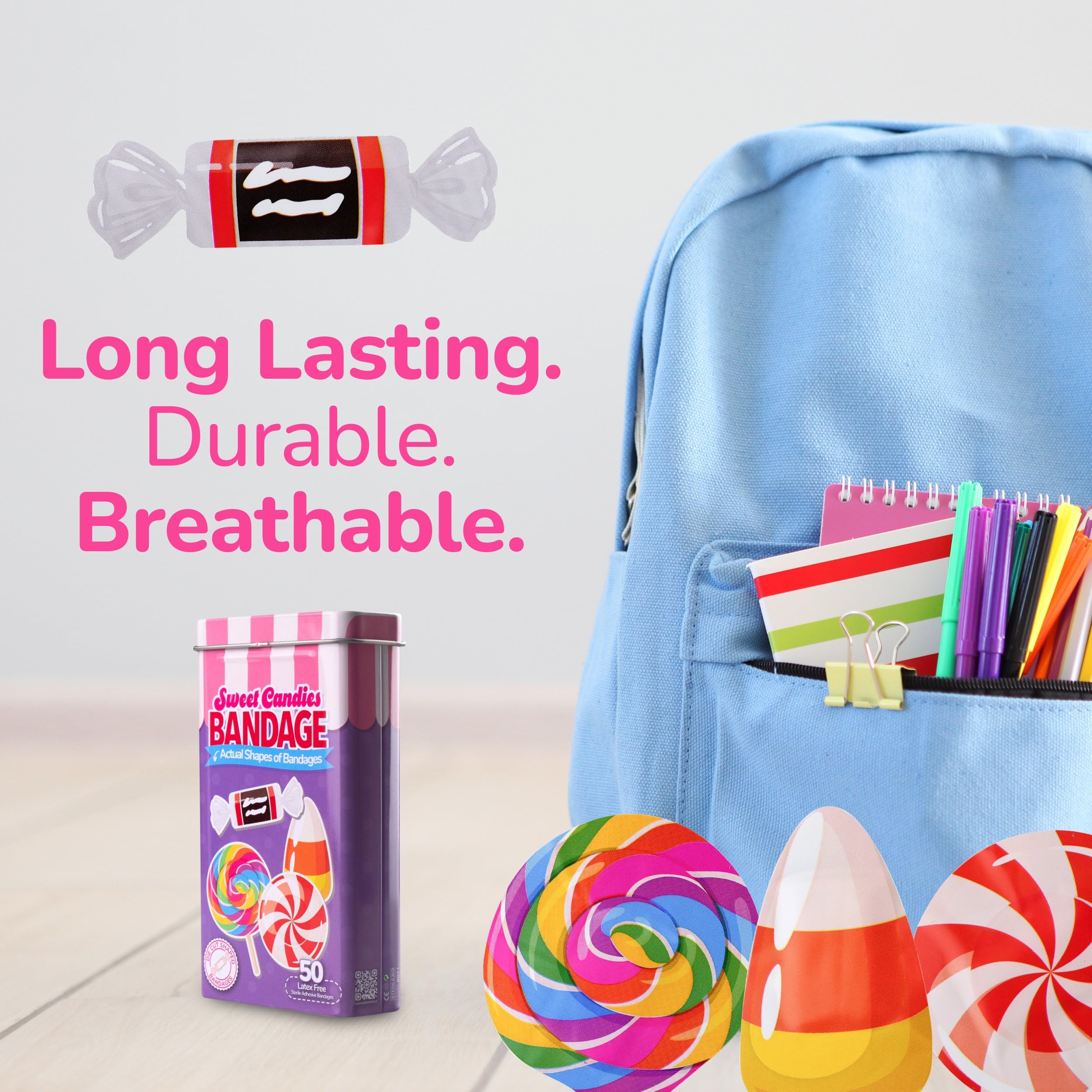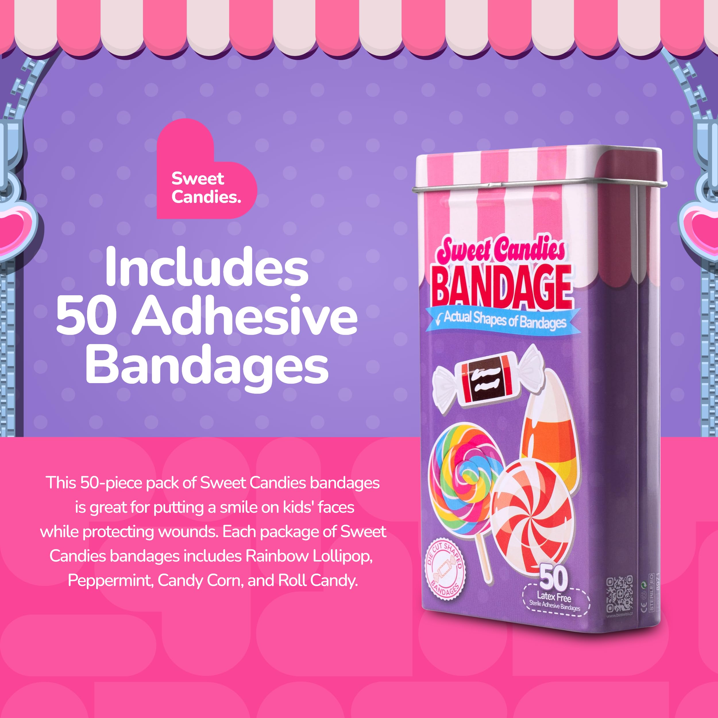 50 CANDIES KIDS BANDAGES: Fun candy-shaped adhesive bandages tin helps protect cuts, scrapes, and minor wounds while making healing less stressful for children; bandages come in 4 assorted styles