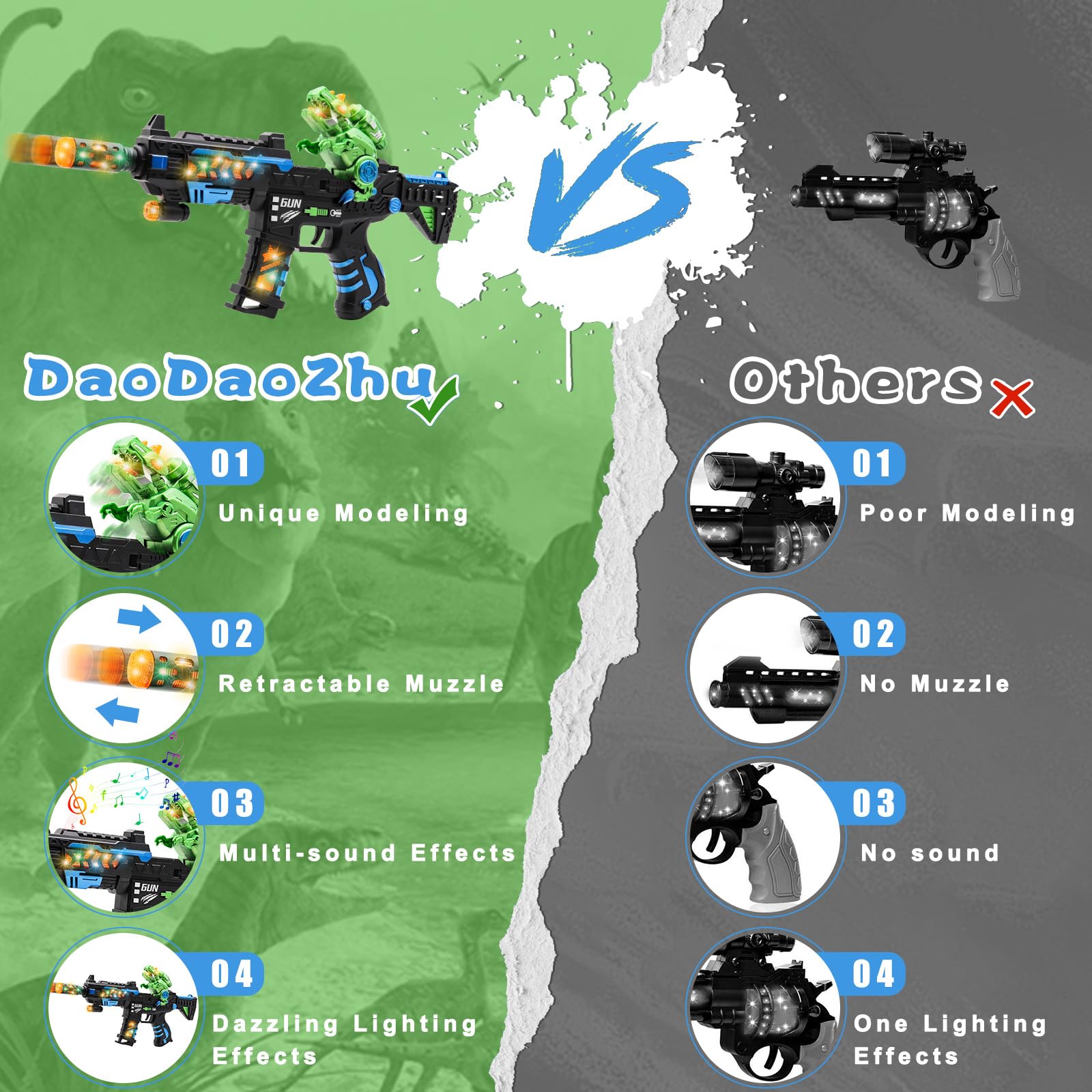 [Unique Liftable Dinosaur & Telescopic Barrel Action] This dinosaur light up toy gun features a unique barrel telescopic action. Pull the trigger, and the attached dinosaur figure rises and falls. This toy gun for kids arouses preschoolers' interest in prehistoric role-play and encourages active, imaginative play for 3 4 5 6 7 year old toddler boys. (Requires 3 x AA batteries, not included).