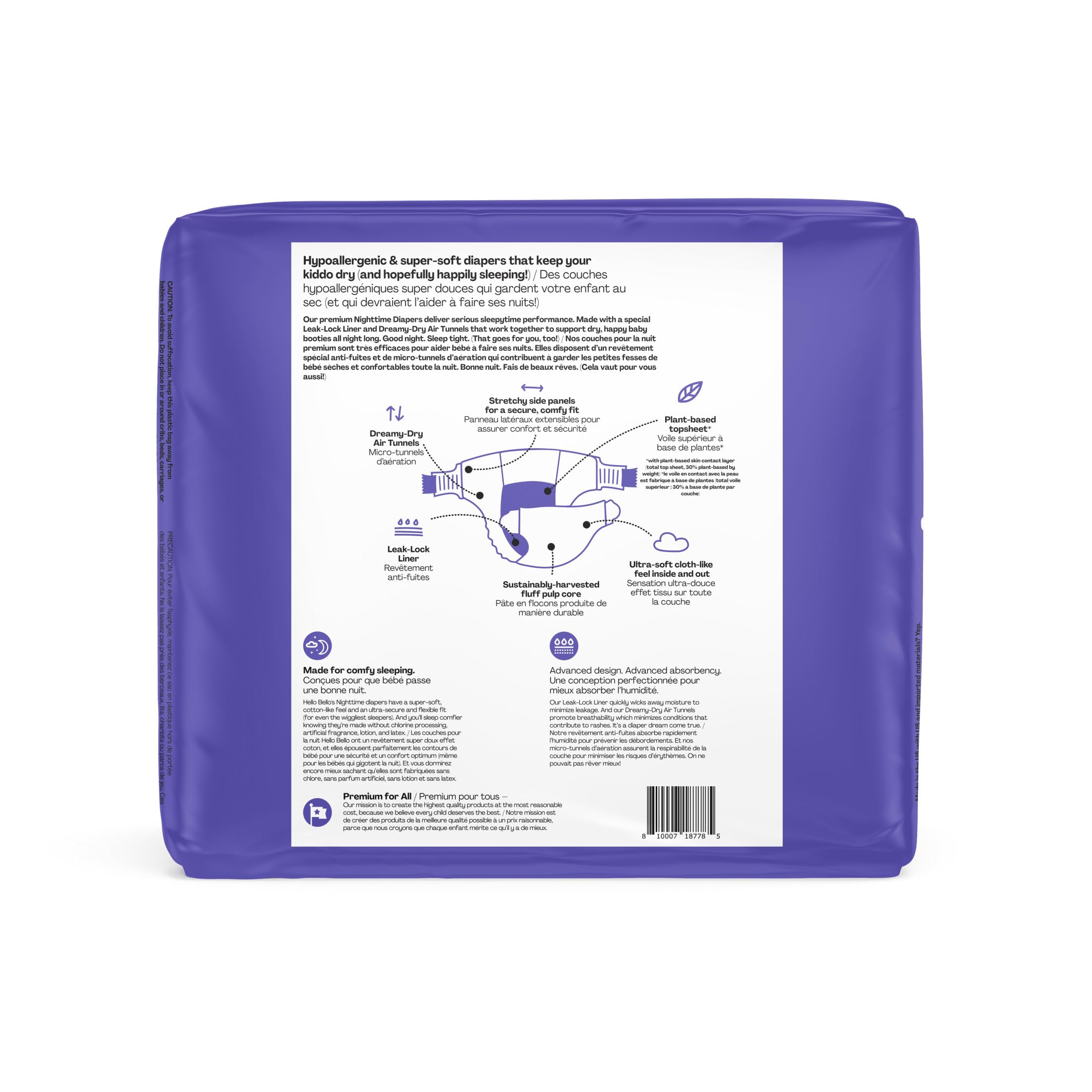 Our premium overnight diapers deliver serious sleepytime performance. Made with the same great materials as our original diapers, but bumped up in all the right ways for faster fluid intake, increased absorbency, and drier baby bums. Good night. Sleep tight. (That goes for you, too!)