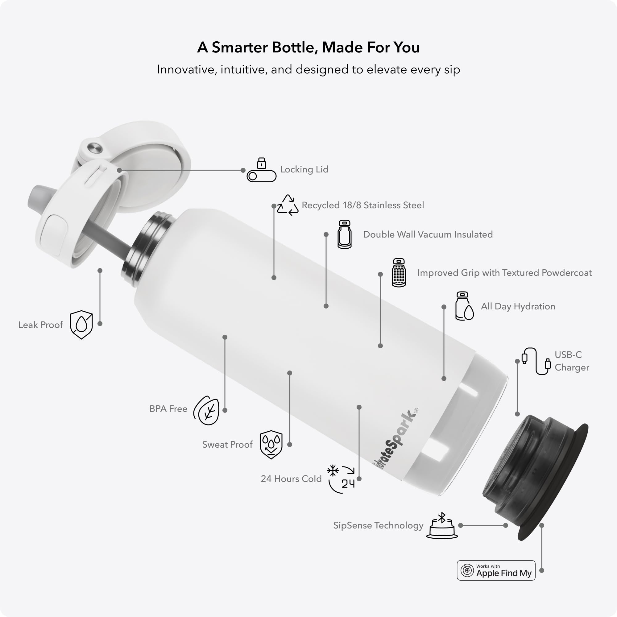 Stay hydrated like never before with the 32 oz HidrateSpark PRO 2, the world’s smartest water bottle made from premium recycled stainless steel. Double-wall vacuum insulation keeps your drink cold for up to 24 hours, while the SipSense Technology in the sensor tracks every sip and reminds you when it’s time to drink with a customizable 360-degree glow and optional sound alerts. Sync your water intake with the HidrateSpark App via Bluetooth to monitor your progress, set personalized goals, and even locate your bottle using Apple’s Find My Network. The large carry handle and narrow base make it cup-holder friendly and easy to carry wherever you go. Works with the chug or straw lid for ultimate versatility.