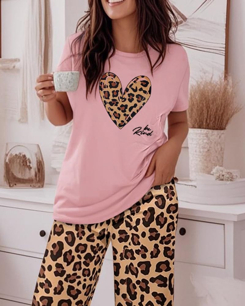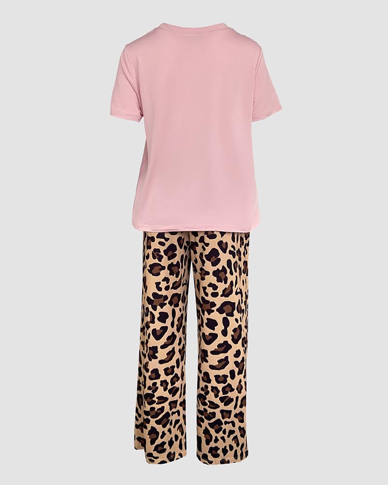 Chic 2-Piece Pajama Set – This loungewear set includes a short sleeve round neck top and wide-leg printed pants, combining comfort with casual style for everyday relaxation