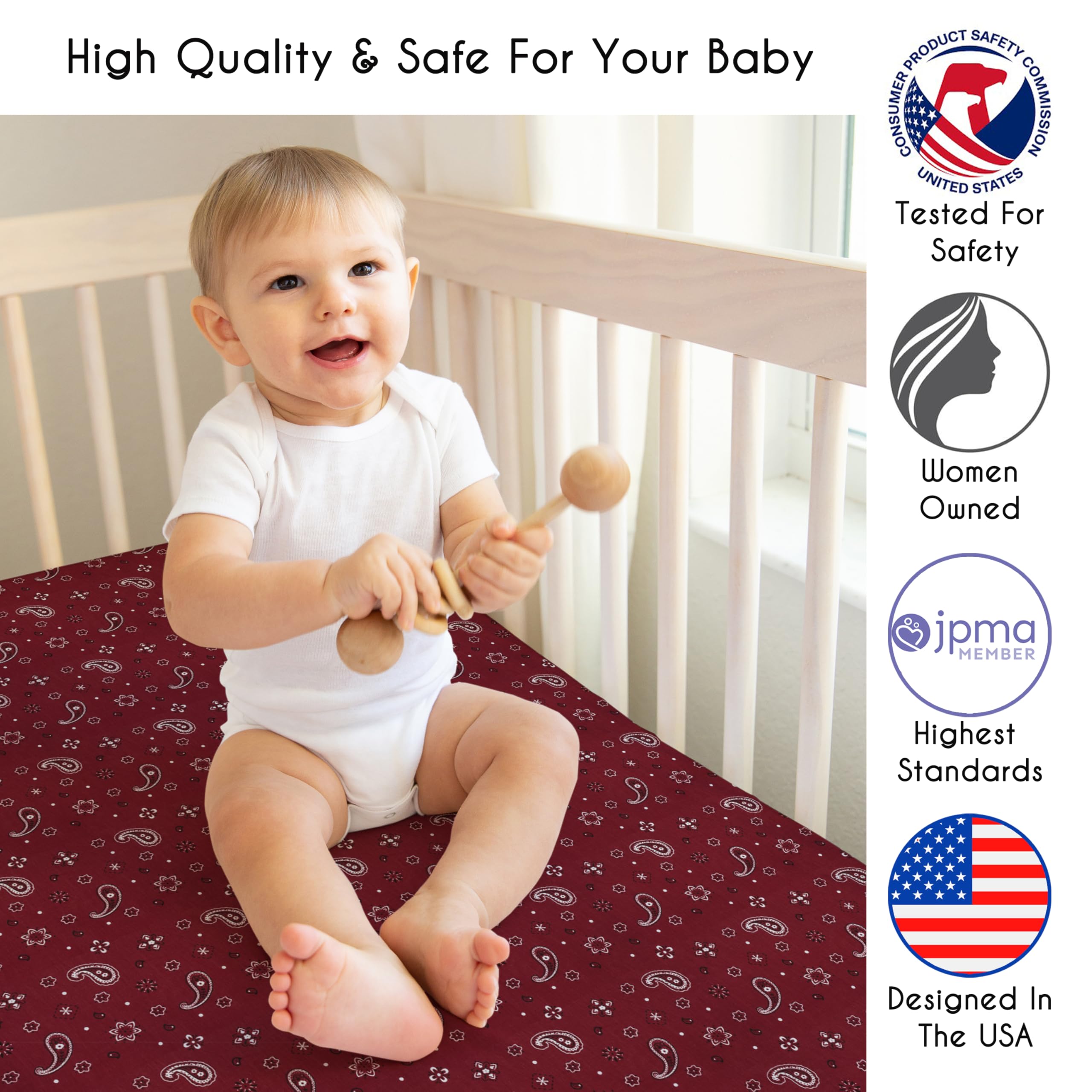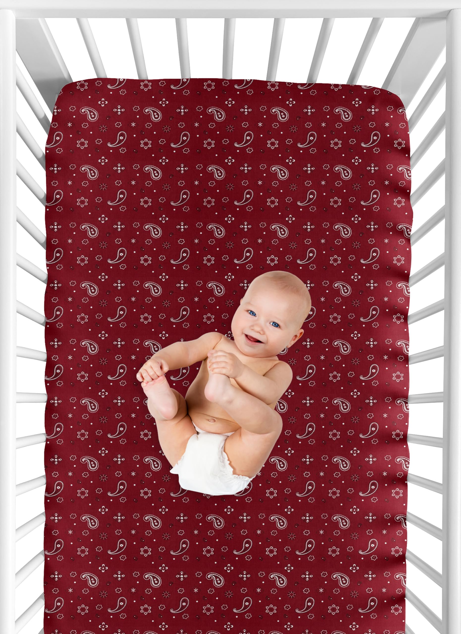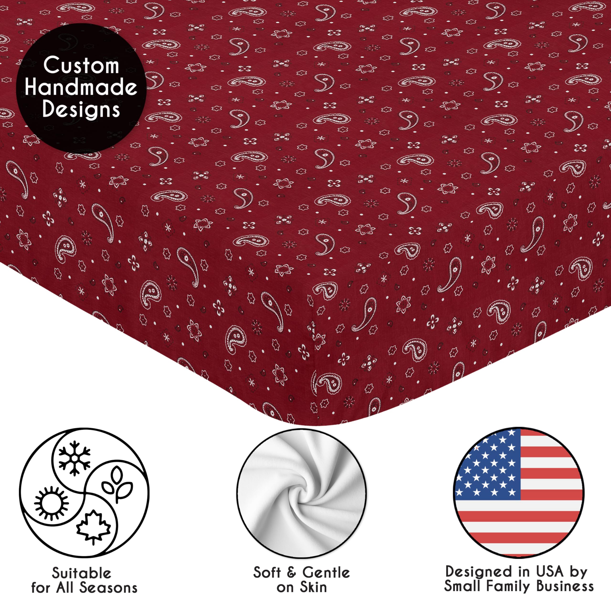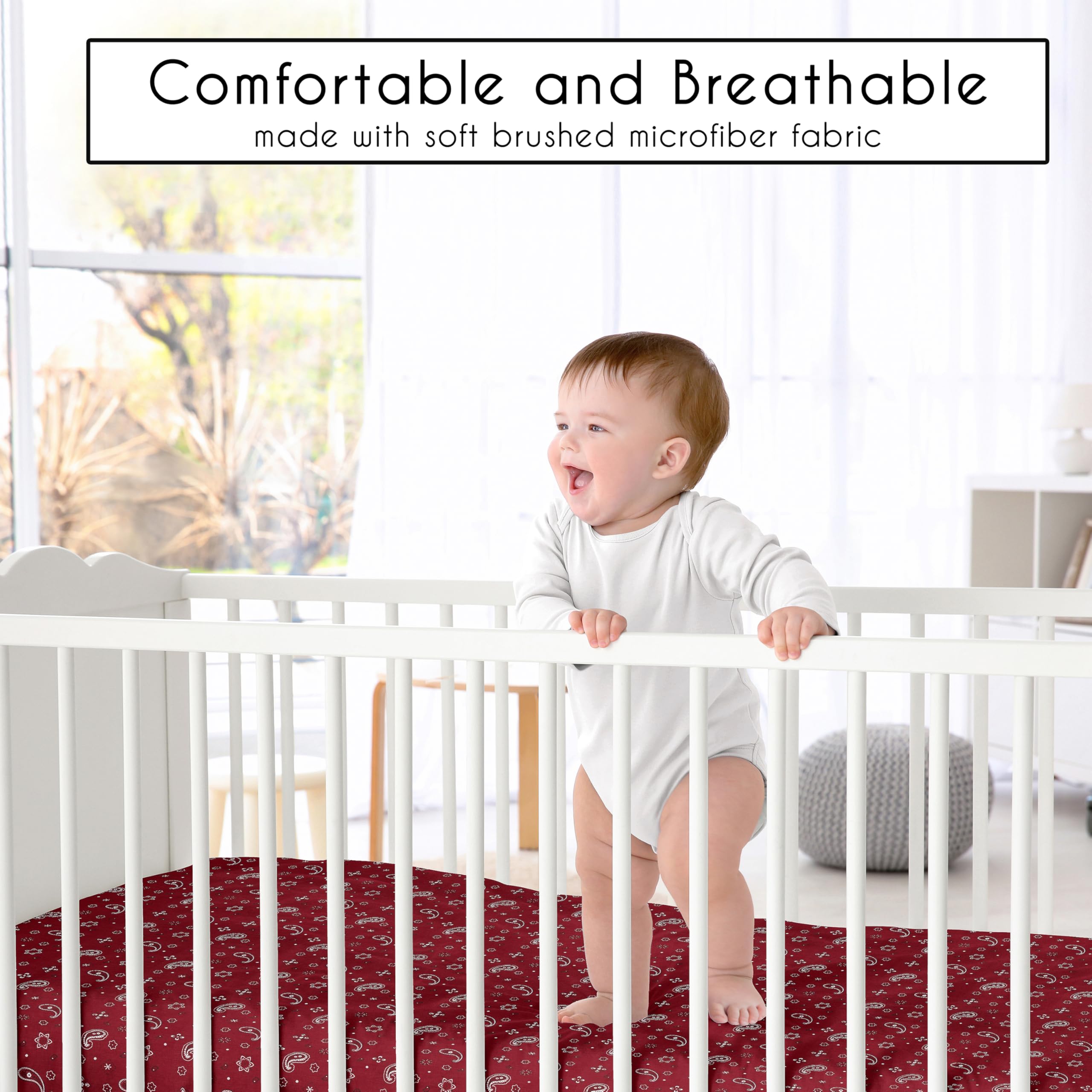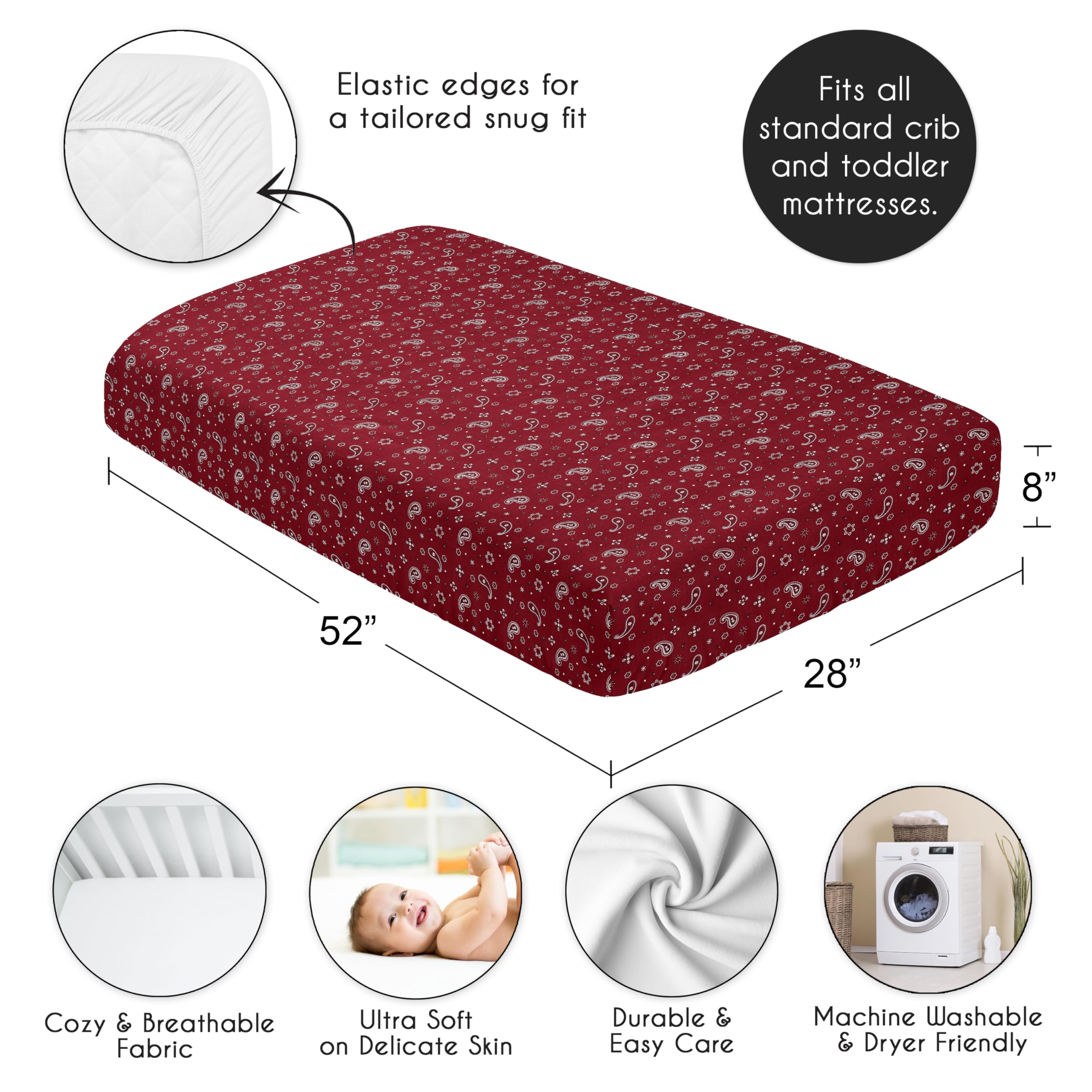 SNUG FIT: Includes (1) Fitted Crib Sheet 52in. x 28in. x 8in. Our newborn standard crib sheets fit snugly, with premium elastic sewn around the entire bottom edge for a secure fit on most standard sized cribs & toddler beds, to reduce shifting and bunching. This brushed microfiber crib sheet features an exclusive design of a red, black & white bandana paisley print for the western cowboy, southern charm, Wild West Collection & is gentle on delicate skin to foster a soothing sleep environment.