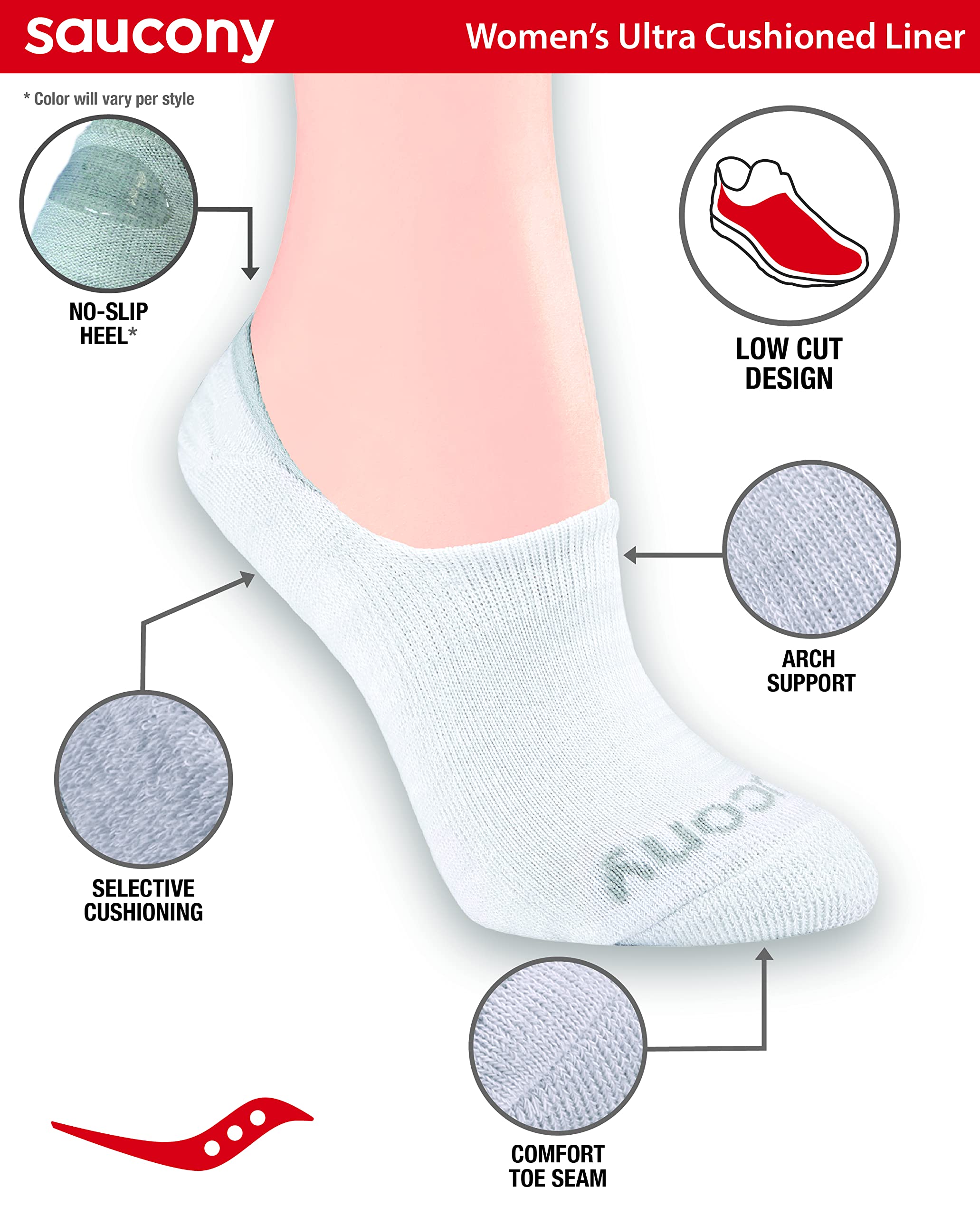 Description Saucony women's performance liner socks is a perfect combination of comfort, stay-put fit. Great for the toughest training session or when you just want comfortable Feet all day. Features include silicone heel grip for stay-put socks, arch support and select cushioning for lasting comfort, Comfort toe seam, and air mesh ventilation.