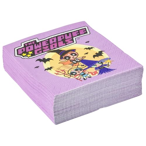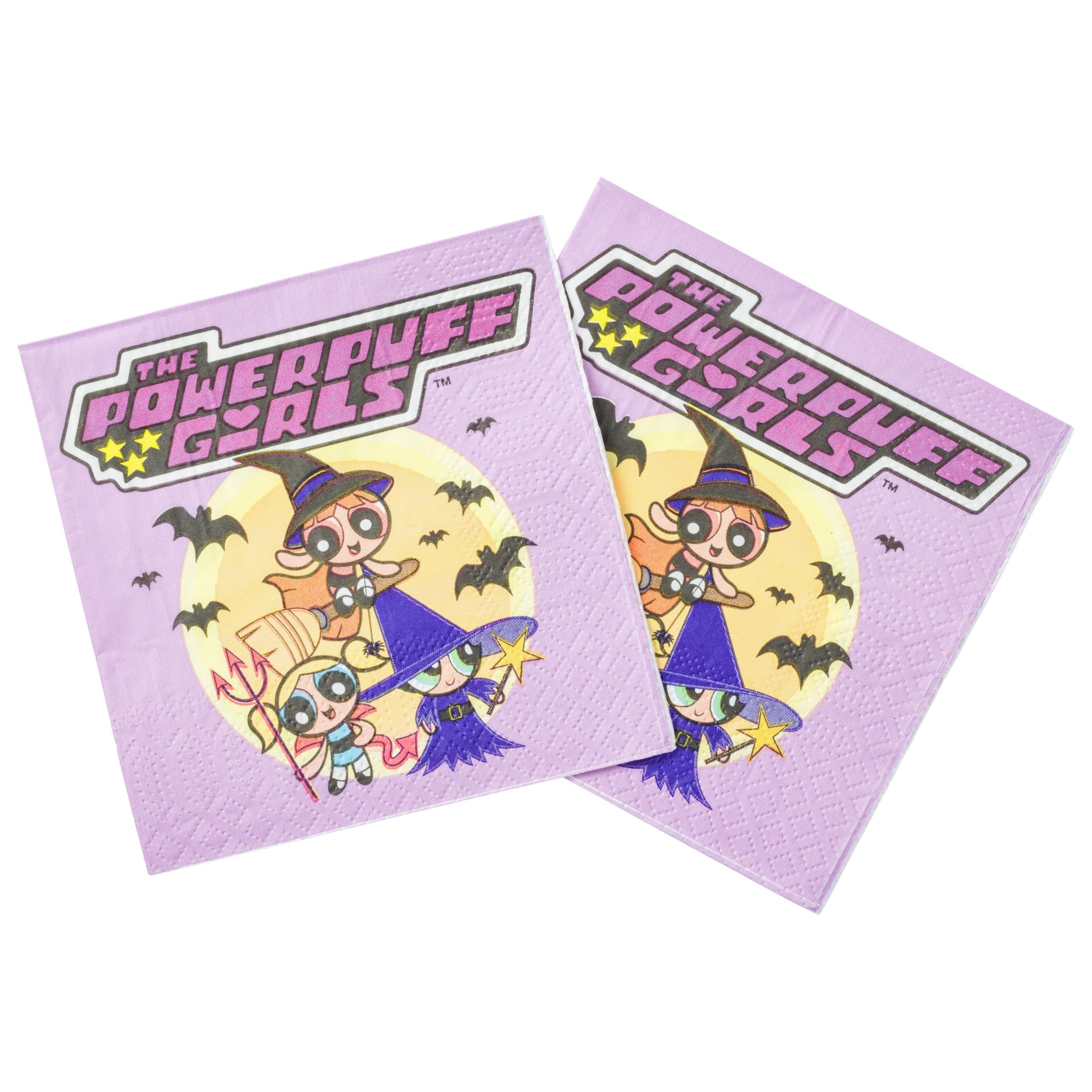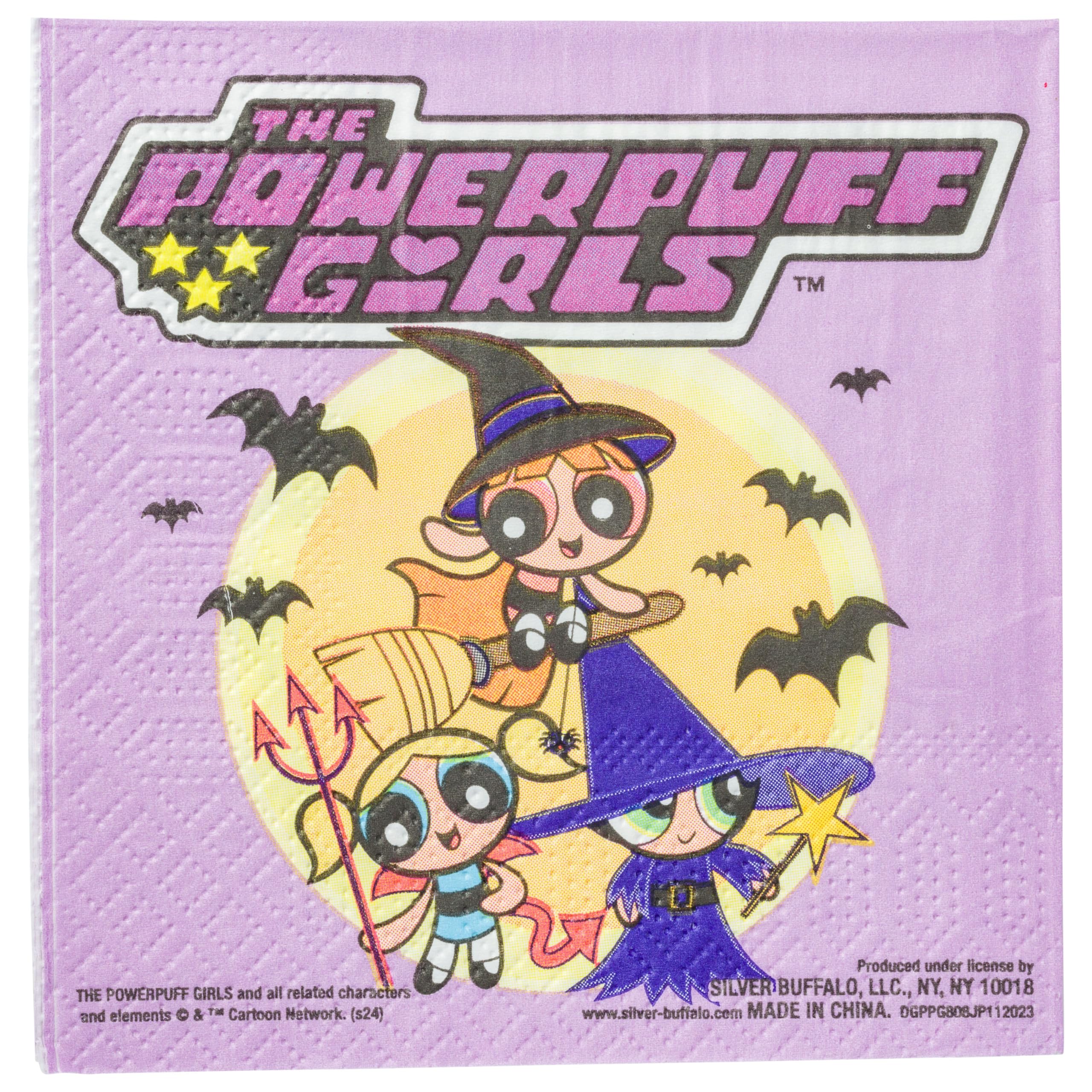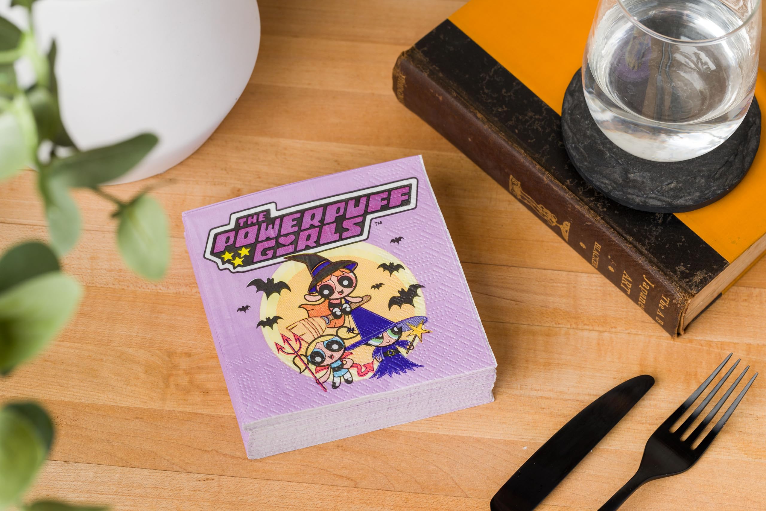 POWERPUFF GIRLS PARTY: Themed napkins feature Blossom, Bubbles, and Buttercup in Halloween costumes. The characters are featured against a full moon and are surrounded by bats. Written at the top of the napkin is “The Powerpuff Girls.” Napkins are purple.