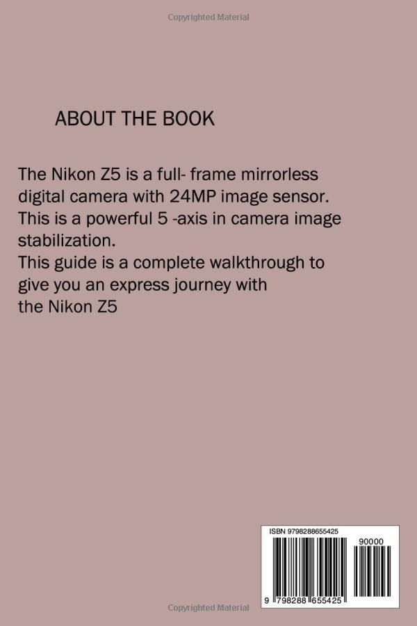 Unlock the Full Potential of Your Nikon Z5 with This Complete Walkthrough Guide! Are you new to the Nikon Z5 or looking to master its advanced features? This comprehensive guide for Nikon Z5 is your perfect companion. Whether you’re a beginner eager to take your first stunning shots or an enthusiast aiming to sharpen your skills, this book walks you through every function, setting, and creative technique the Nikon Z5 offers. Inside, you’ll discover: Clear explanations of camera controls, dials, and menus How to optimize settings for portraits, landscapes, action shots, and low-light photography Step-by-step guidance on 4K video recording and editing Tips for using lenses and accessories to enhance your photography Proven techniques for post-processing and editing your images Written in an easy-to-understand style, this guide makes the powerful features of the Nikon Z5 approachable and fun. You’ll quickly move beyond automatic mode and gain confidence in manual shooting, creative modes, and professional-quality results. Perfect for photographers at any level—whether you just unboxed your camera or want to elevate your photography skills—this book will help you turn your Nikon Z5 into a creative powerhouse. Take control of your camera. Start capturing breathtaking photos and videos today with the GUIDE FOR CAMERA NIKON Z5: Complete Walkthrough Guide.