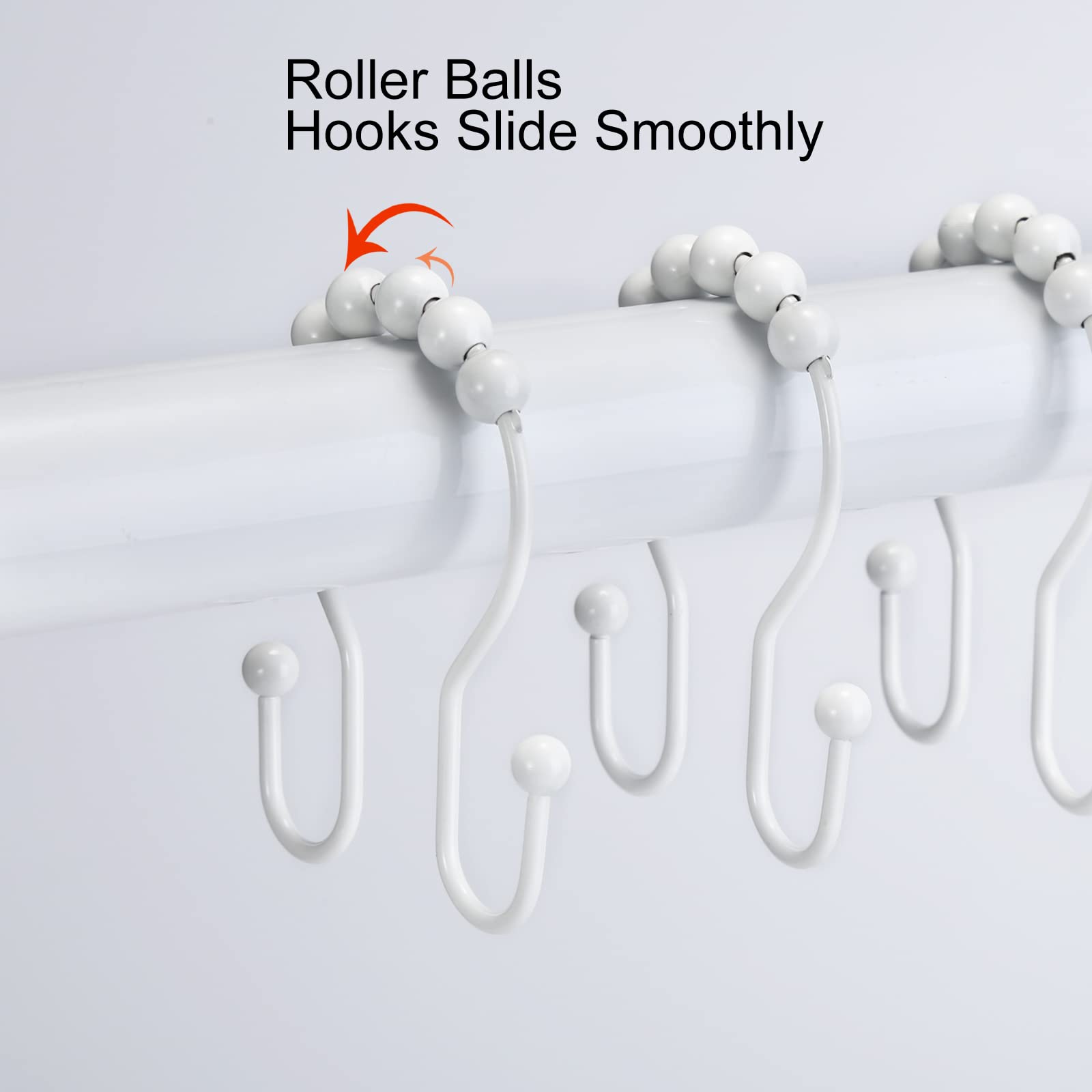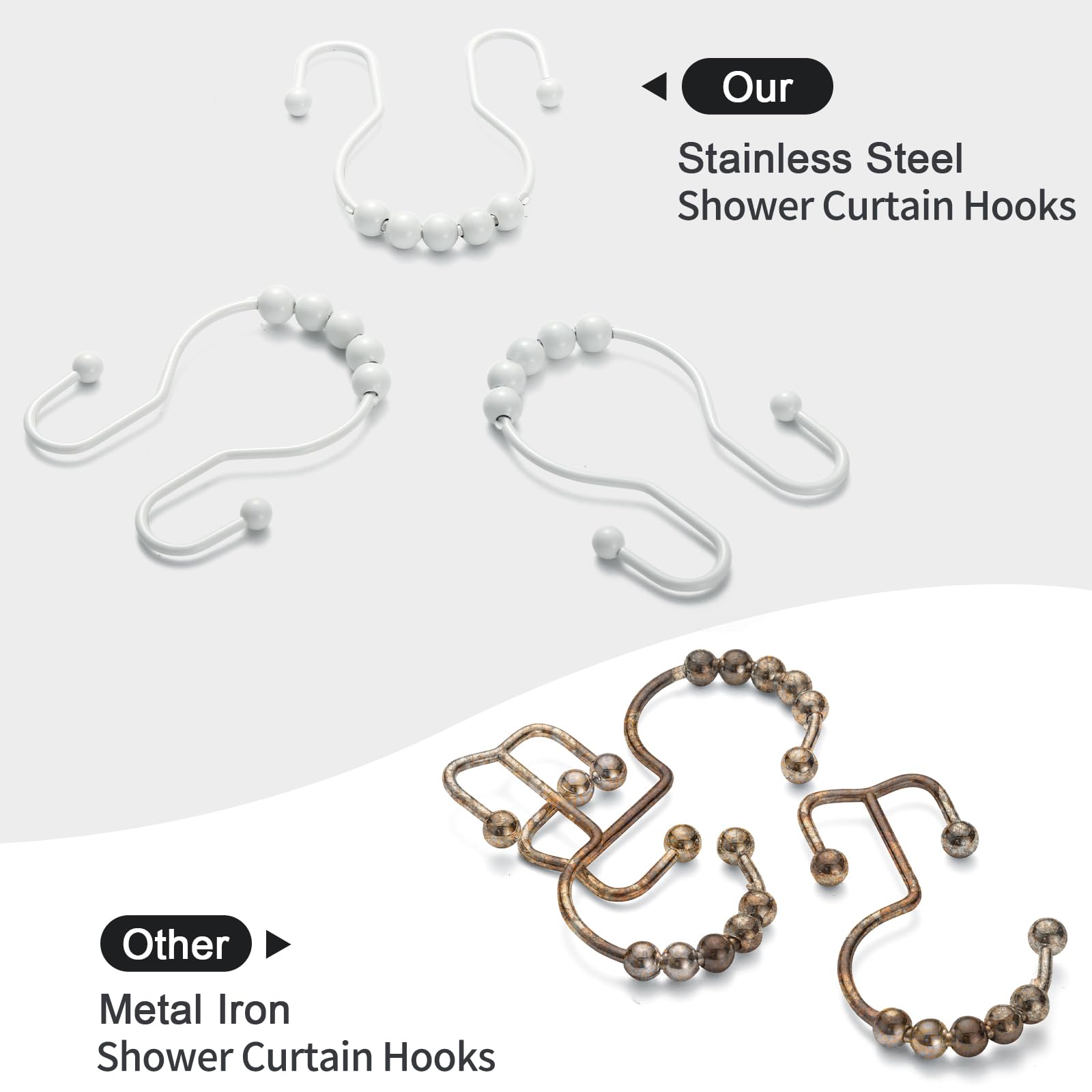 [DOUBLE SHOWER CURTAIN HOOKS]: The shower curtain rings rust proof are made of exquisite craft. The obstacle on both sides fix the roller balls to keep balance, which prevents the shower curtain from falling off, it's strong enough to hold both the heavy curtain and liner.