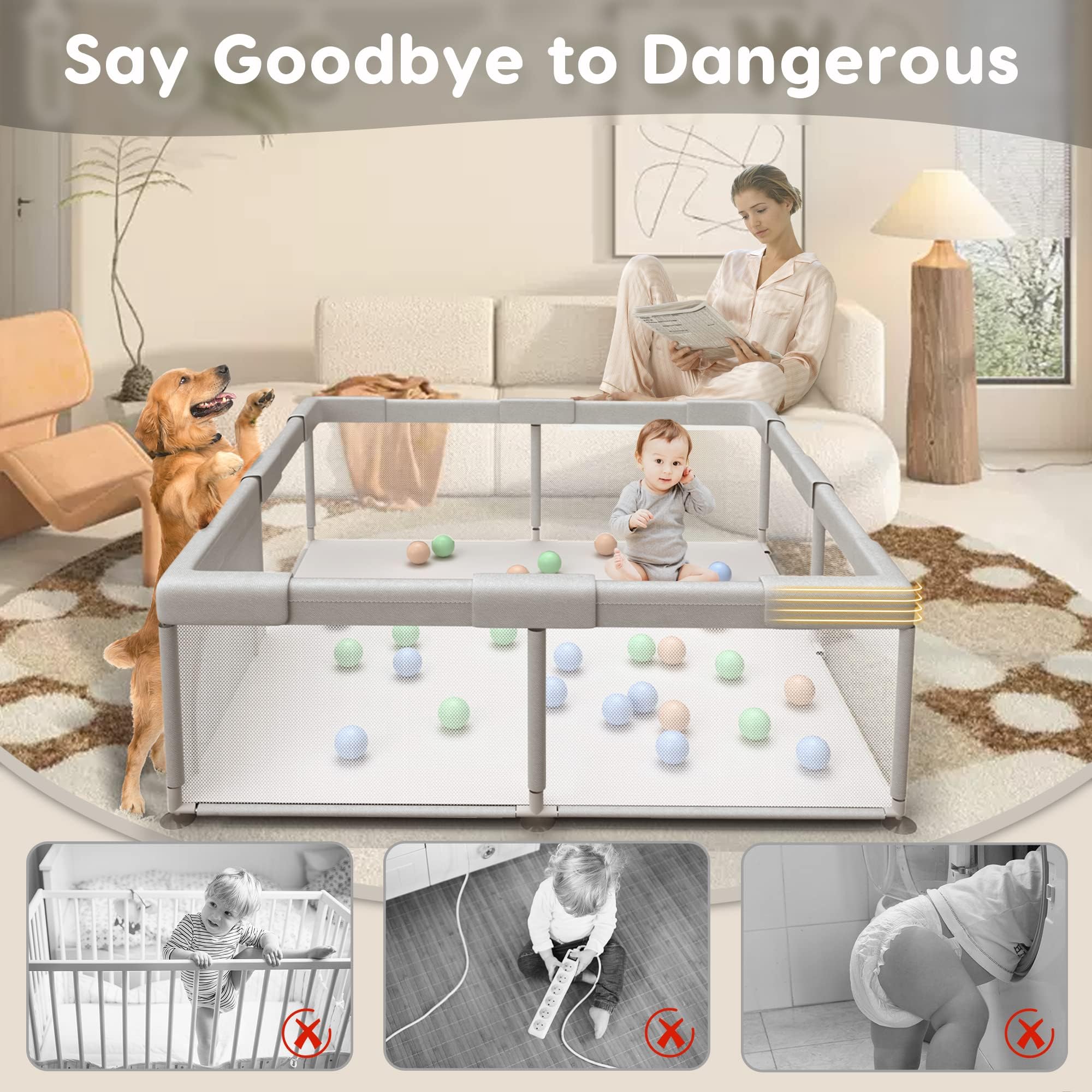 【Easy to Assemble】Our baby play area is connected by alloy steel pipe and ABS plastic joint, which is easy to disassemble and assemble by one person without any tools.The play pen is easy to clean, just wipe it with a damp cloth. It's perfect for busy parents who need a safe space to keep their baby entertained while they work or relax.