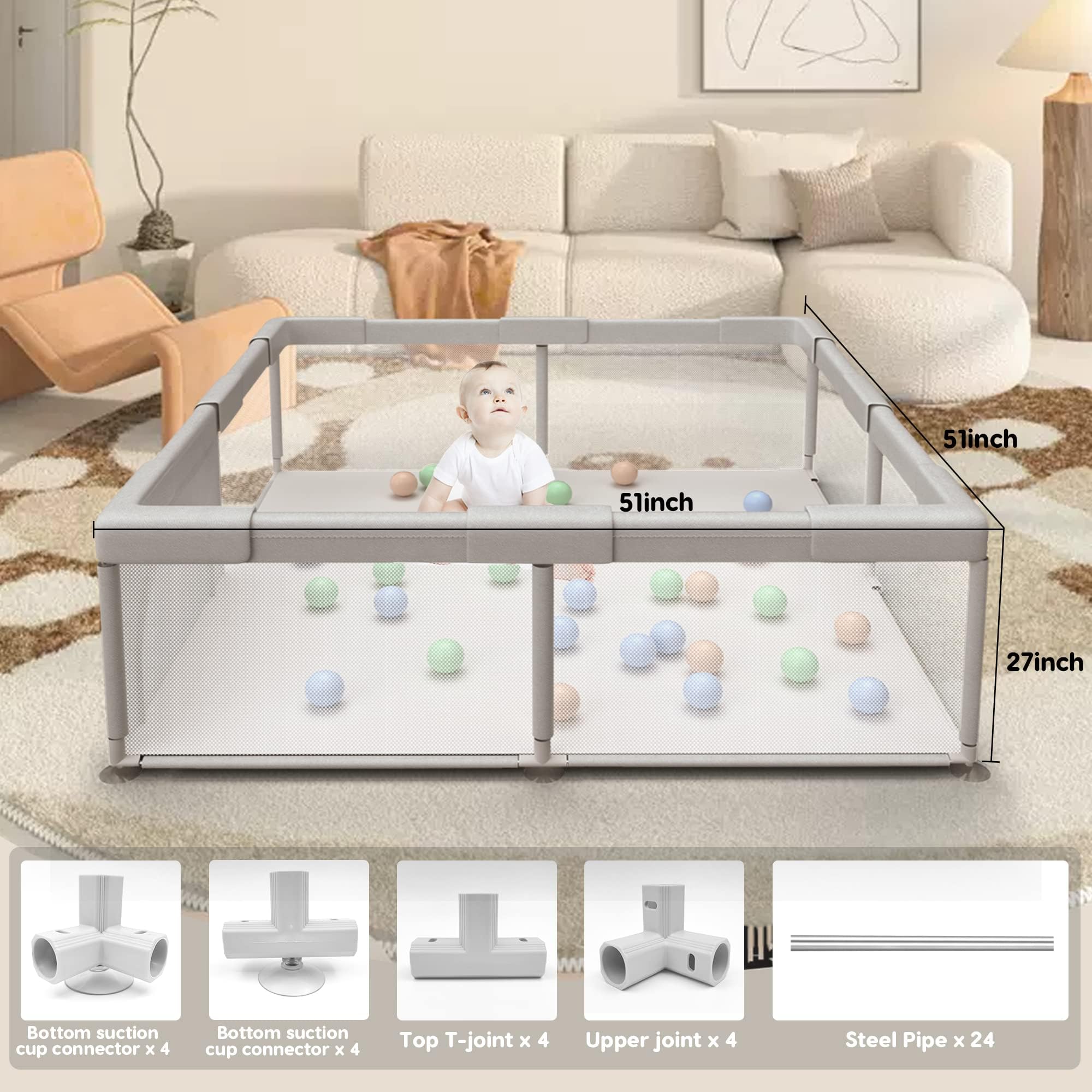 【Large Play Space】This baby playpen provides a large 51*51 inch play area for babies and toddlers, giving them enough space to play, crawl, and explore freely. Scientific height design helps baby to train stand and walk.