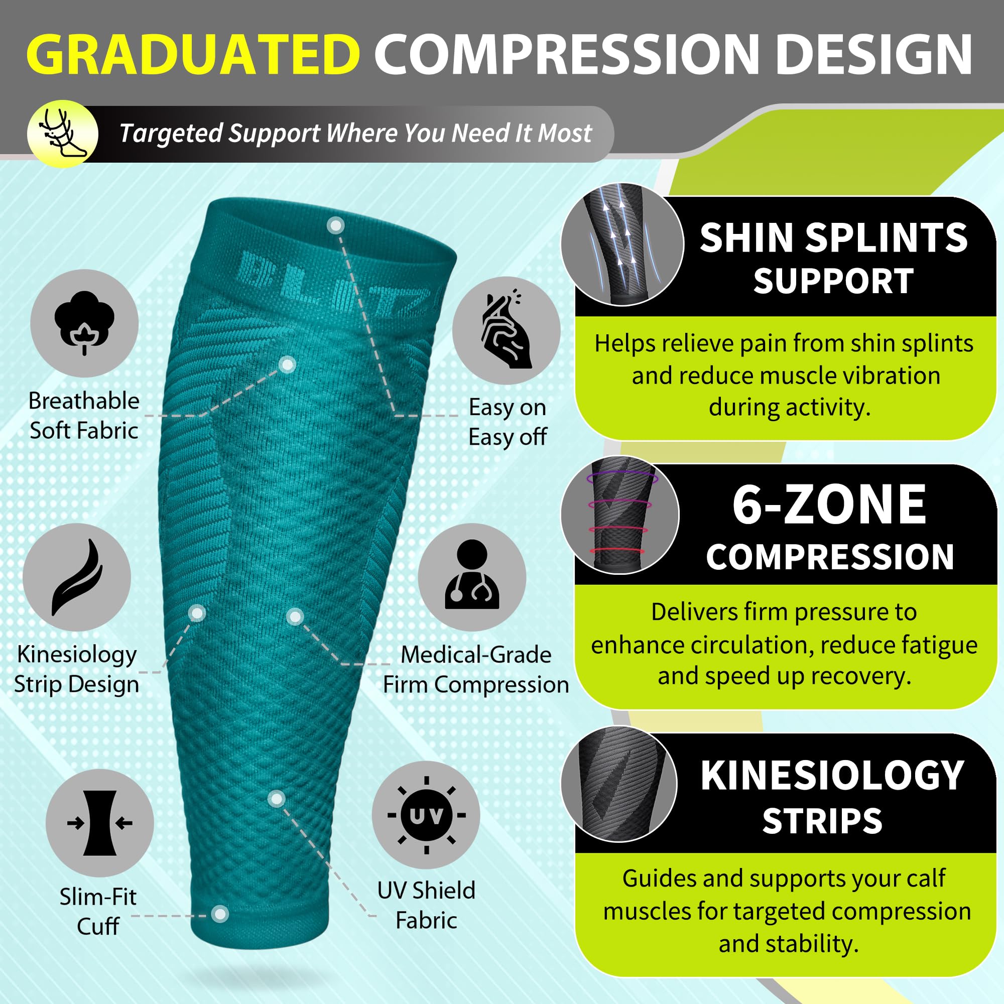 Patented Kinesiology Strips for Targeted Pain Relief: Developed and patented in New York, our calf compression sleeves incorporate advanced kinesiology strips that provide superior support, stability, and pain reduction. Designed using the renowned kinesiology technique, these strips promote natural pain relief and accelerate recovery by improving muscle function and reducing fatigue.