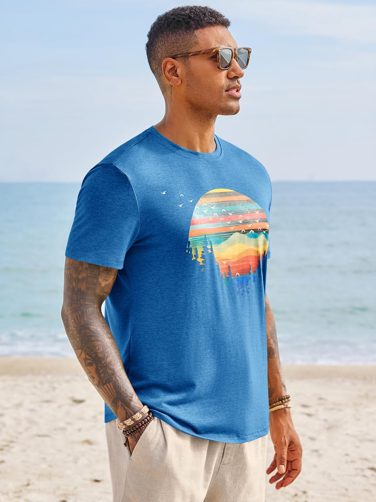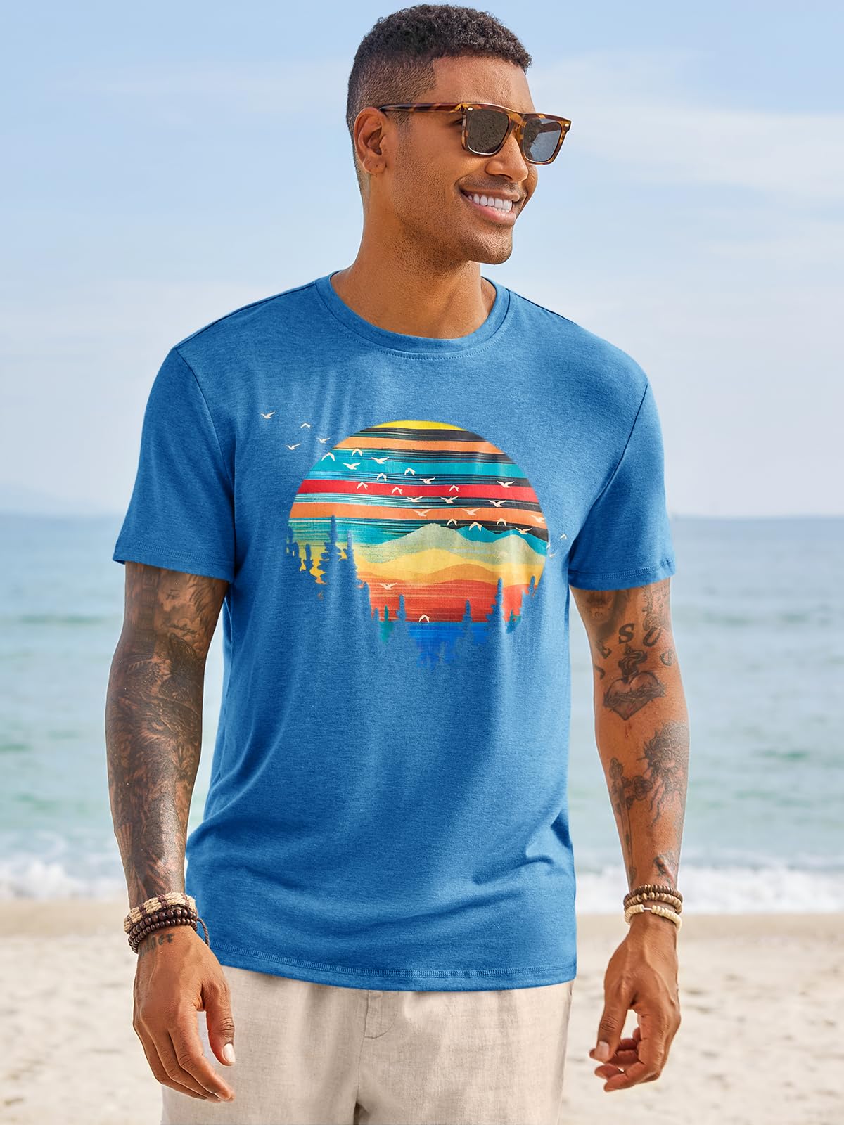 【Features】: Mens summer tshirts are feature with short sleeve, round neck, solid color with geometric nature sunset printed, that add a timeless and versatile style to these t-shirts, and loose fit style give you more relaxed and freedom